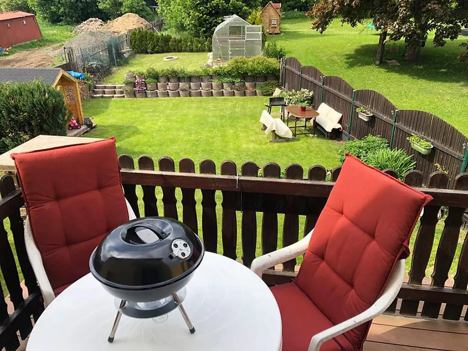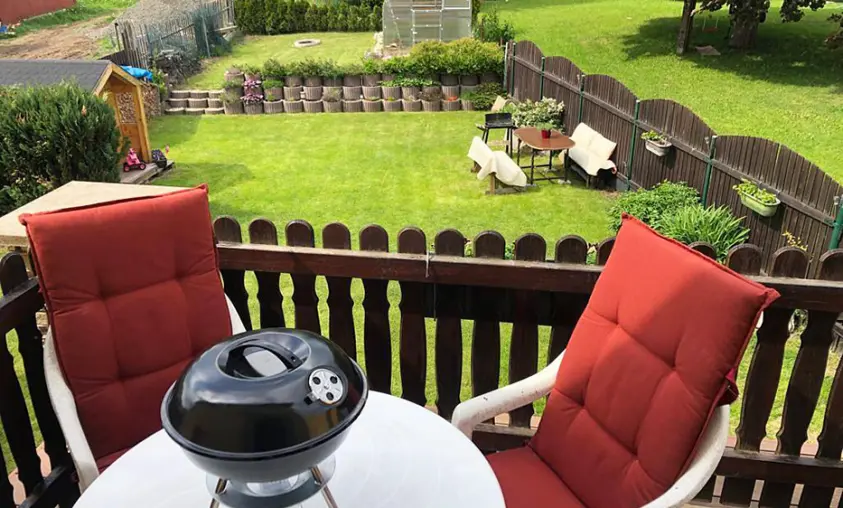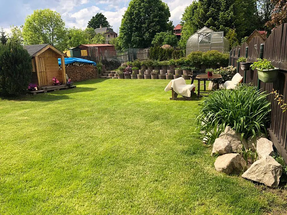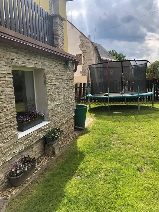 Upravená zahrada - posezení, gril, ohniště, trampolína, možnost uschování kol a lyží