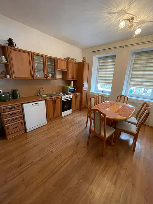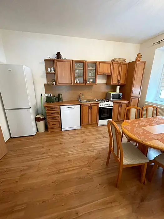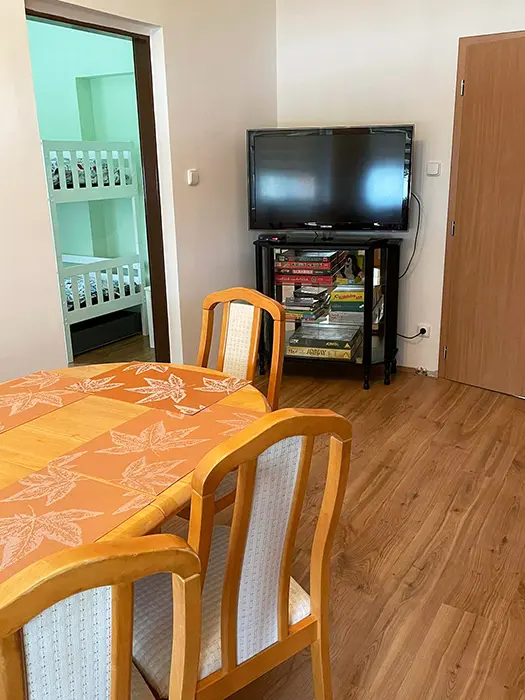 Prostorná obytná kuchyně - velký jídelní stůl a židle, LCDTV, lednička, myčka, sporák, mikrovlnka, varná konvice, nádobí. 2 ložnice - 2x4 lůžka ( v každé manželská postel + palanda ). Soc. zařízení - koupelna s vanou, umyvadlo + WC. Topení - plynové