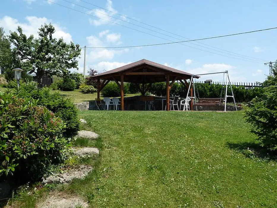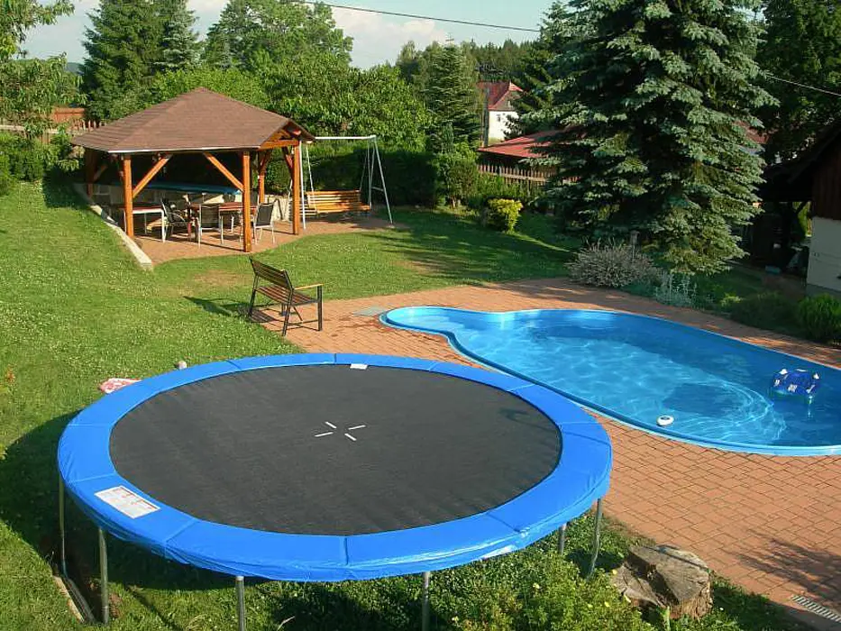 Zahradní posezení, altán, houpačka, pískoviště, venkovní krb a gril, trampolína, stolní tenis, kryté sezení, zapuštěný bazén 3,5 x 6 m