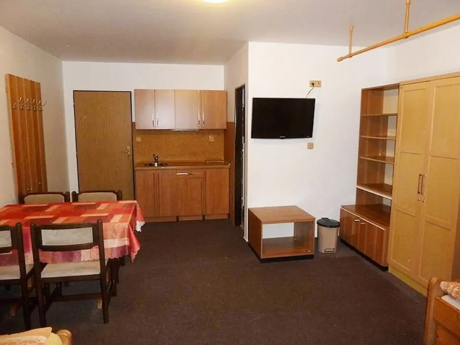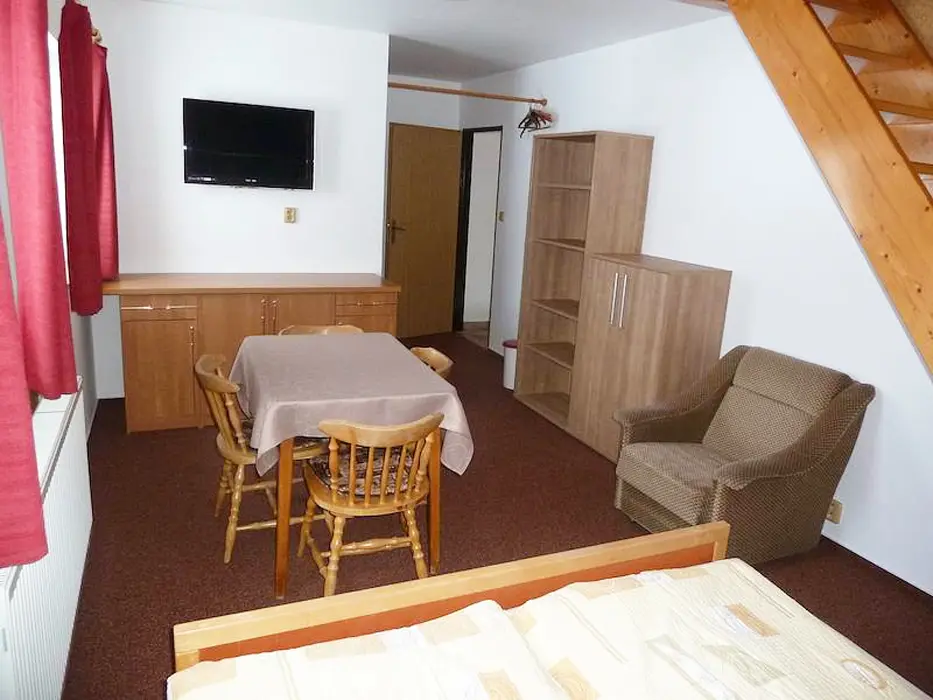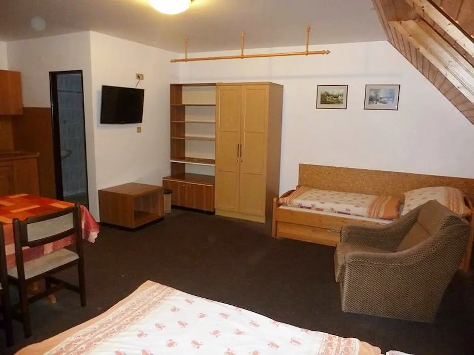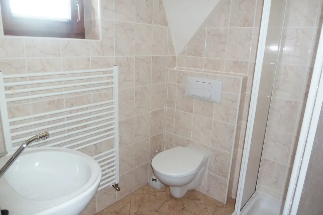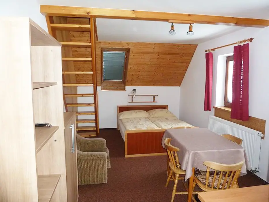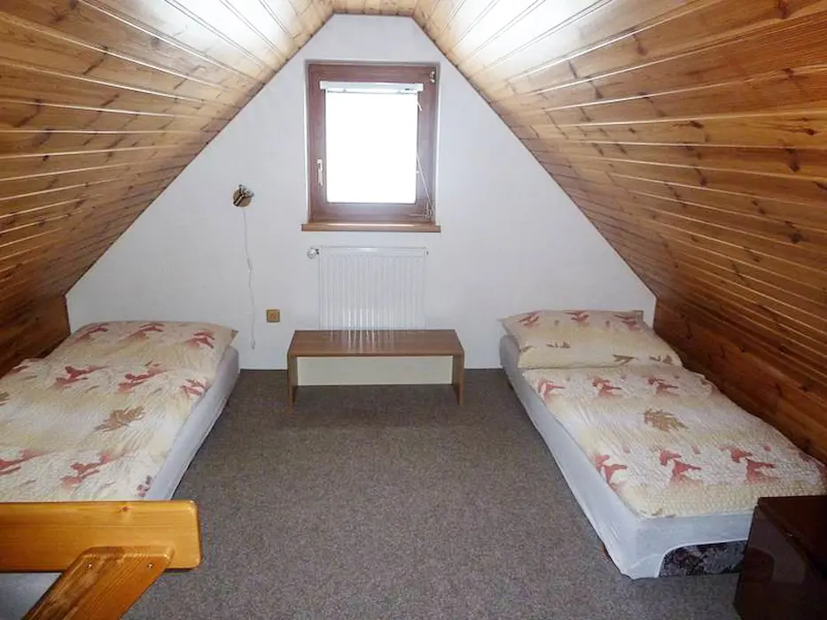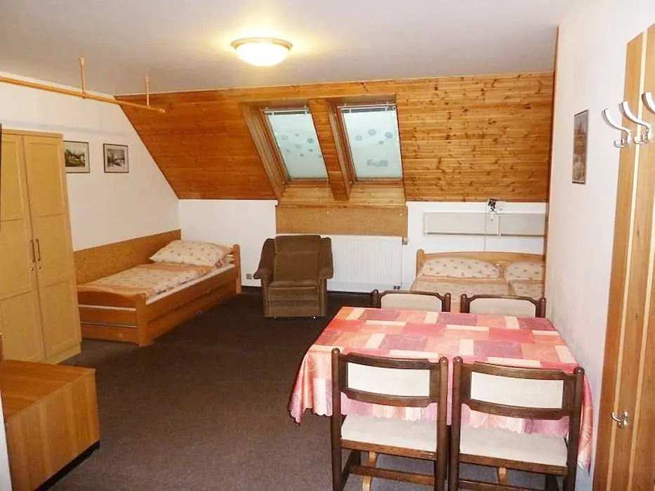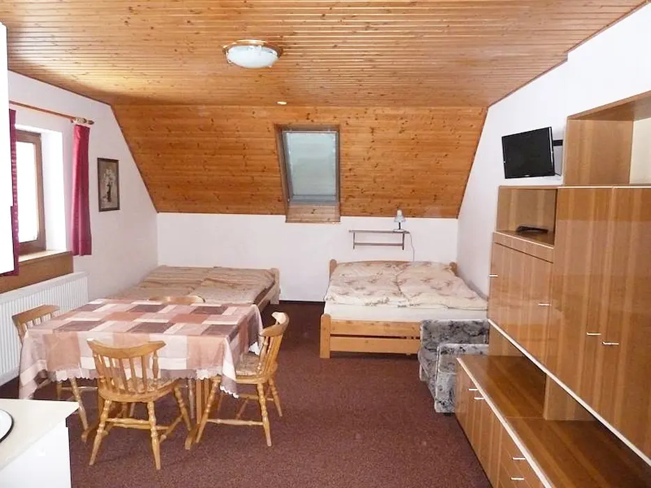 Společenská místnost s posezením - TV, CD, rádio, vybavená kuchyně - 2x lednice s mrazákem, mikrovlnná trouba, rychlovarná konvice, plynová 4 - plotýnková varná deska, nádobí. 4 ložnice - 1x3, 3x4 lůžkové, jedna ložnice je v přízemí, ve dvou jsou malé kuchyňky. Dětská postýlka - za 150 Kč/pobyt. Každá ložnice má vlastní soc. zařízení - sprchu + WC. Topení - centrální plynové