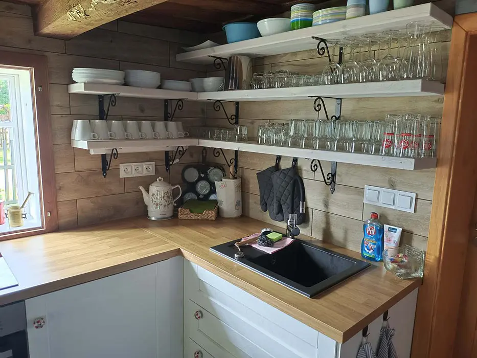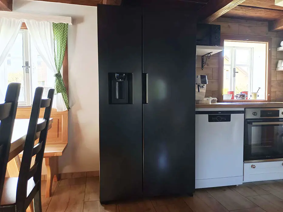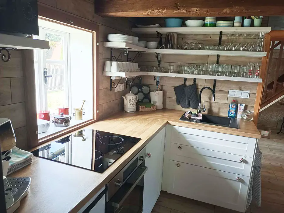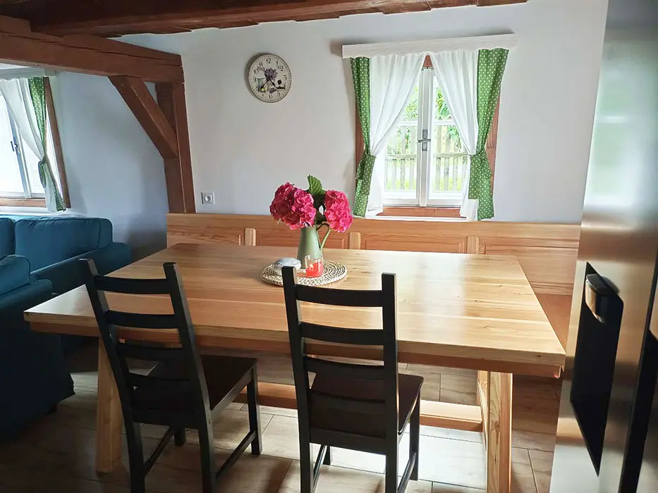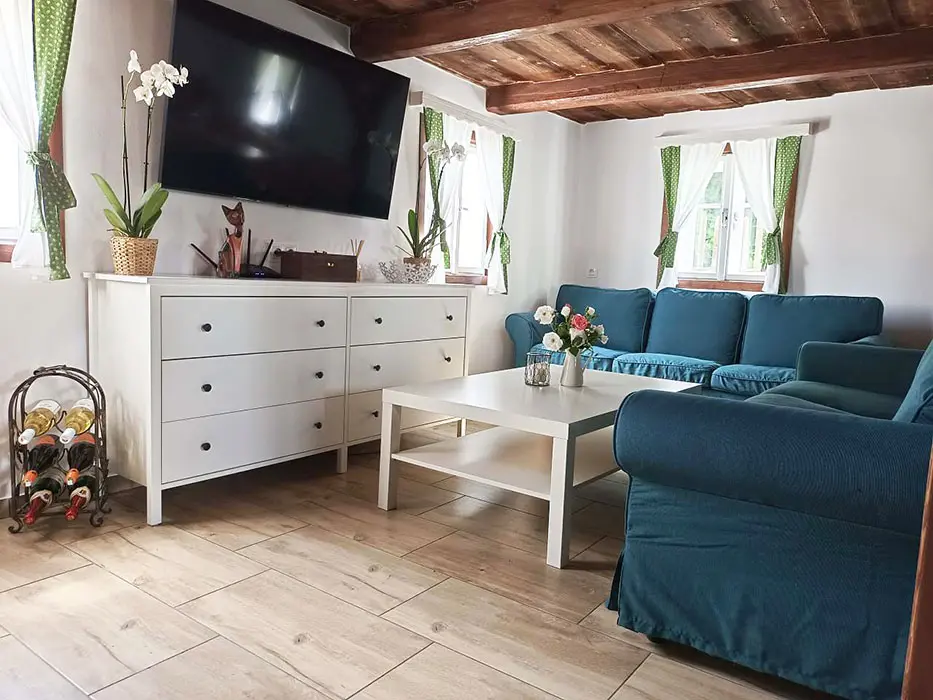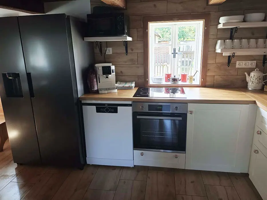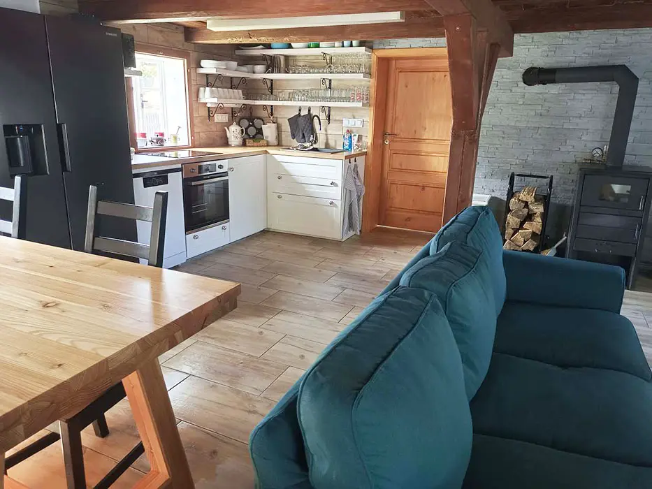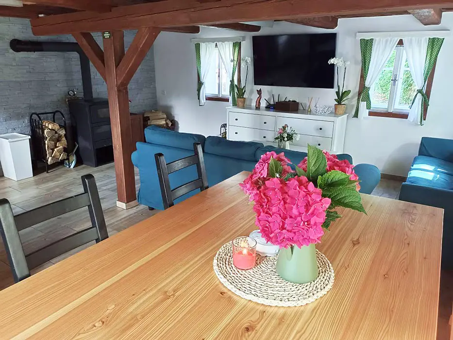Prostorná obytná část spojená s kuchyní - sedací souprava, krbová kamna, LCDTV, jídelní stůl a židle, vybavení kuchyně - indukční varná deska, el. sporák, americká lednice s ledem a filtrovanou vodou, mrazák, kávovar s čerstvě namletou kávou ( zásoba kávy ), varná konvice, mikrovlnná trouba, myčka ( tablety do myčky ), nádobí. 3 ložnice - 1x3, 2x4 lůžka. Soc. zařízení - v přízemí 2 koupelny - v každé sprchový kout, pračka, 2x WC ( v přízemí a v patře ). Topení - krbová kamna s výměníkem na dřevo ( zdarma )