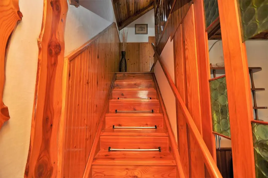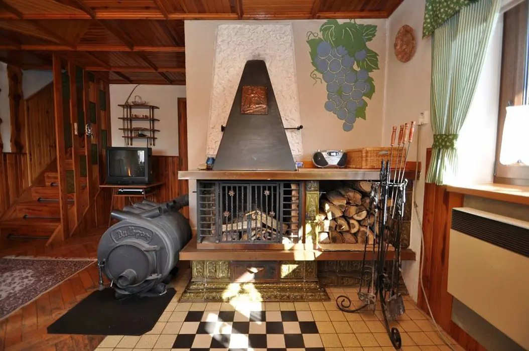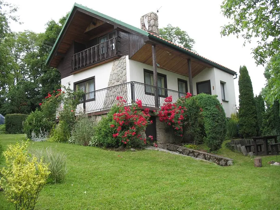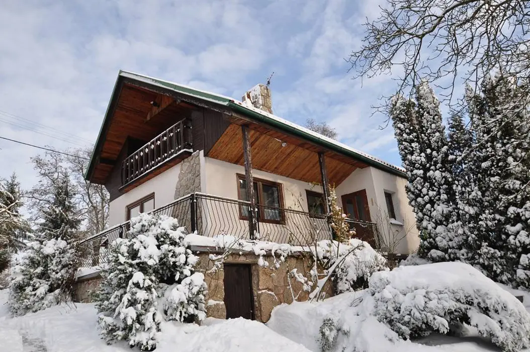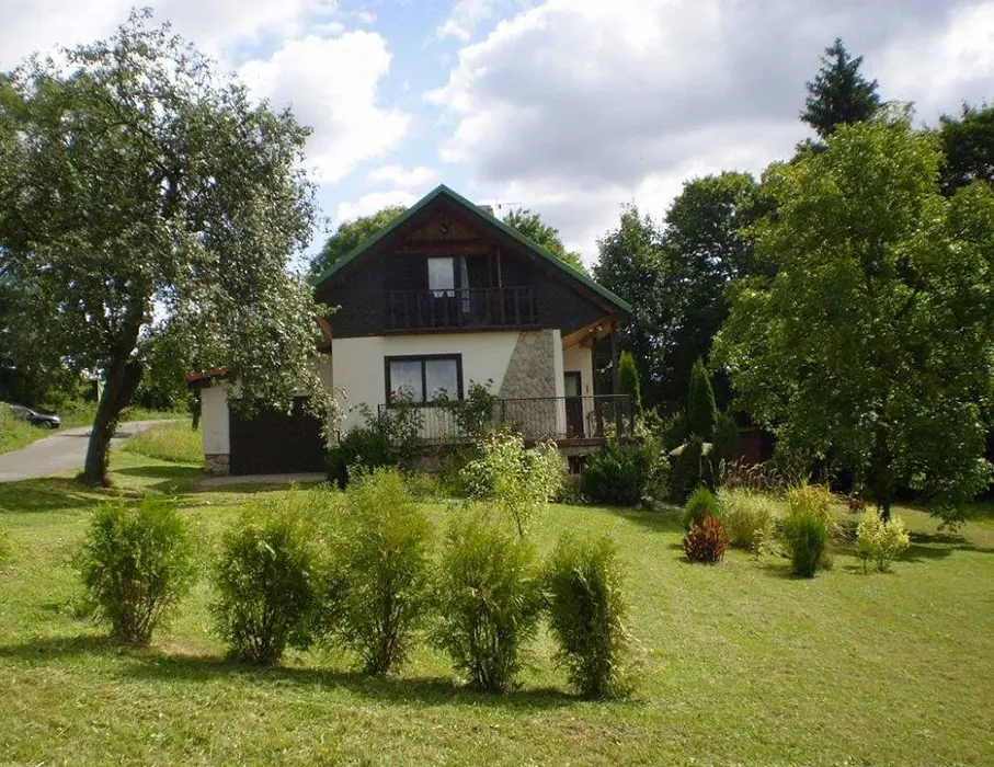 V přízemí - malá veranda a vstupní chodba, obytná část - posezení u krbu, jídelní stůl a židle, TV, spojená s kuchyňským koutem - el. vařič, mikrovlnka, kávovar, toustovač, varná konvice, lednička (250 l + mrazicí přihrádka), nádobí. V patře 2 ložnice - 1x2 lůžka + postýlka ( za poplatek 300 Kč ), 1x2 lůžka + rozkládací gauč - 1,5 lůžko. Soc. zařízení - sprcha, umyvadlo, samostatné WC. Topení - ohřev vody průtokovým ohřívačem, kamna na tuhá paliva a samostatný krb, el. radiátory