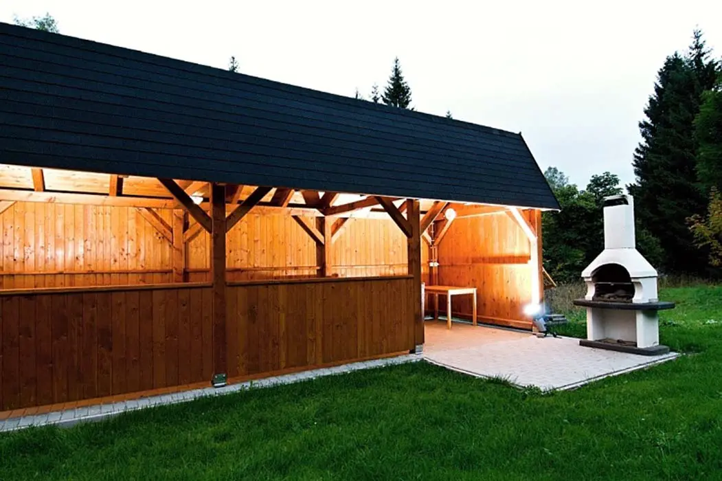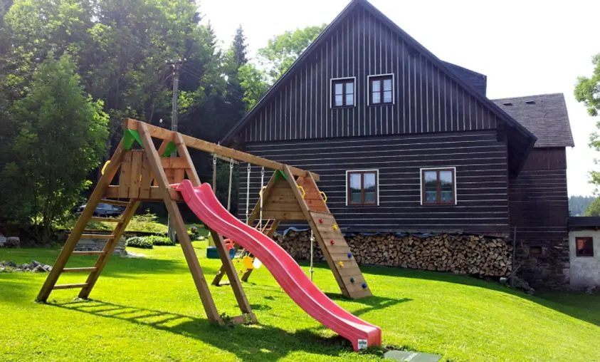 Venkovní kryté posezení s grilem, bazén, dětské houpačky, skluzavka, možnost úschovy kol a lyží
