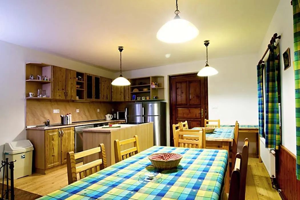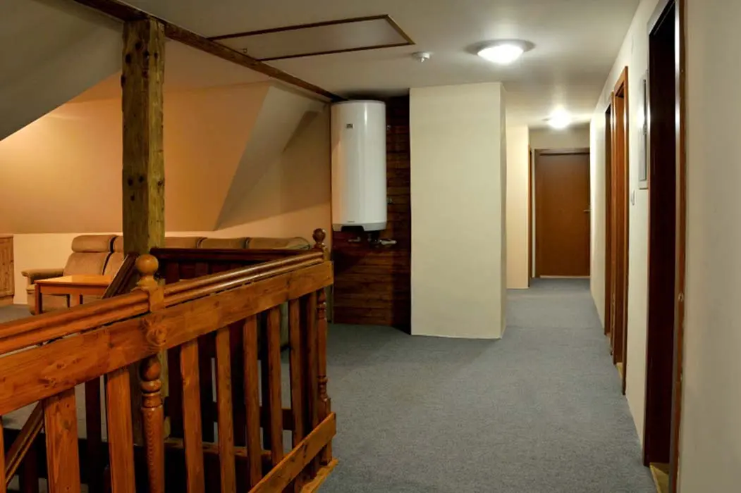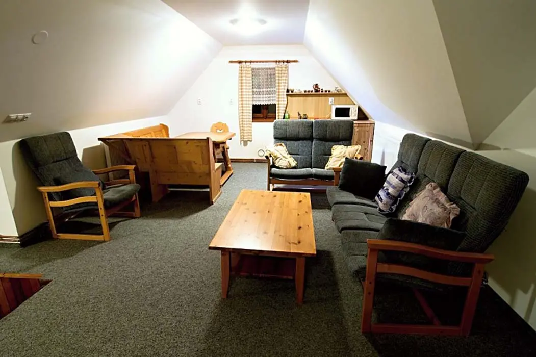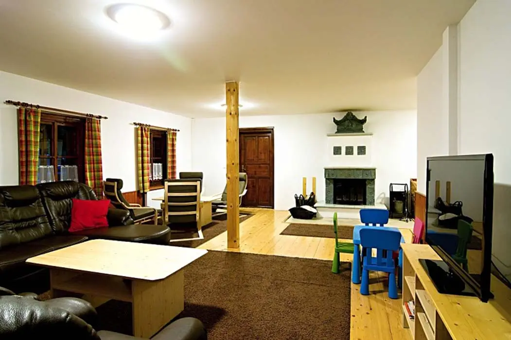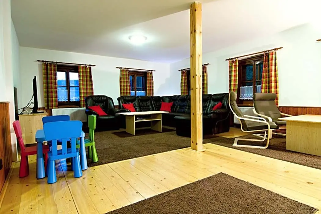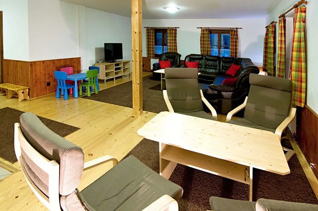 Obývací pokoj - samostatný, TV - plazma, SAT, DVD, dětský hrací koutek, sedací souprava. Kuchyně - sklokeramická varná deska, el.trouba, mikrovlnná trouba, varná konvice, myčka nádobí, 2x lednice s mrazákem, jídelní stoly a židle. 6 ložnic - 1x2, 2x3, 2x4, 1x6. Sociální zařízení - v přízemí koupelna s vanou a WC, v 1.patře 2 koupelny, jedna s vanou, druhá se sprchovým koutem a WC, dále 2 samostatné toalety. Topení - ústřední el.topení, rozvod horkovzduchu z krbu, kamna v kuchyni.