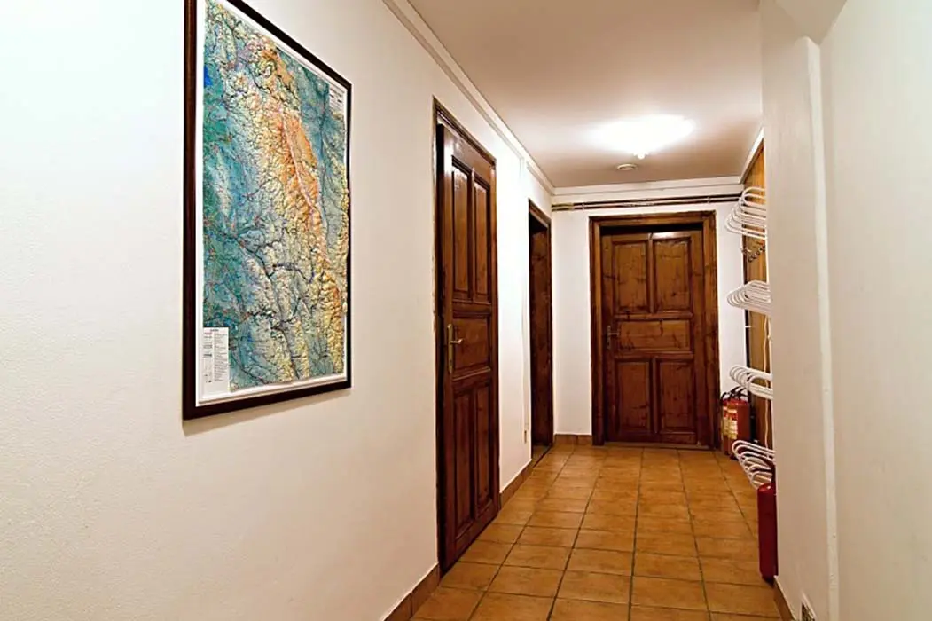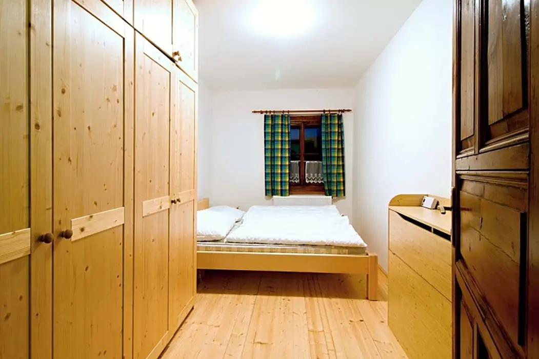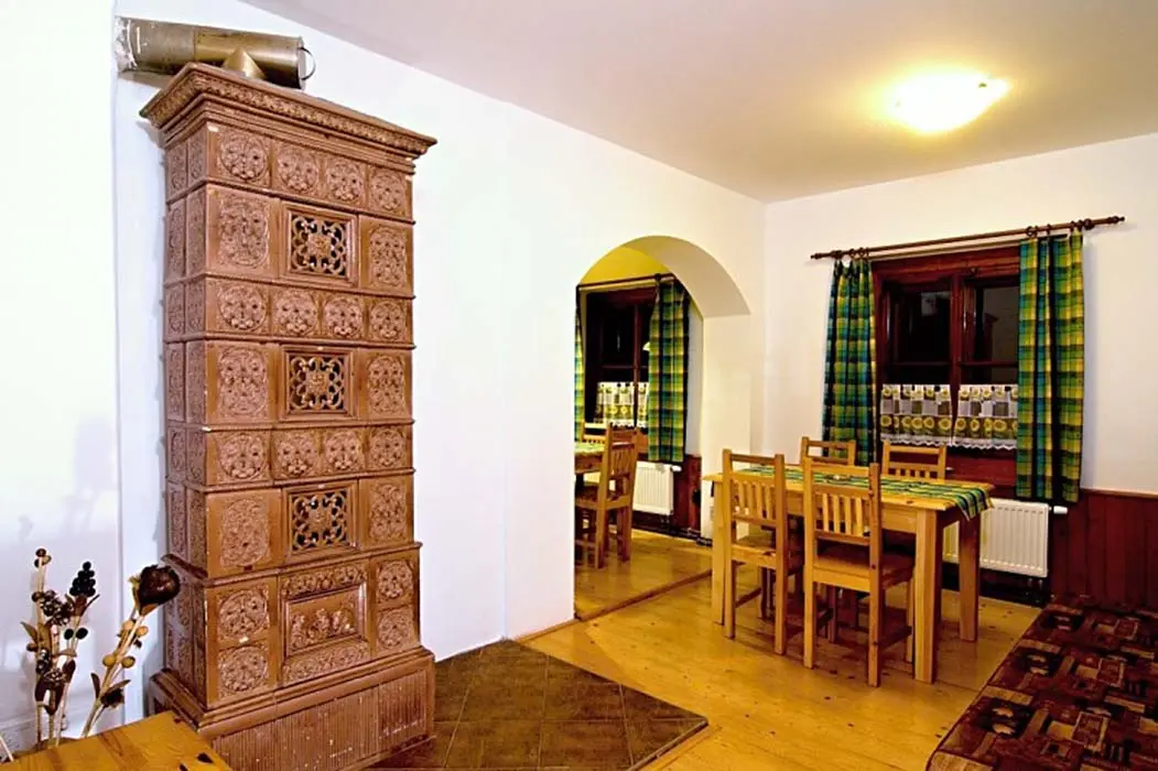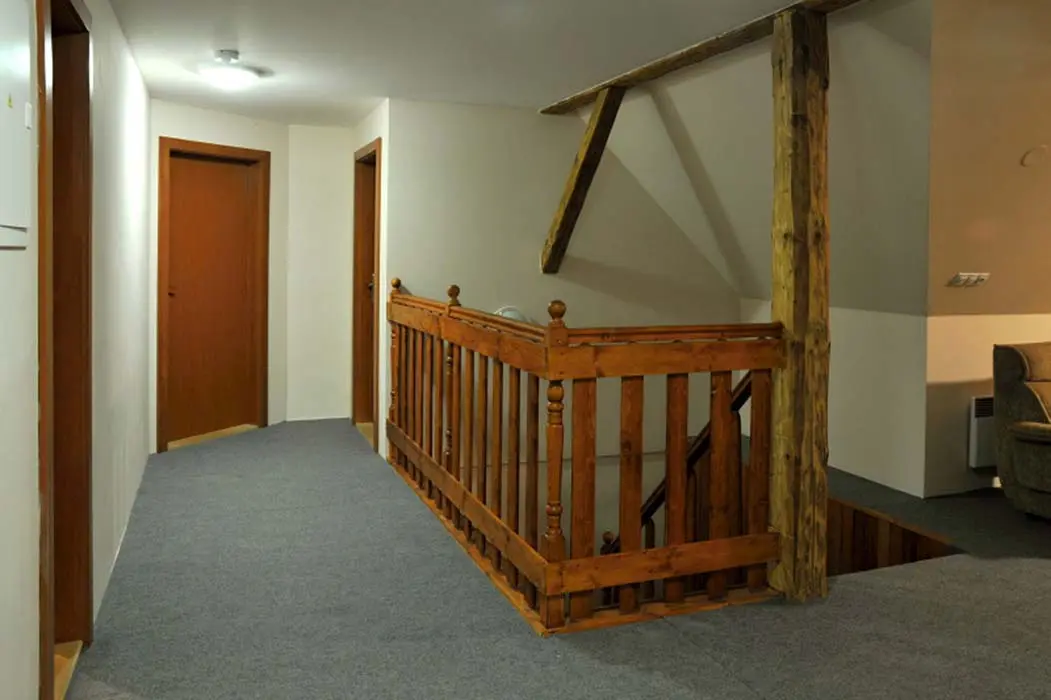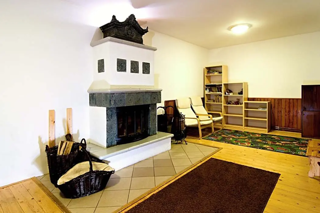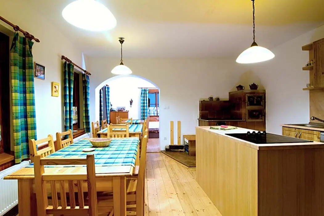 Obývací pokoj - samostatný, TV - plazma, SAT, DVD, dětský hrací koutek, sedací souprava. Kuchyně - sklokeramická varná deska, el.trouba, mikrovlnná trouba, varná konvice, myčka nádobí, 2x lednice s mrazákem, jídelní stoly a židle. 6 ložnic - 1x2, 2x3, 2x4, 1x6. Sociální zařízení - v přízemí koupelna s vanou a WC, v 1.patře 2 koupelny, jedna s vanou, druhá se sprchovým koutem a WC, dále 2 samostatné toalety. Topení - ústřední el.topení, rozvod horkovzduchu z krbu, kamna v kuchyni.