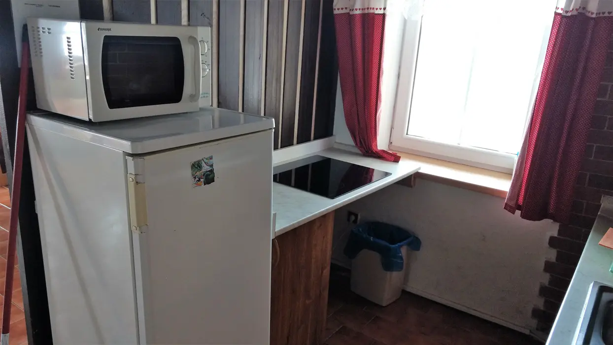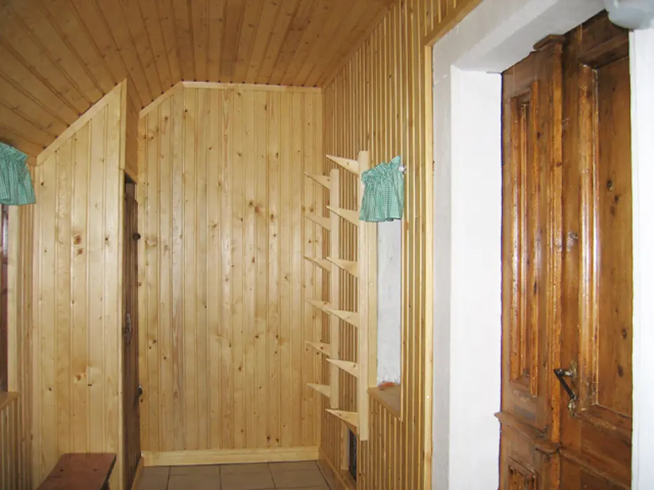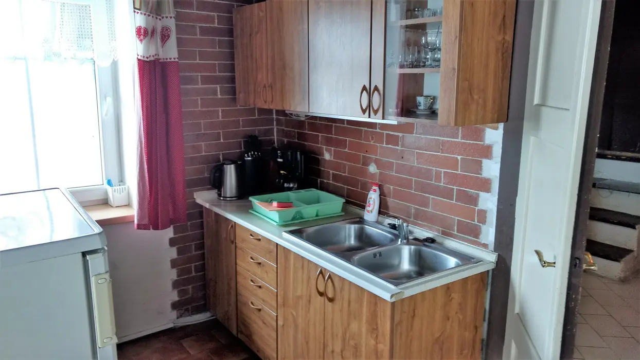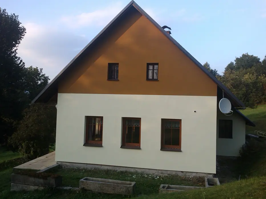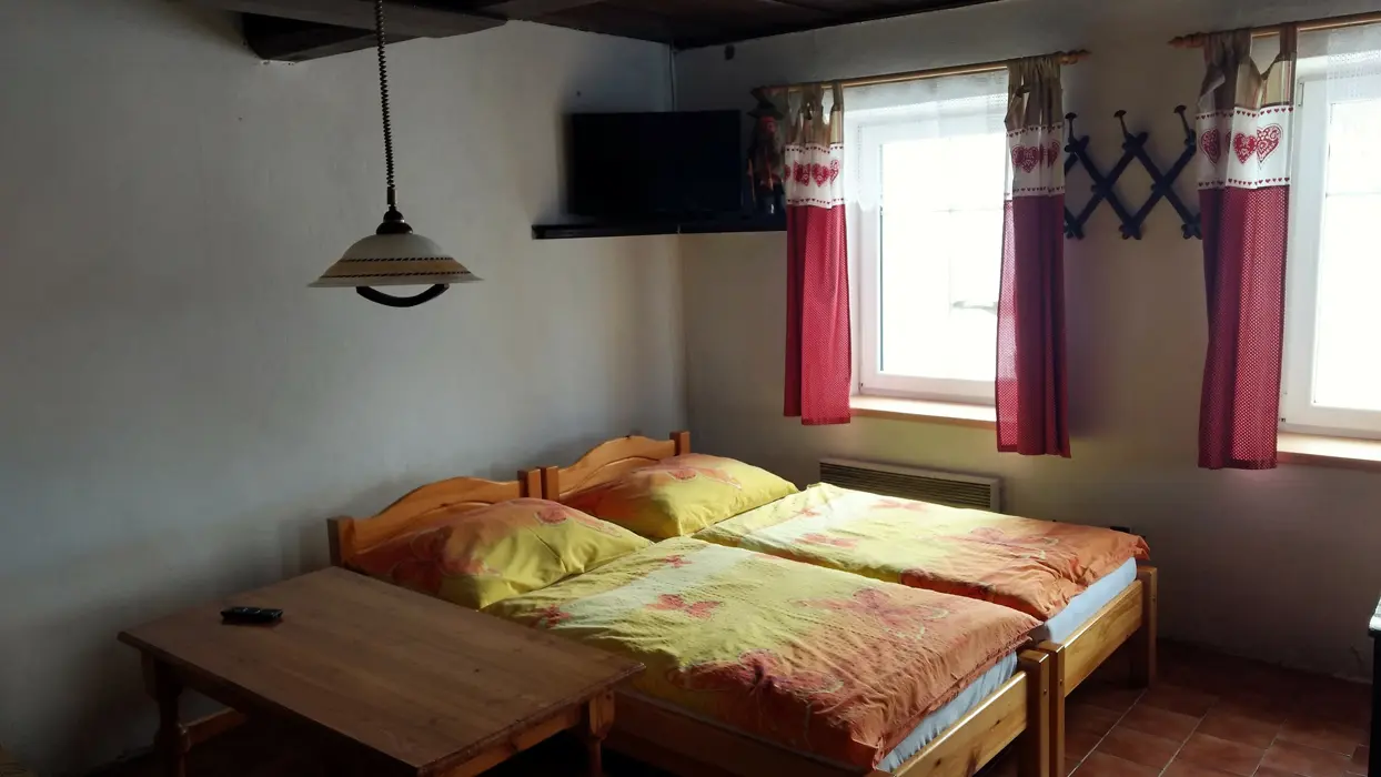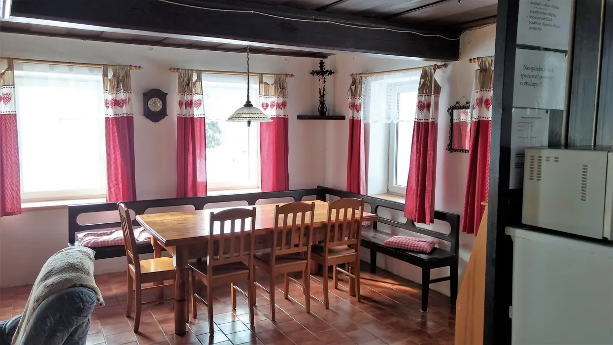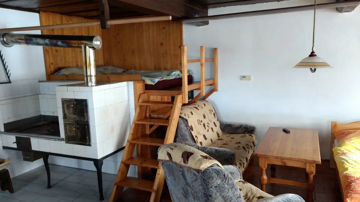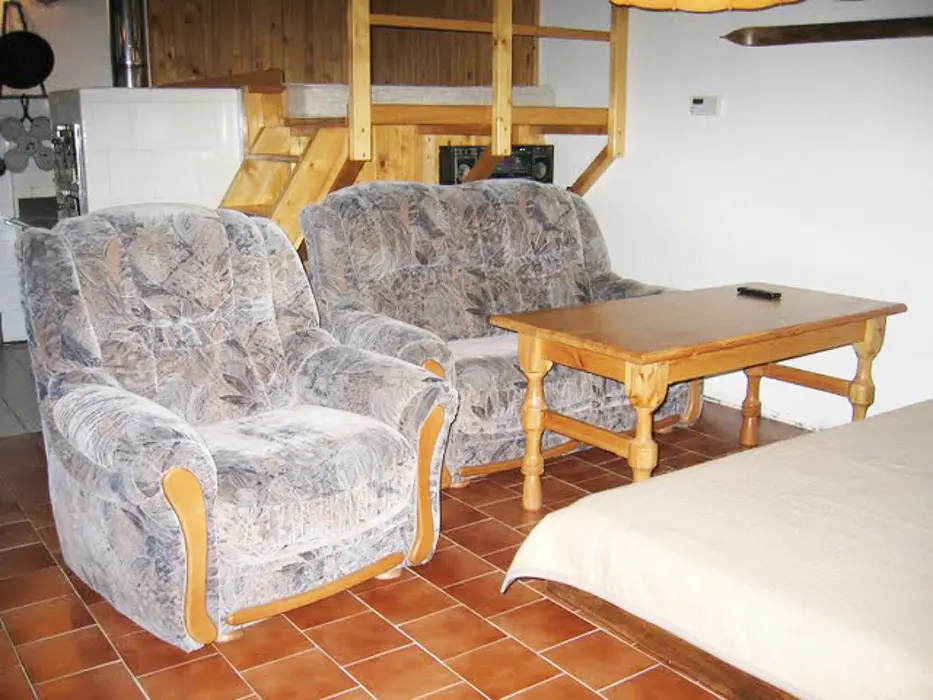 Vstupní chodba - krb, velký obytný pokoj s dvoulůžkem a sedací soupravou, velký jídelní stůl, TV, SAT, částečně oddělená kuchyňka - el. sporák, lednice s malým mrazáčkem, kávovar, varná konvice, 1 ložnice – 1x4 lůžka. Koupelna se sprchou, umyvadlo, WC. Topení centrální + elektrické