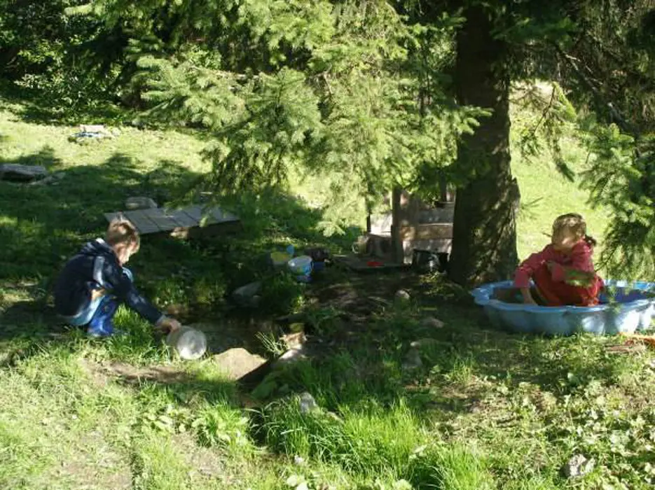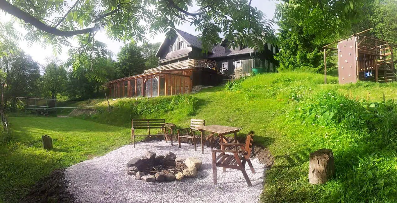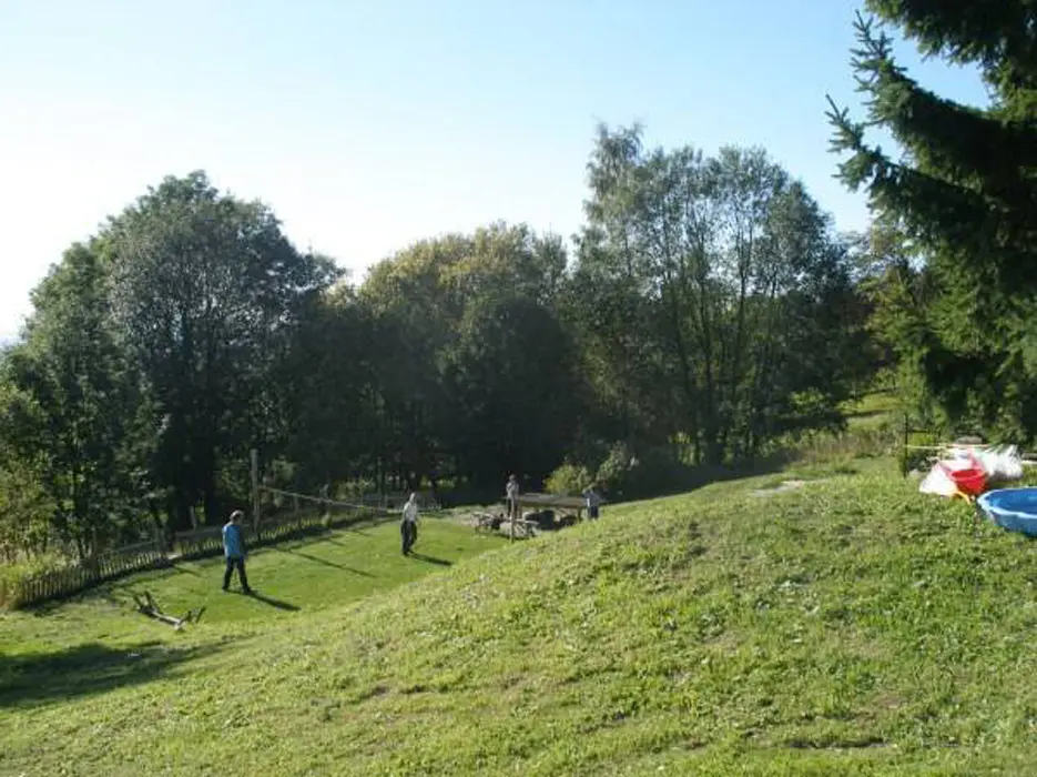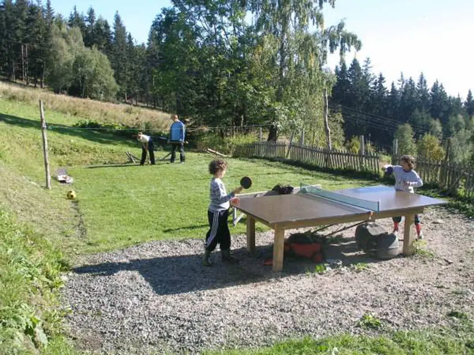 Malé travnaté hřiště, bazén 6 m, venkovní ping pong, ohniště, gril, terasa, pro děti domeček na stromě
