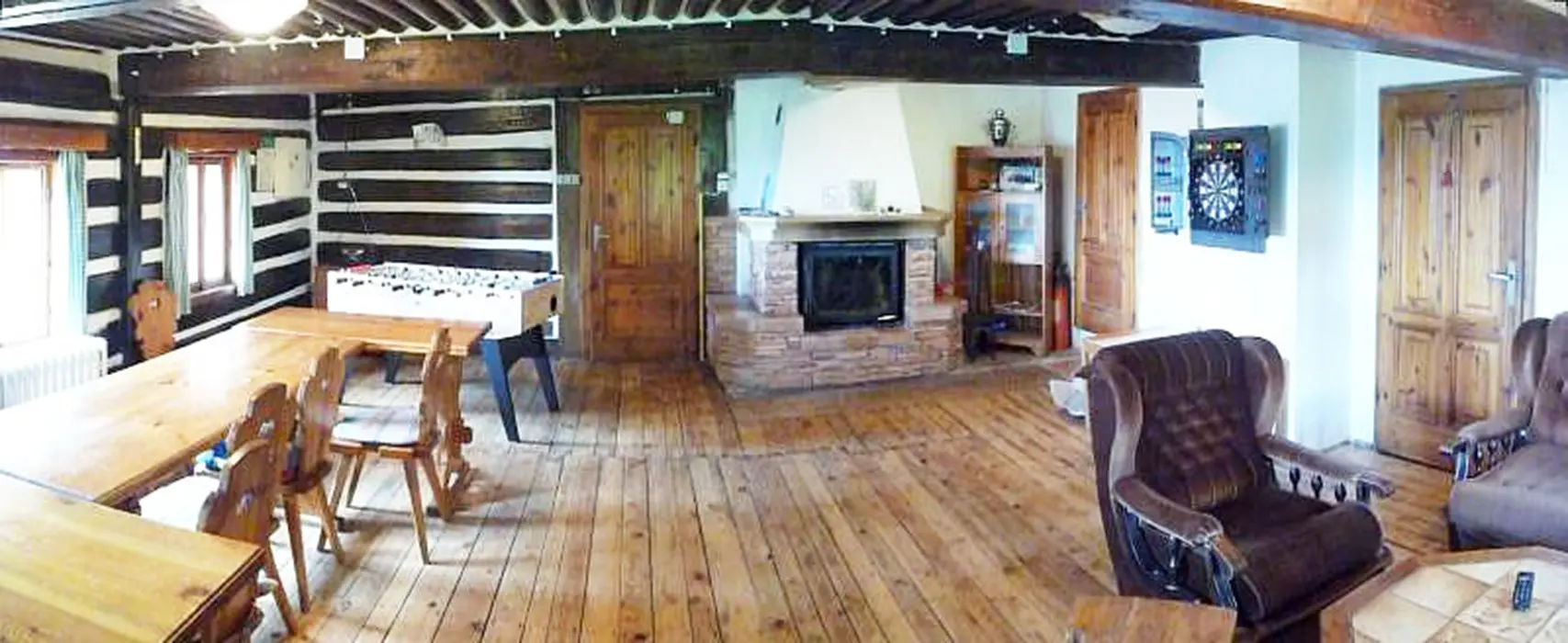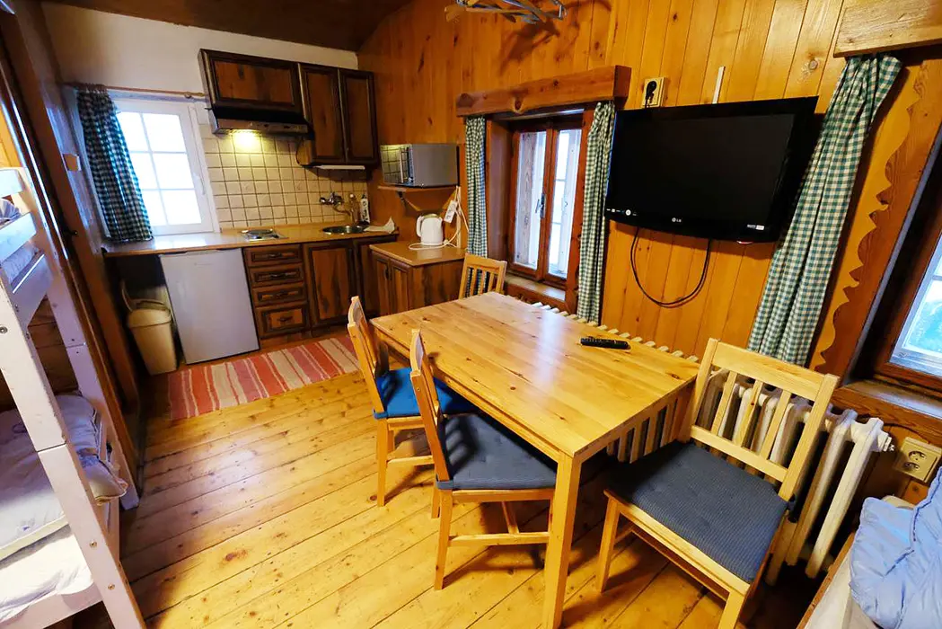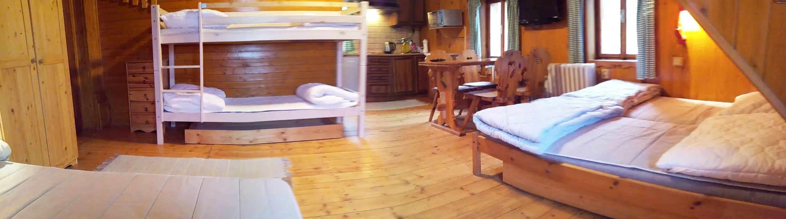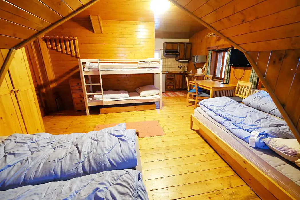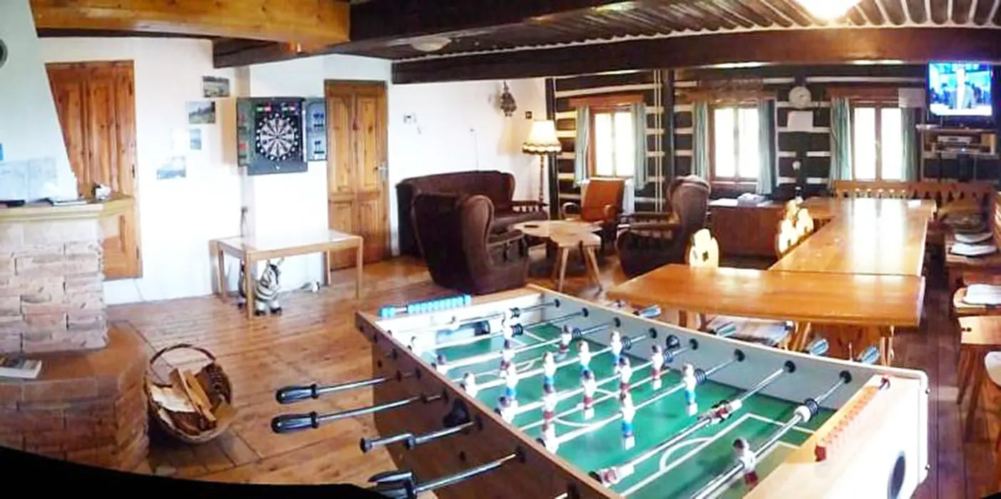 Společenská místnost s posezením, krb, stolní fotbal, šipky, BTV, velká a dobře vybavená kuchyně. 5 ložnic - 1x5, 1x6, 3x4 lůžka, v každém je kuchyňka s ledničkou, MW trouba, varná konvice, vařič, BTV, koupelna + WC. Topení plynové - kondenzační kotel. Dětská postýlka k dispozici.