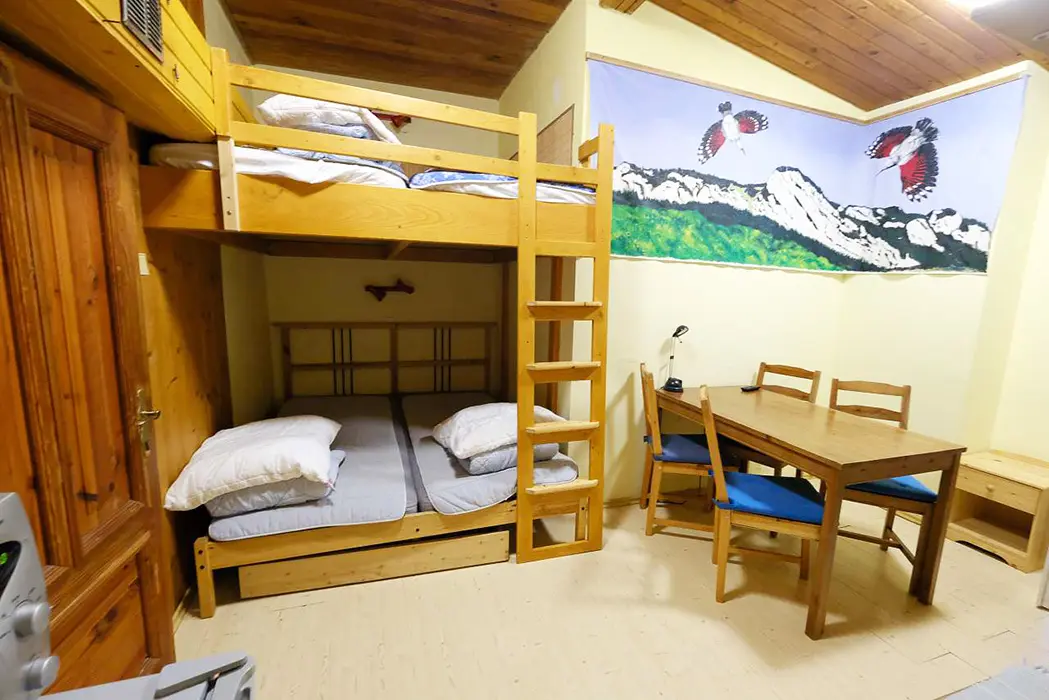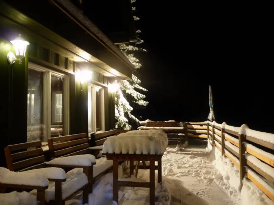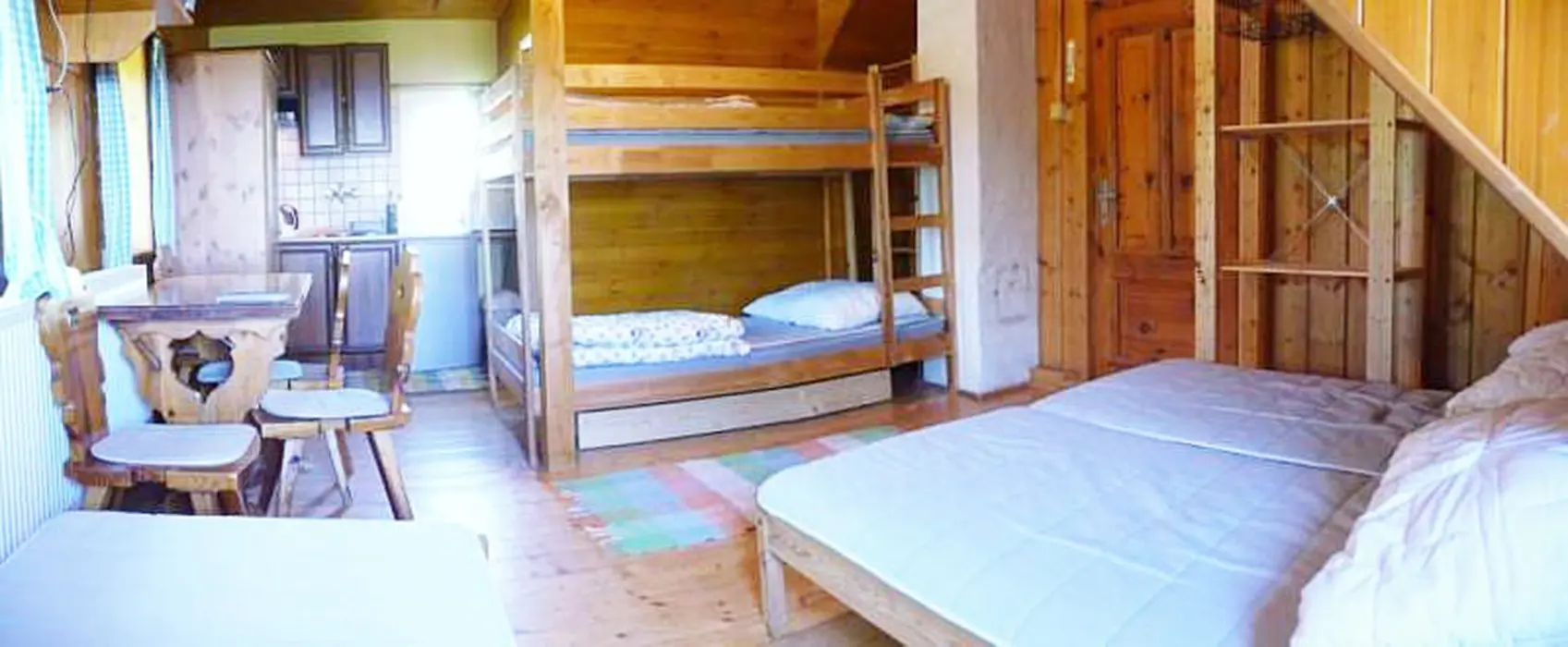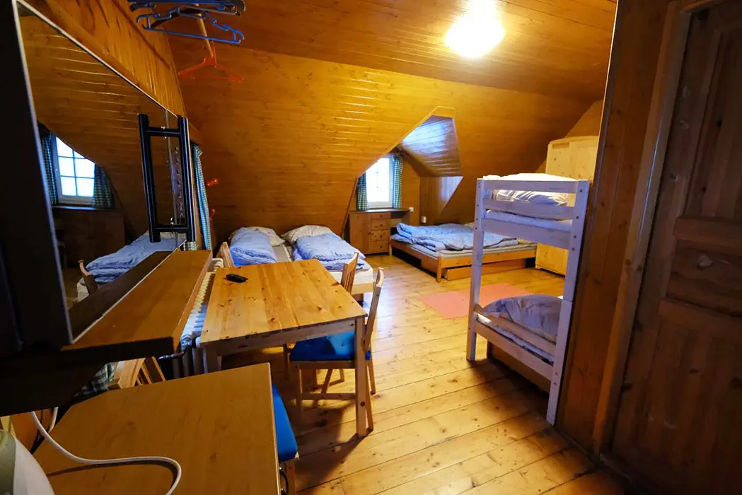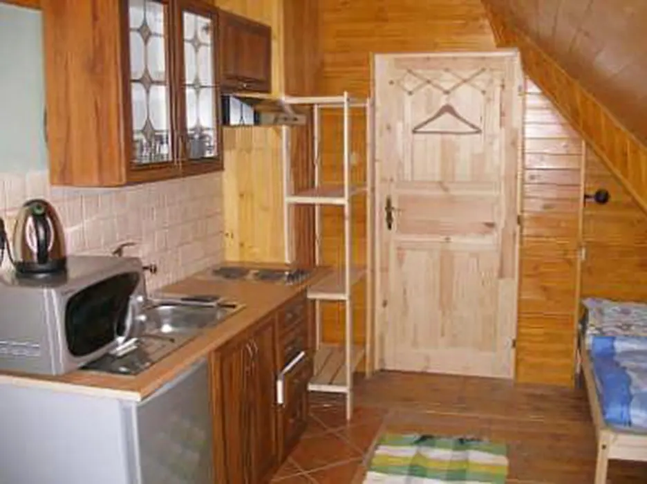 Společenská místnost s posezením, krb, stolní fotbal, šipky, BTV, velká a dobře vybavená kuchyně. 5 ložnic - 1x5, 1x6, 3x4 lůžka, v každém je kuchyňka s ledničkou, MW trouba, varná konvice, vařič, BTV, koupelna + WC. Topení plynové - kondenzační kotel. Dětská postýlka k dispozici.