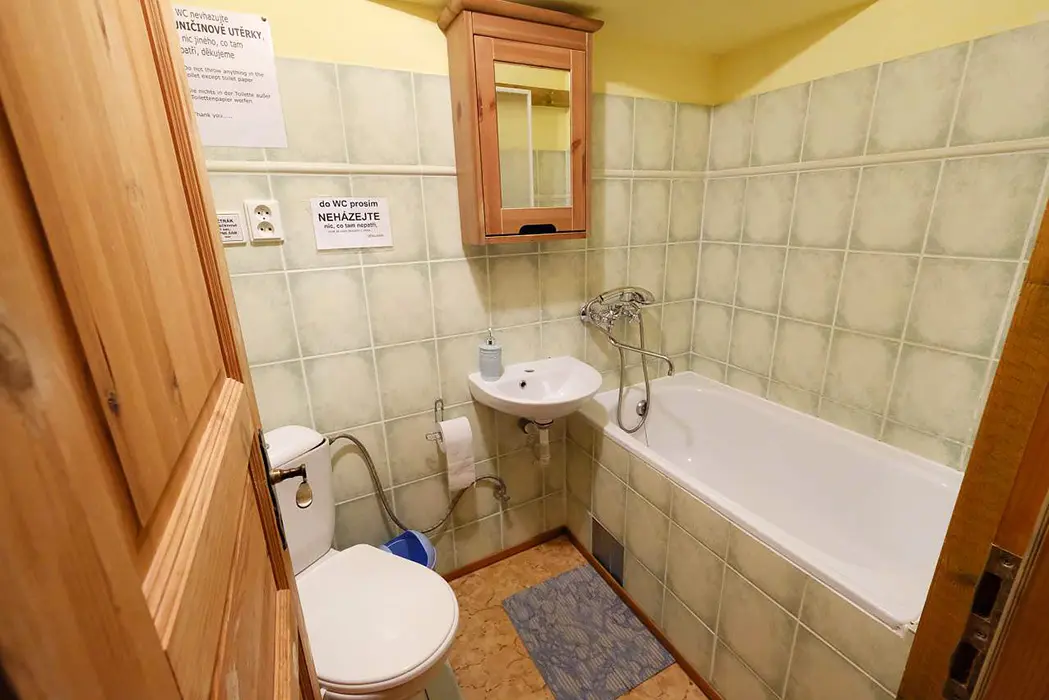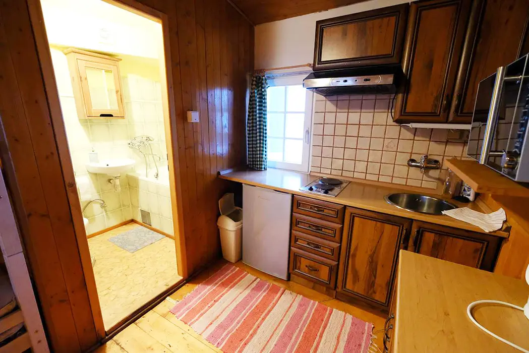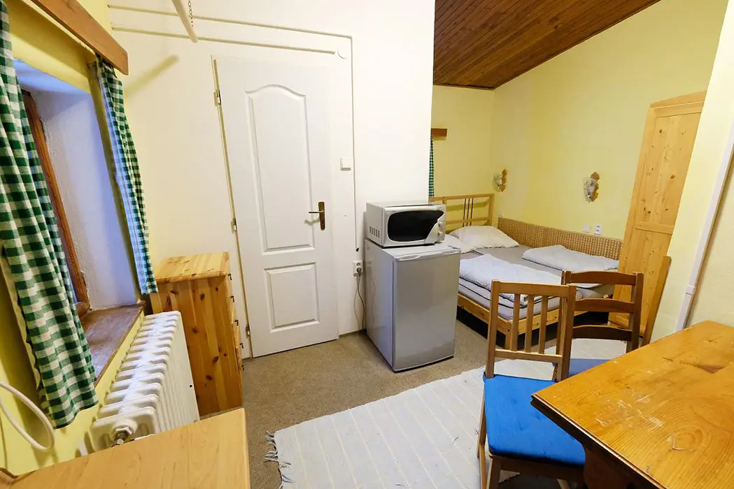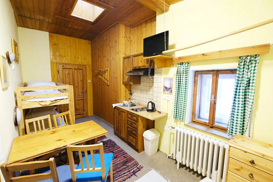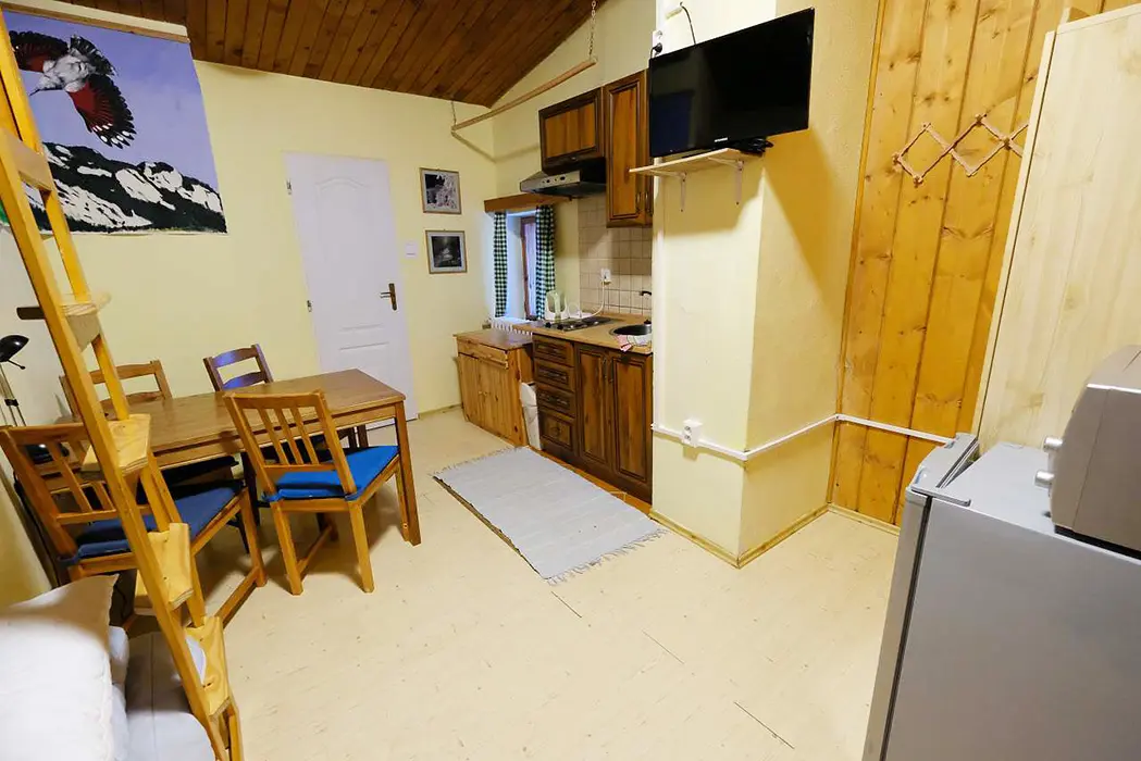 Dvoupokojový plně vybavený apartmán za příplatek 1300 Kč/den/letní sezona a 1900 Kč/den/zimní sezona viz výše cena. Samostatný apartmán má vlastní kuchyňku, posezení, jídelní stůl, ložnici 4 lůžka - manželská postel + palanda a koupelnu s vanou, WC
