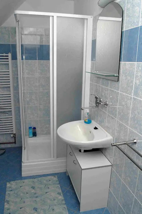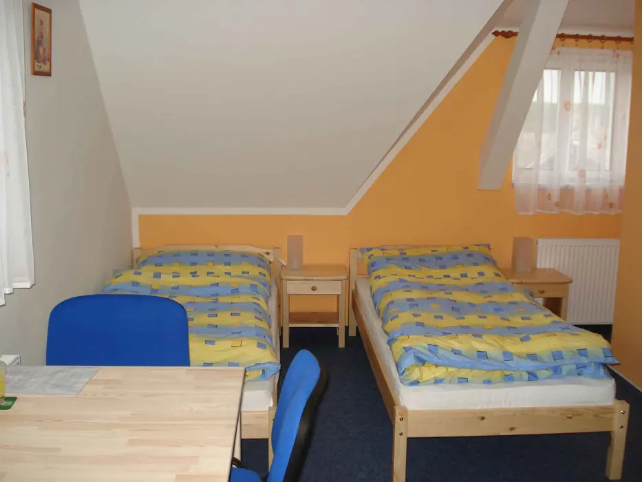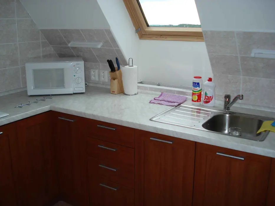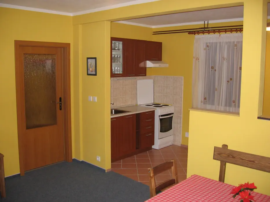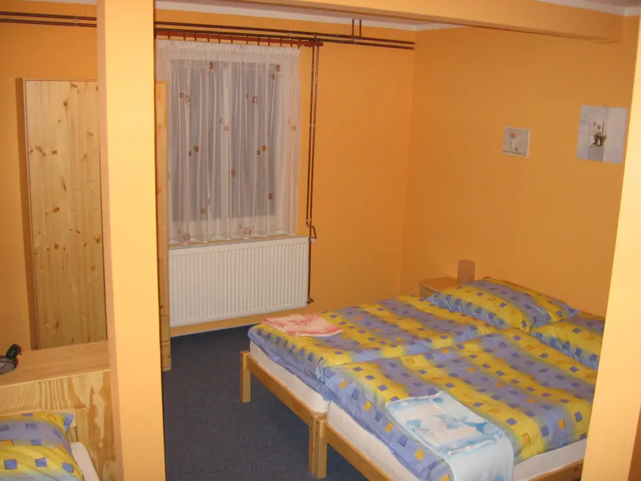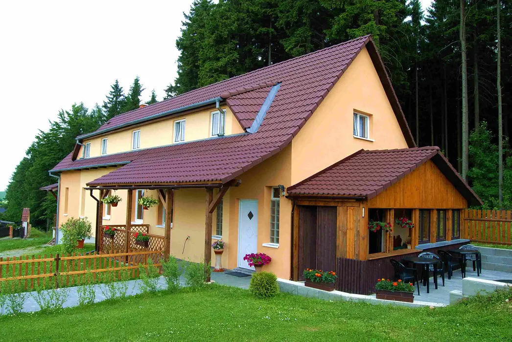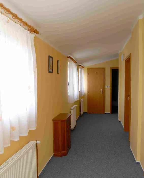 V přízemí společenská místnost, TV, DVD, kuchyňský kout - el. sporák s troubou, MVT, varná konvice, toustovač, topinkovač, 2x lednice s mrazákem. 5 ložnic - v přízemí 1x4 lůžka + vlastní soc. zařízení ( sprcha, umyvadlo, WC ), v podkroví 1x2 + vlastní WC a umyvadlo, další pokoje jsou bez soc. zařízení 1x2, 2x3 lůžka. V podkroví je další kychyňský kout - vybaven - lednice s mrazákem, el. varná deska, mikrovlnka, varná konvice, remoska, toustovač. V podkroví je také jídelna s TV a DVD. 2 x společné soc. zařízení - v přízemí a v podkroví sprcha, umyvadlo a WC, k dispozici pračka. Topení centrální.