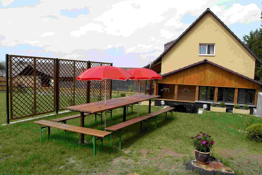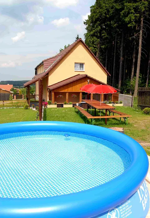 Venkovní terasa s grilem, plastový nábytek, zahradní posezení, zastřešená veranda, nadzemní venkovní bazén (průměr 3m), dětské pískoviště, elektronické šipky, louka vhodná na míčové hry