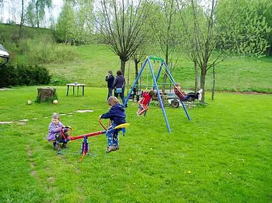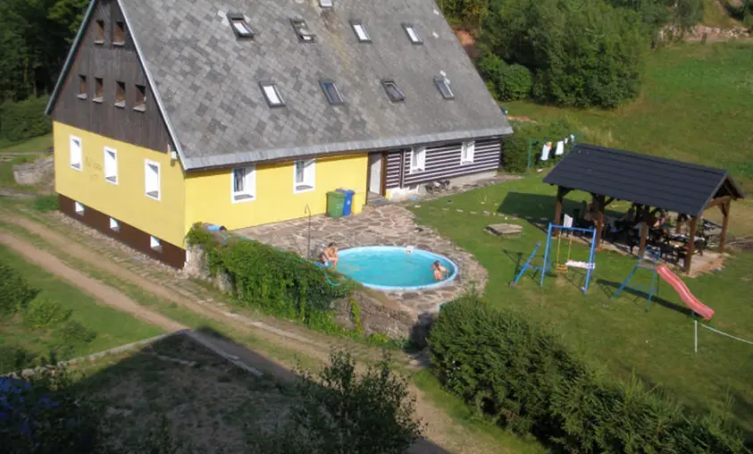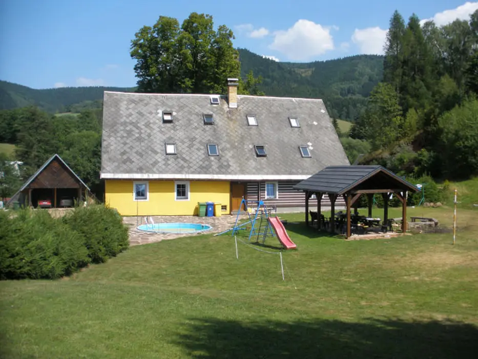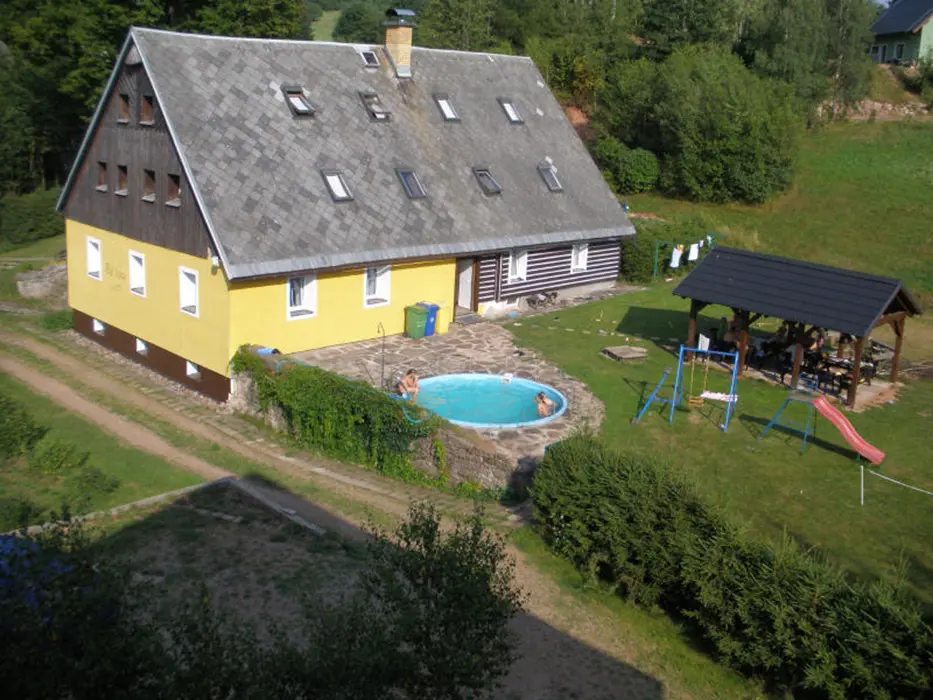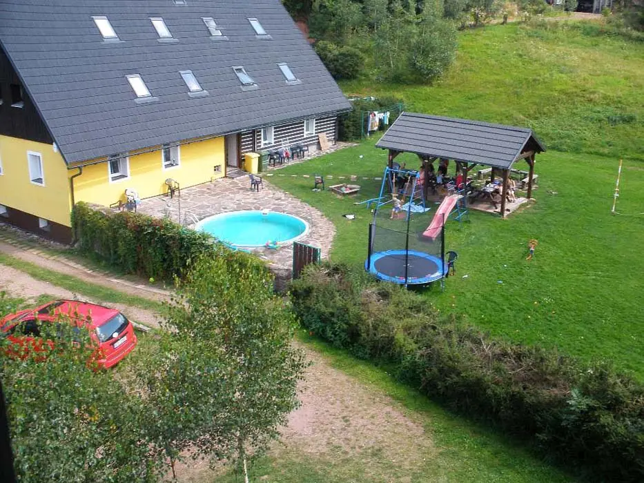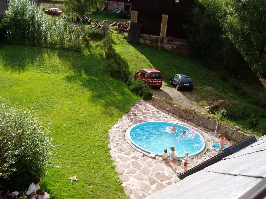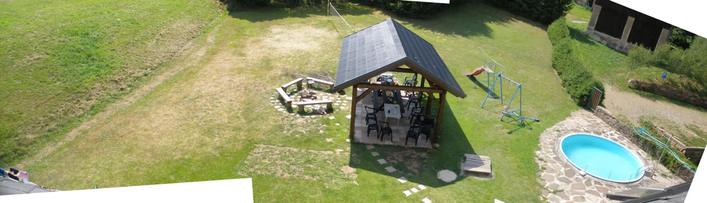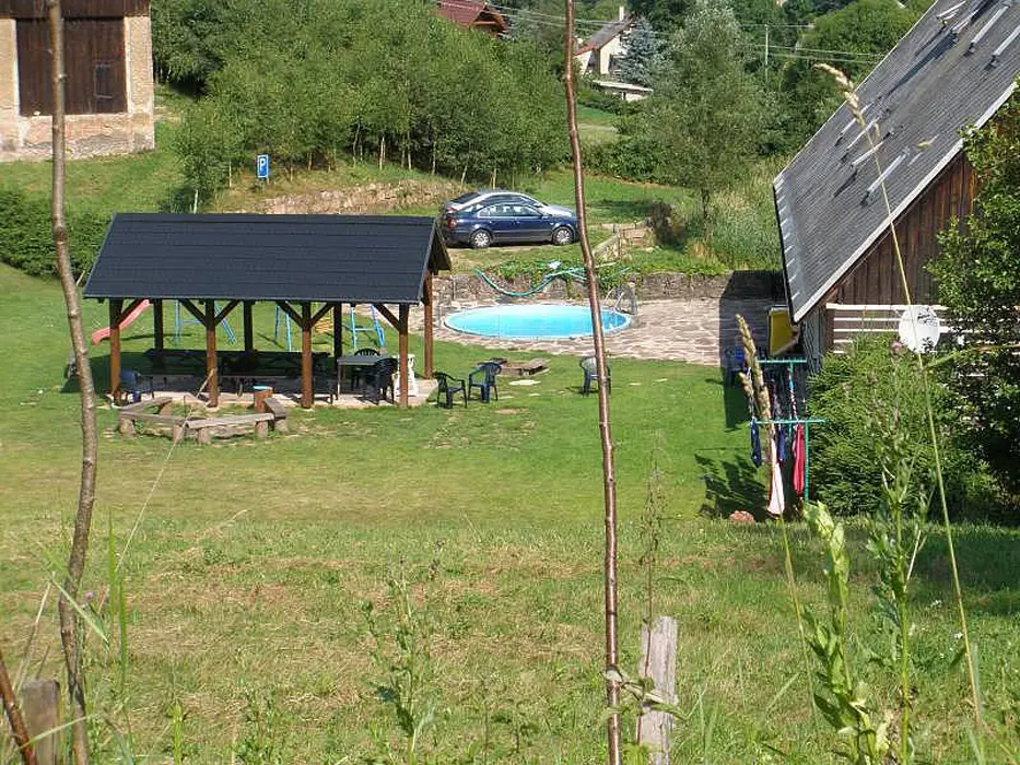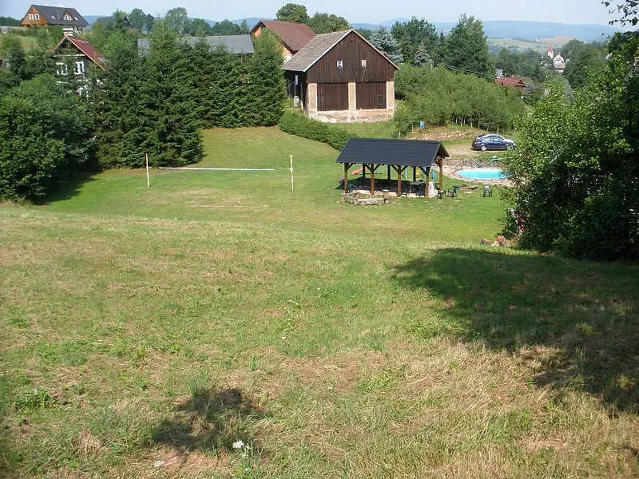 Prostorný pozemek 2500 m2, velké ohniště s posezením, kryté posezení, pro malé děti klouzačka, pískoviště - vzdálené cca 100 m od místní komunikace, travnaté hřiště na badmiton, volejbal, malou kopanou, zapuštěný kruhový bazén průměr 4,4 m x hloubka 1,2 m + filtrace a sprcha