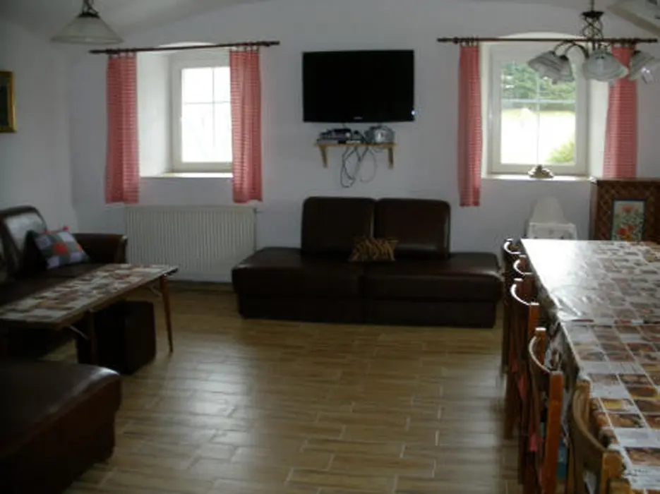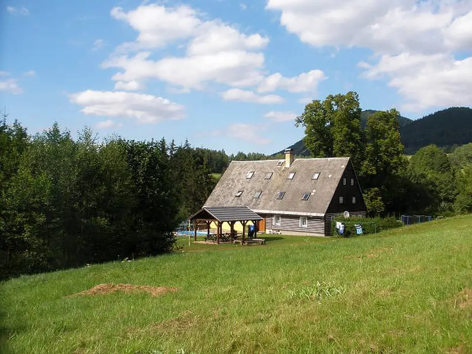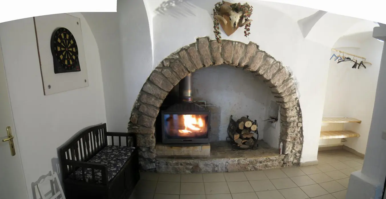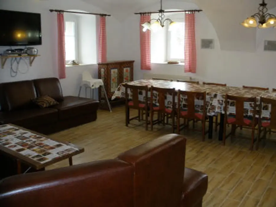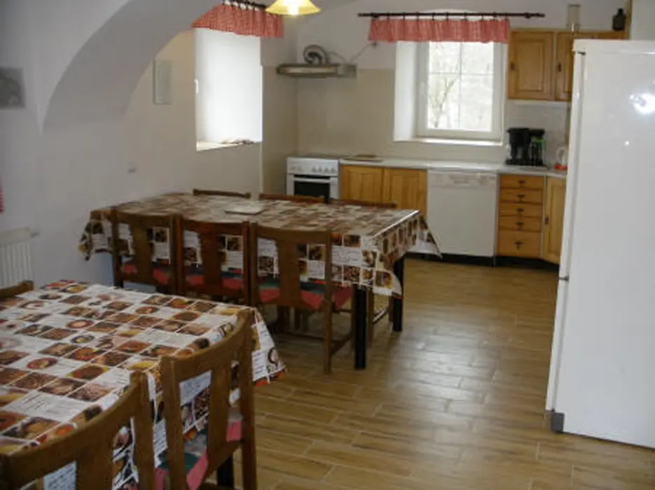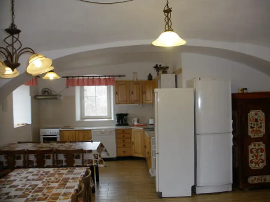 Hala s krbem, velká společenská místnost 48 m2 s kuchyňským koutem a posezením, kuchyně je vybavená - myčka nádobí, el. sporák, 2x lednice s mrazákem, mikrovlnka, kávovar, varná konvice, nádobí. 7 ložnic - 1x2, 2x3, 3x4,1x6 lůžek. 6 koupelen, 7xWC. Topení ústřední