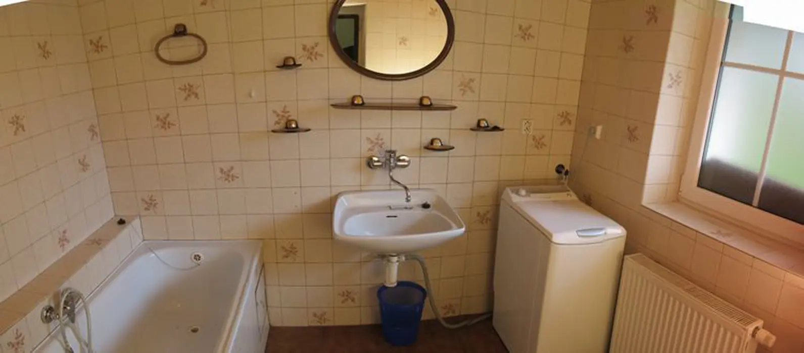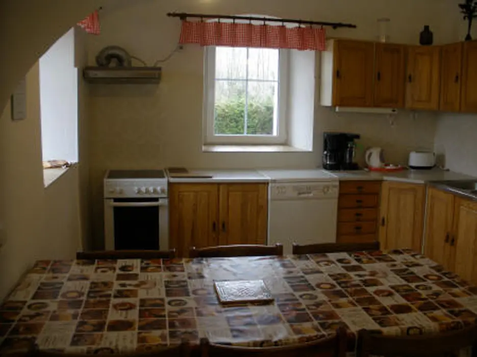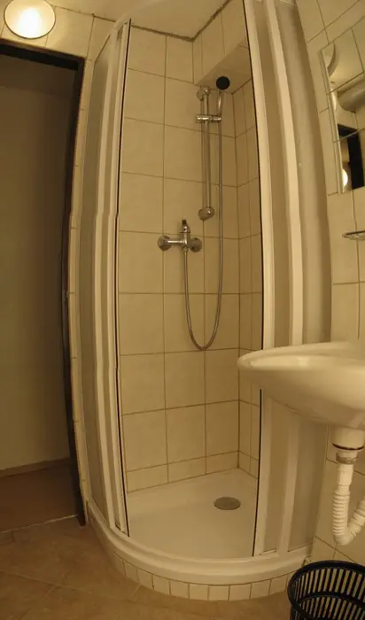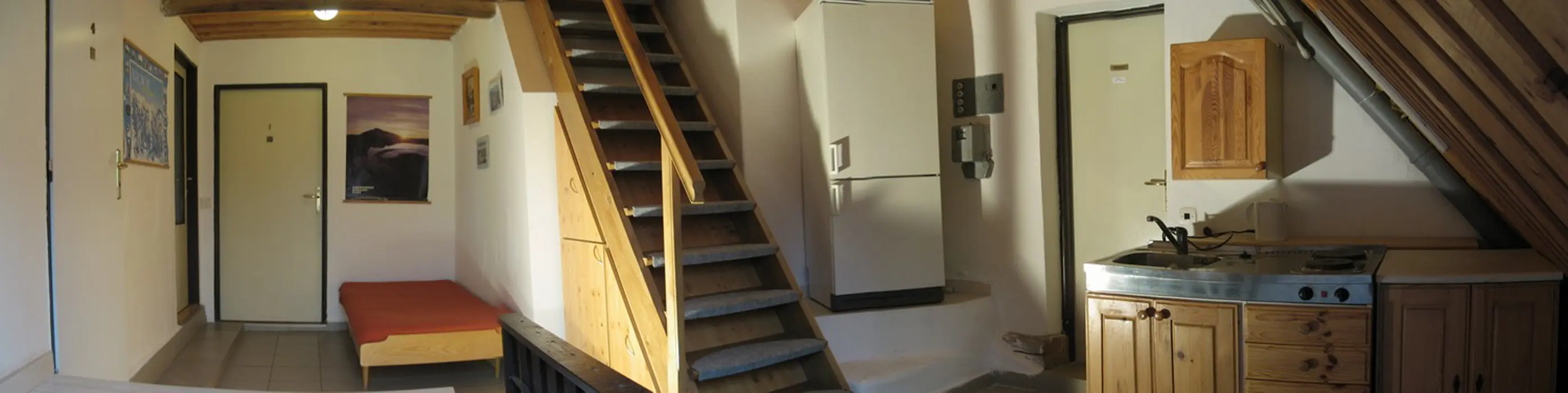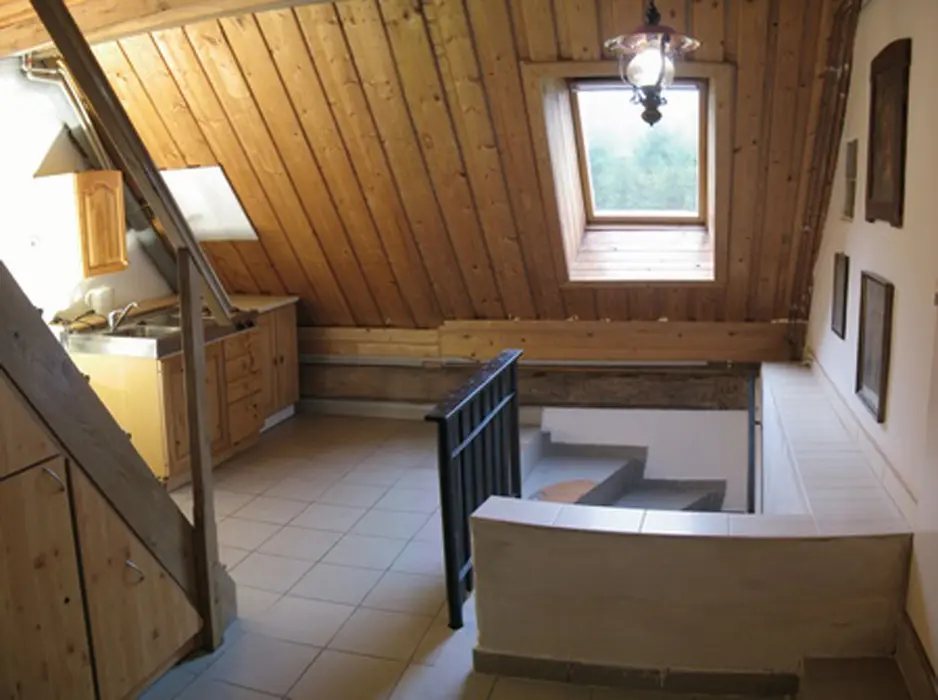 Hala s krbem, velká společenská místnost 48 m2 s kuchyňským koutem a posezením, kuchyně je vybavená - myčka nádobí, el. sporák, 2x lednice s mrazákem, mikrovlnka, kávovar, varná konvice, nádobí. 7 ložnic - 1x2, 2x3, 3x4,1x6 lůžek. 6 koupelen, 7xWC. Topení ústřední