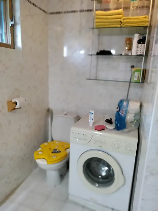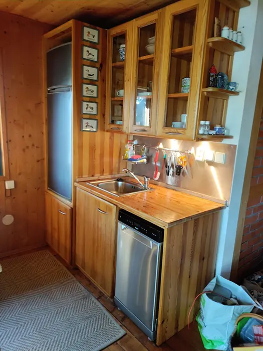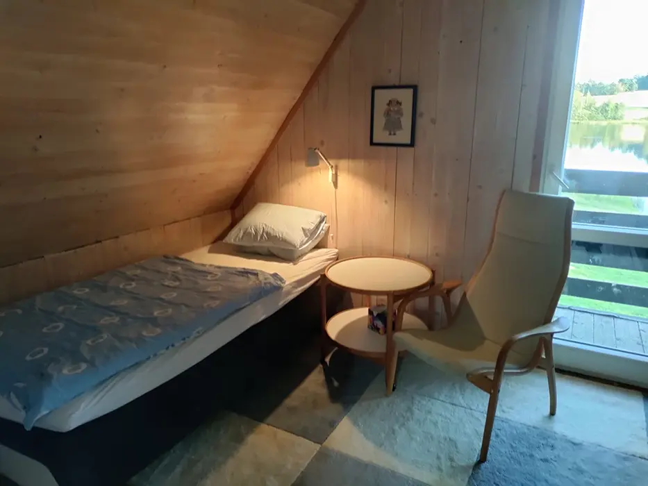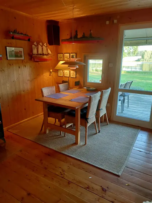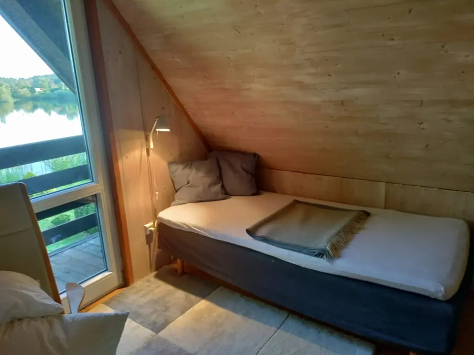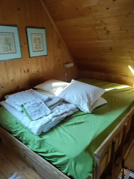 Obytná část spojená s kuchyní - posezení, 1 přistýlka, jídelní stůl a židle, vybavení kuchyně - sklokeramická varná deska, lednice s mrazákem, varná konvice, myčka, nádobí. V patře 2 ložnice - 2x2 lůžka, jedna je průchozí. Soc. zařízení - koupelna se sprchou, pračka, umyvadlo, WC v koupelně. Topení - el. přímotopy