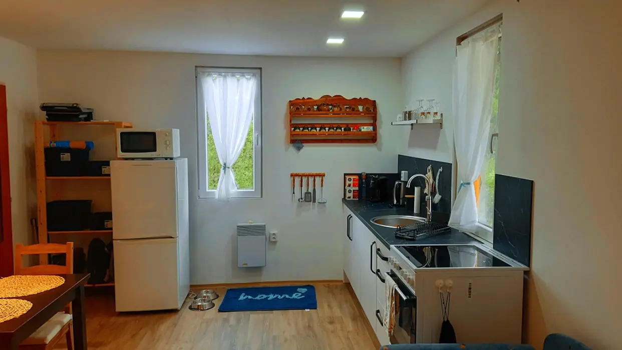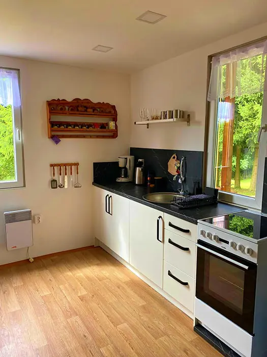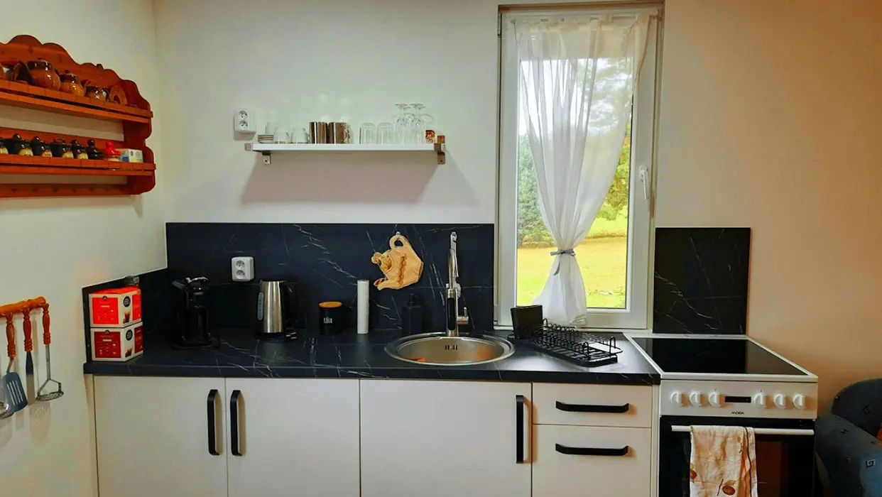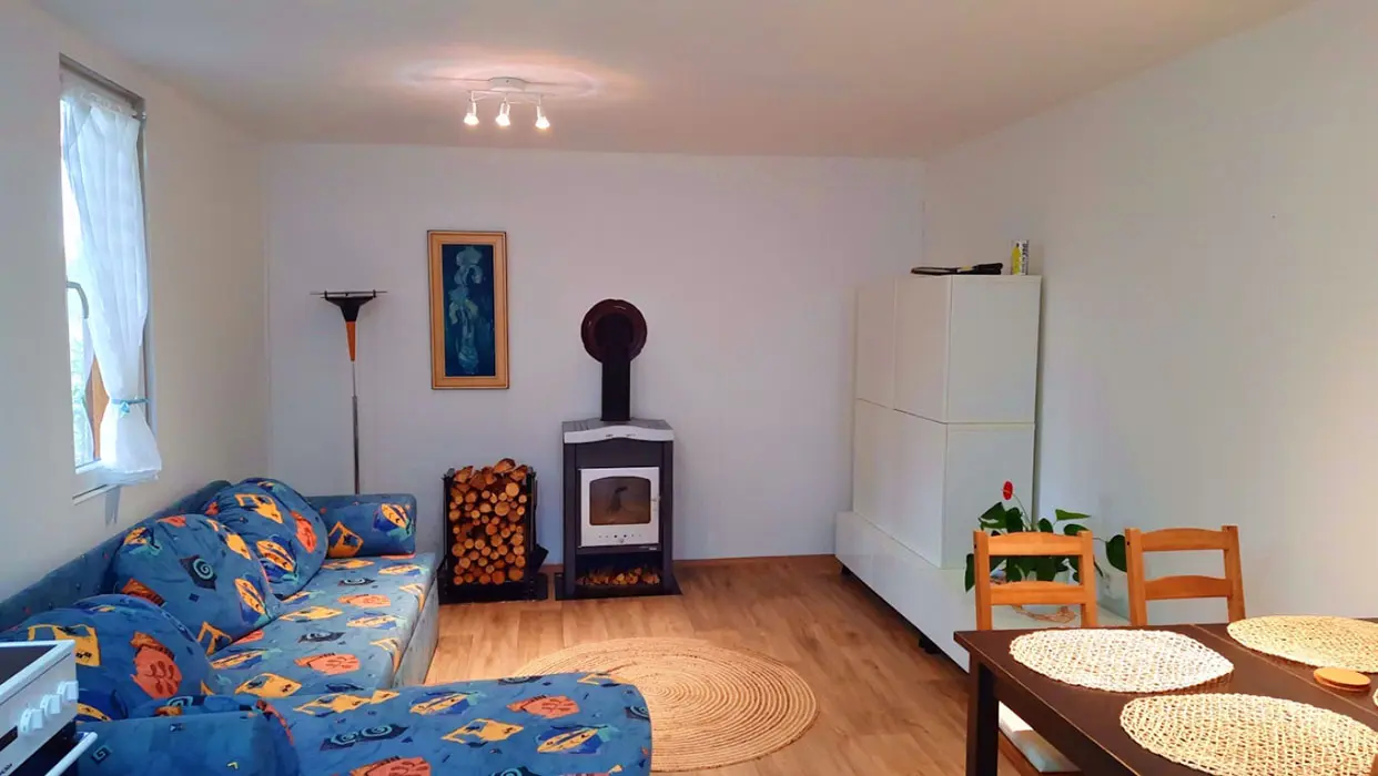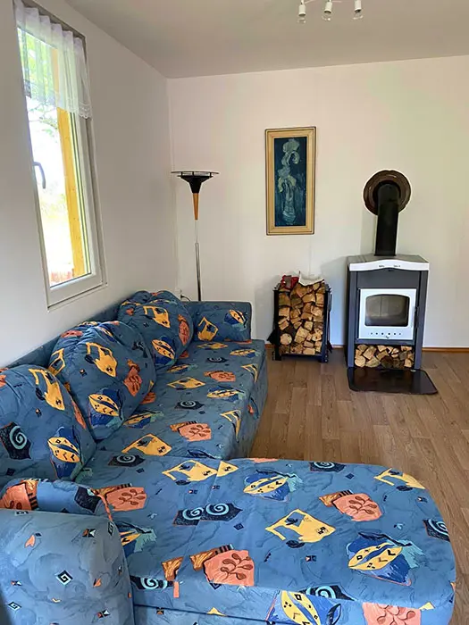 Obytná část spojená s kuchyní – rozkládací sedací souprava ( 2 přistýlky ), krbová kamna, vybavení kuchyně - sklokeramická deska s pečící troubou, mikrovlnka, lednice s mrazákem, varná konvice, elektrický gril, kávovar na kapsle, nádobí, jídelní stůl. 1 ložnice - 1x2 lůžka. Soc. zařízení - koupelna se sprchovým koutem, umyvadlo, WC v koupelně. Topení - krb, el. přímotopy. NENÍ TV + WIFI