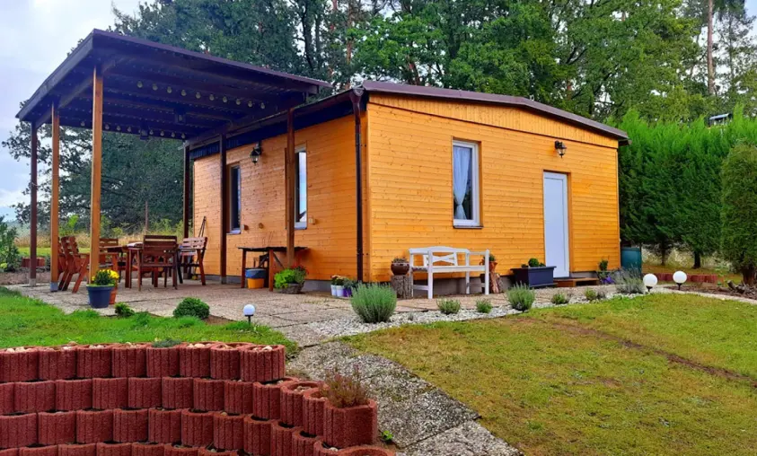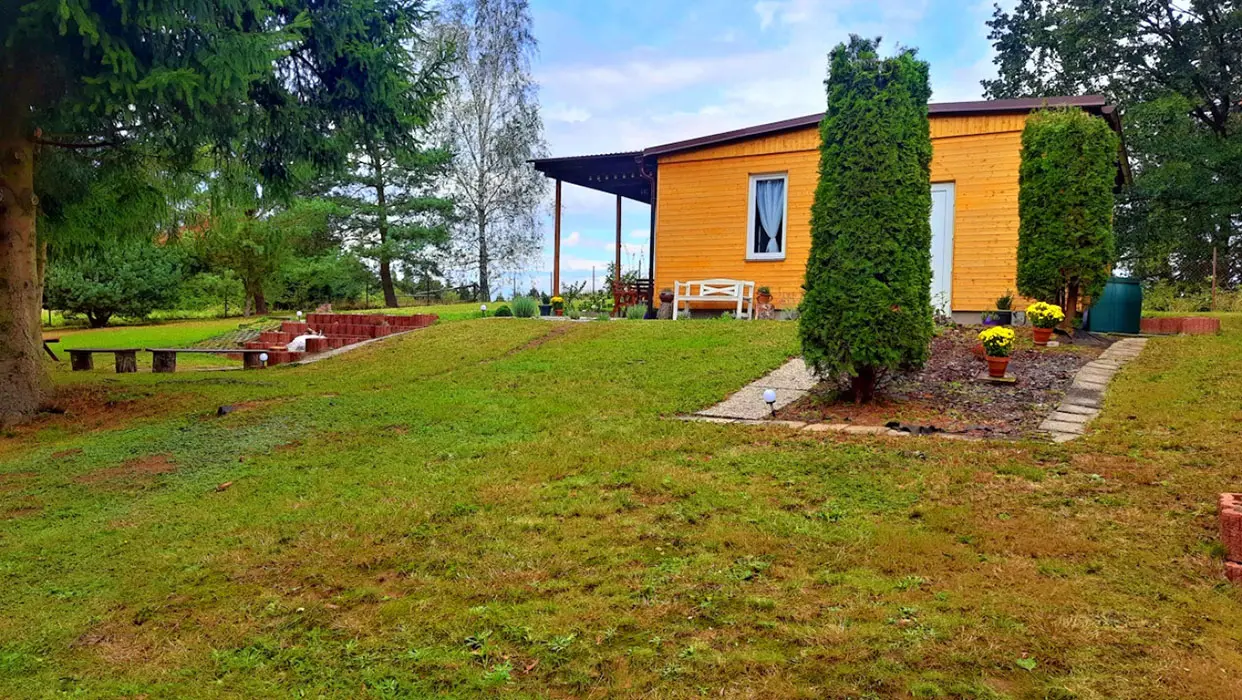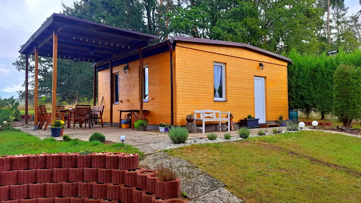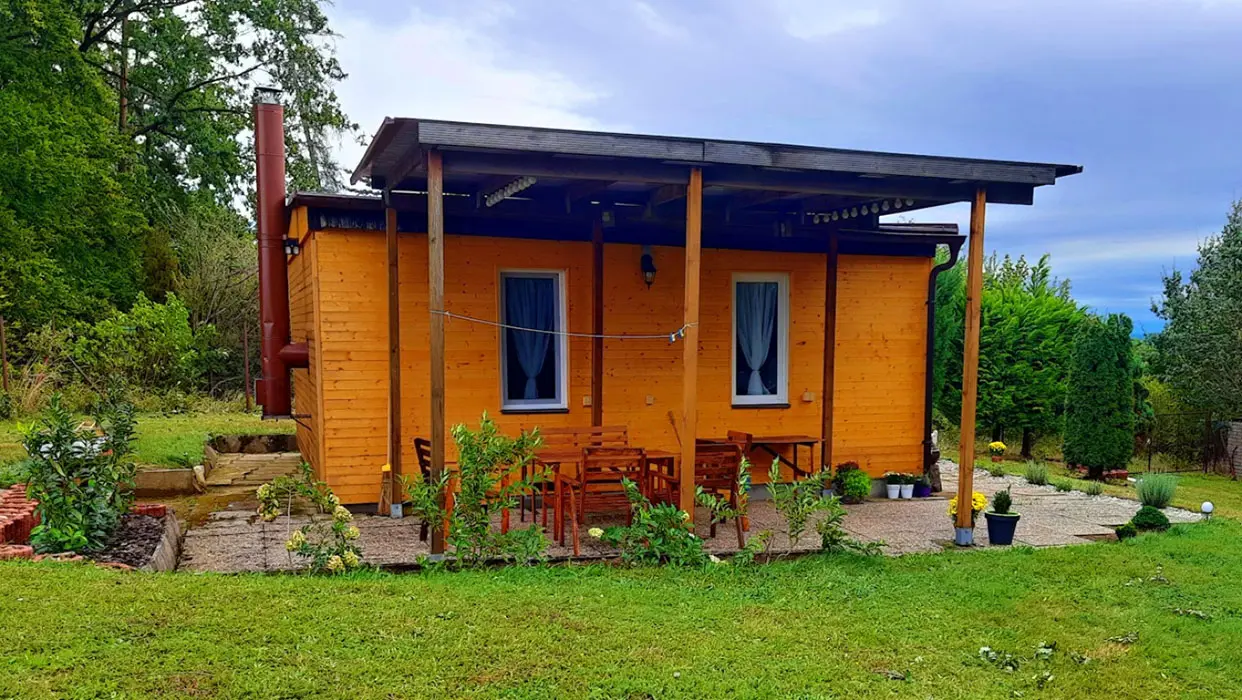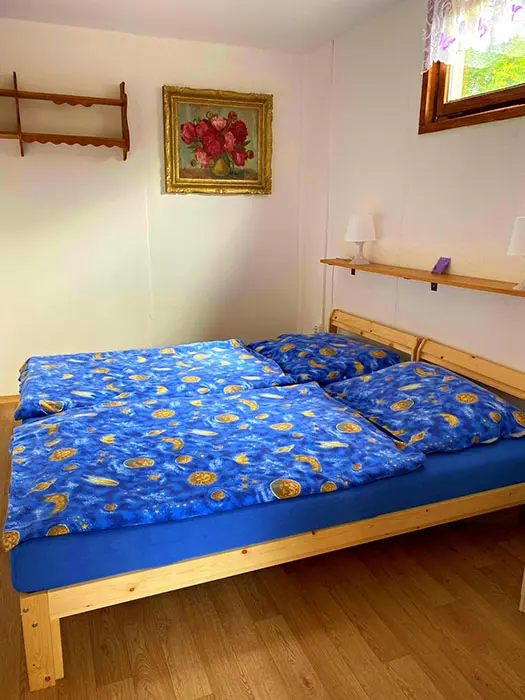 Obytná část spojená s kuchyní – rozkládací sedací souprava ( 2 přistýlky ), krbová kamna, vybavení kuchyně - sklokeramická deska s pečící troubou, mikrovlnka, lednice s mrazákem, varná konvice, elektrický gril, kávovar na kapsle, nádobí, jídelní stůl. 1 ložnice - 1x2 lůžka. Soc. zařízení - koupelna se sprchovým koutem, umyvadlo, WC v koupelně. Topení - krb, el. přímotopy. NENÍ TV + WIFI