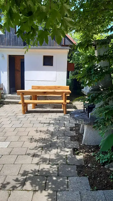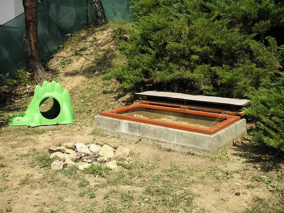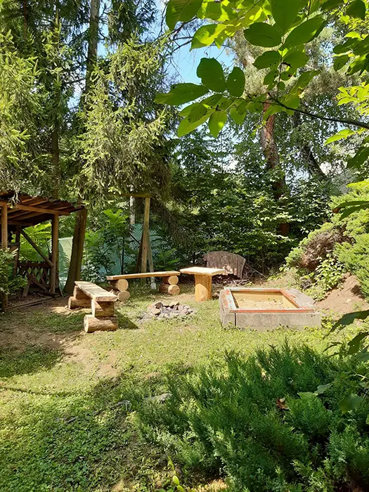 Ohniště s posezením, venkovní krb. Pro děti pískoviště, houpačka, skluzavka a ruské kuželky