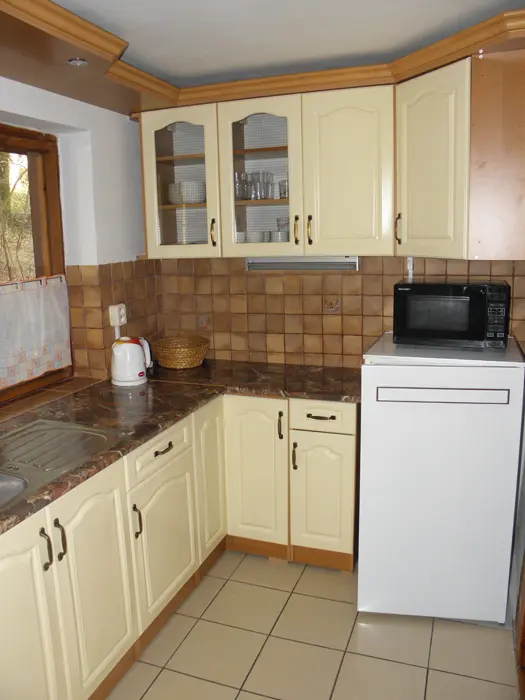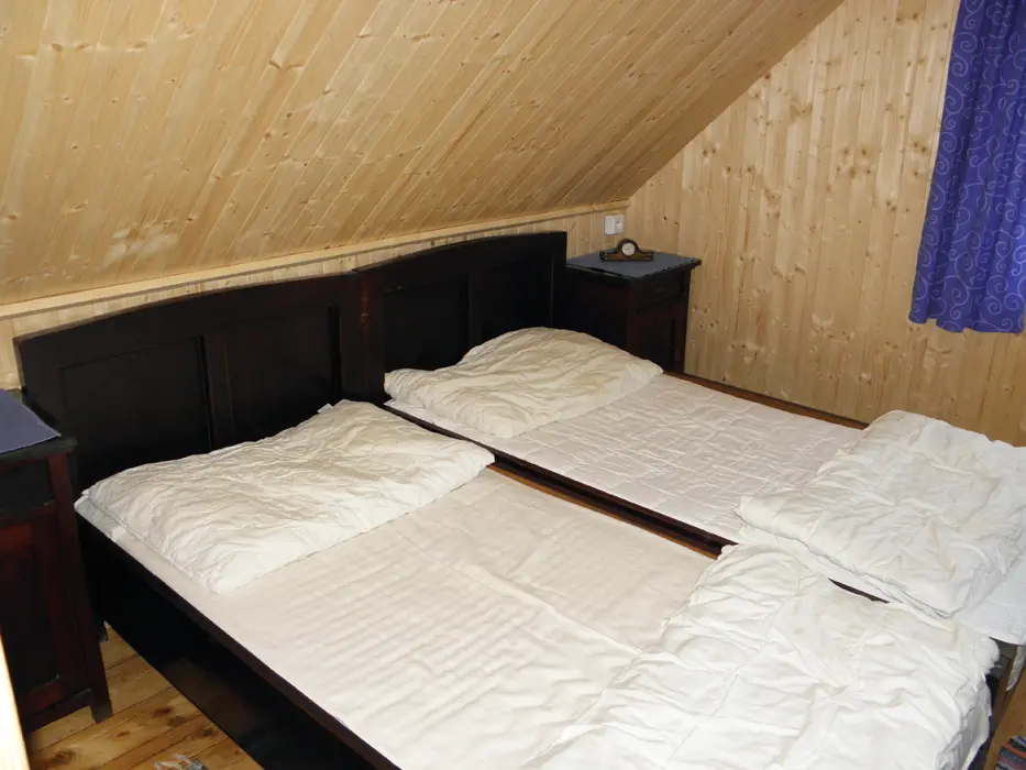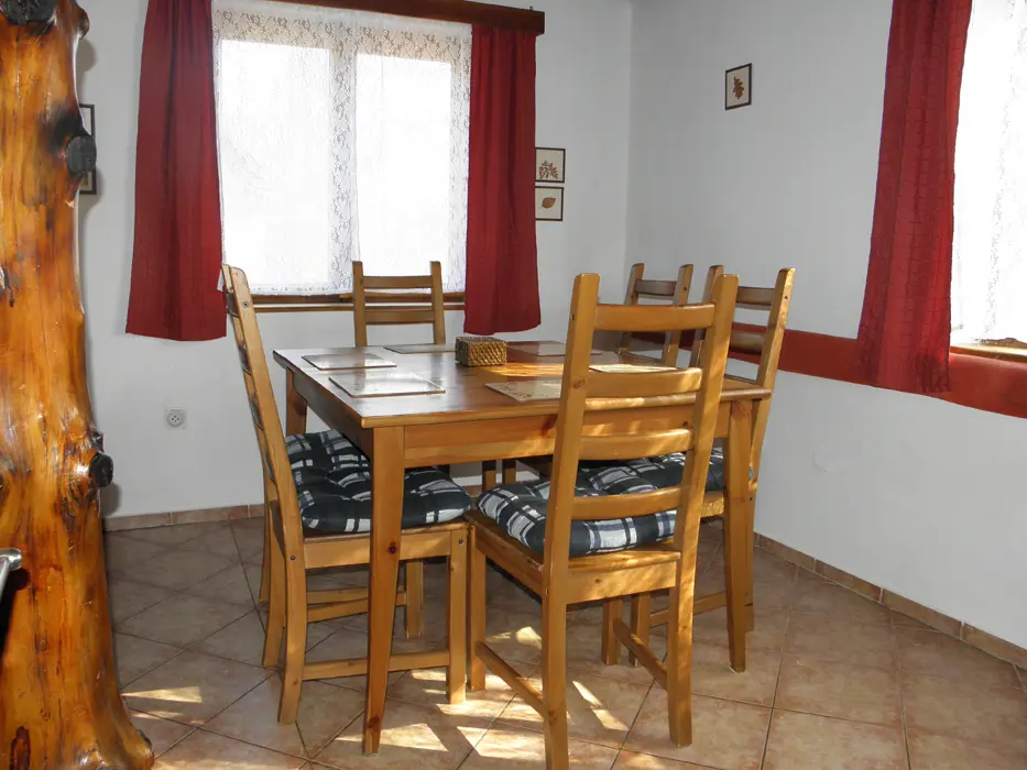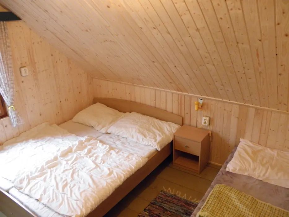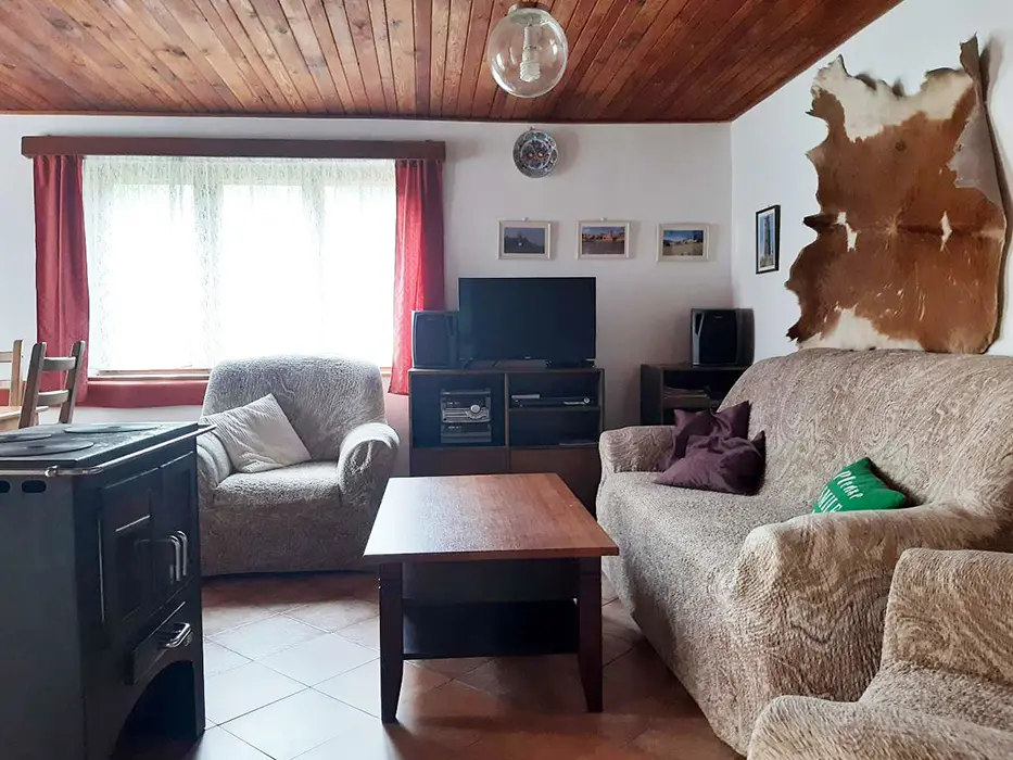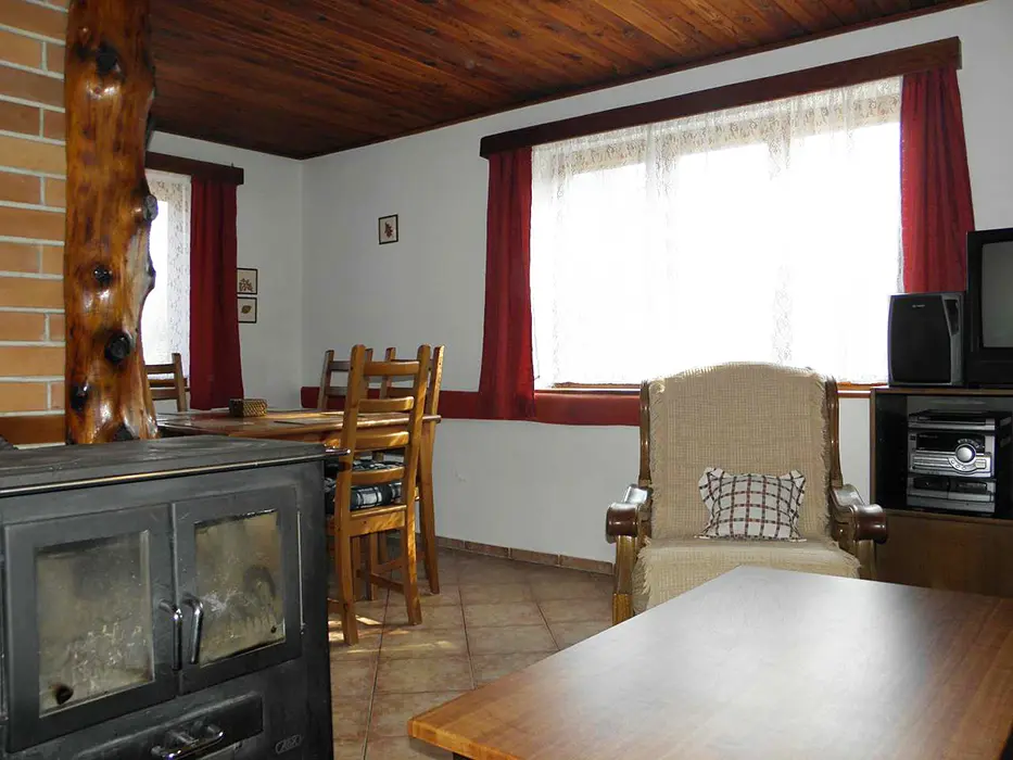 V přízemí obývací pokoj s posezením u krbových kamen, BTV, DVD + CD. Kuchyně - el. sporák se sklokeramickou deskou, varná konvice, lednice, mikrovlnka, základní nádobí. Voda je pitná po převaření. V patře 2 ložnice 1x3, 1x4 lůžka. Koupelna se sprchou + WC. Topení na tuhá paliva + elektřina