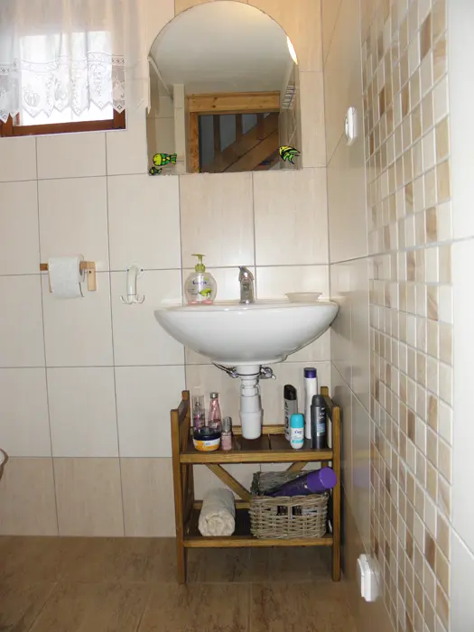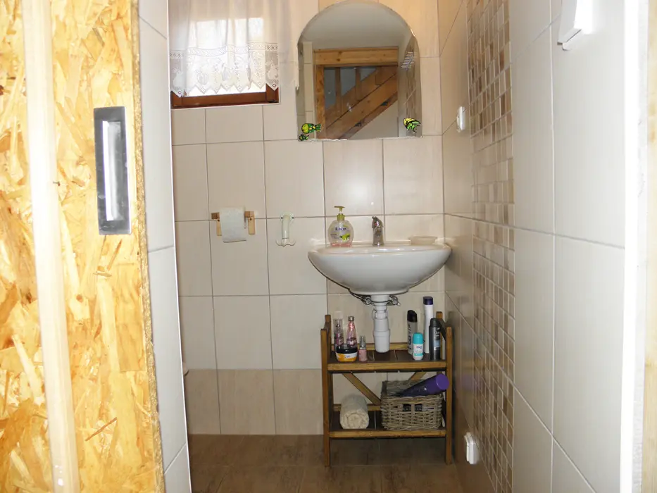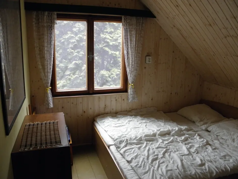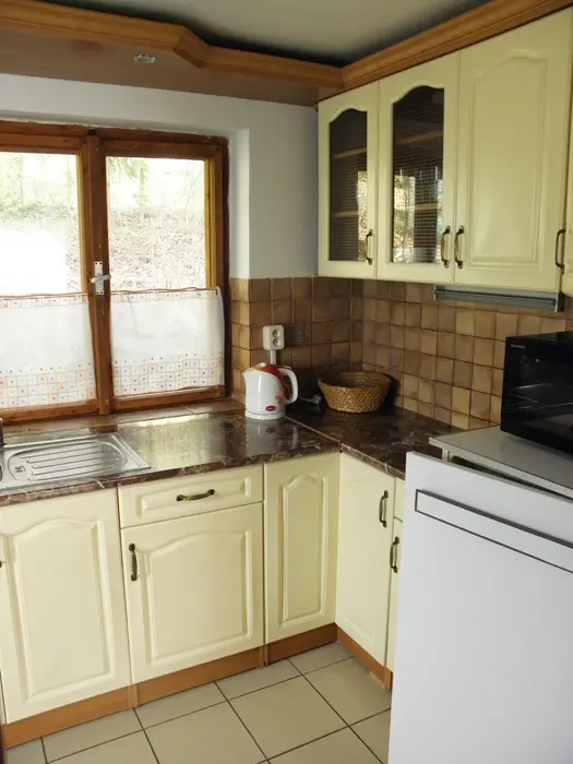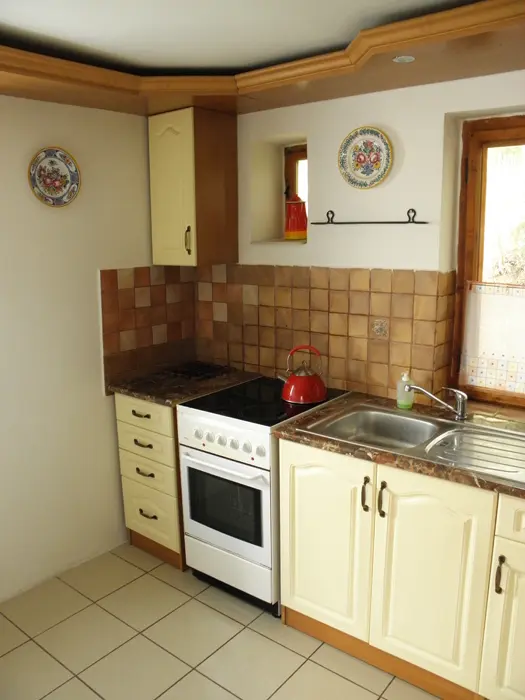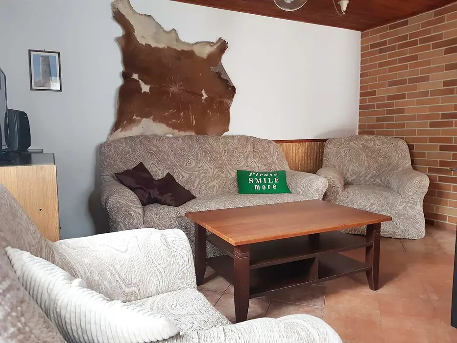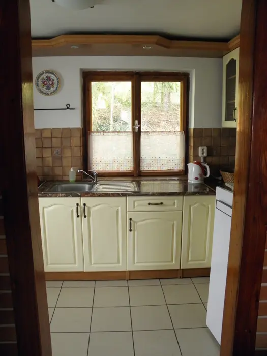 V přízemí obývací pokoj s posezením u krbových kamen, BTV, DVD + CD. Kuchyně - el. sporák se sklokeramickou deskou, varná konvice, lednice, mikrovlnka, základní nádobí. Voda je pitná po převaření. V patře 2 ložnice 1x3, 1x4 lůžka. Koupelna se sprchou + WC. Topení na tuhá paliva + elektřina
