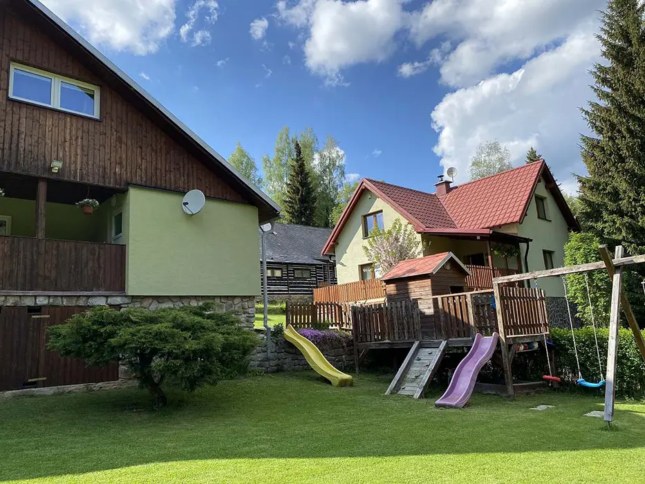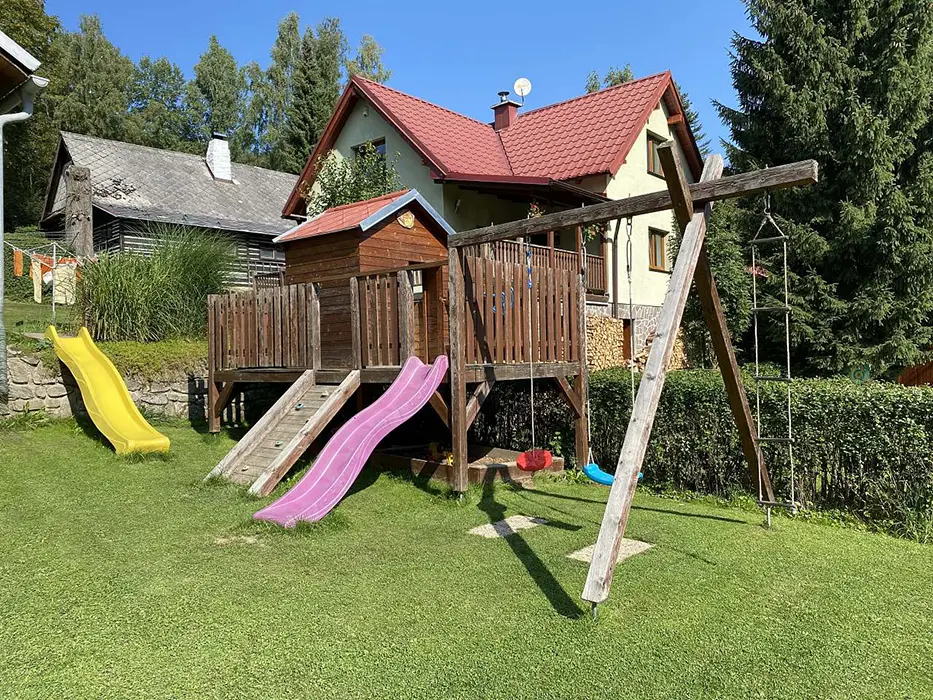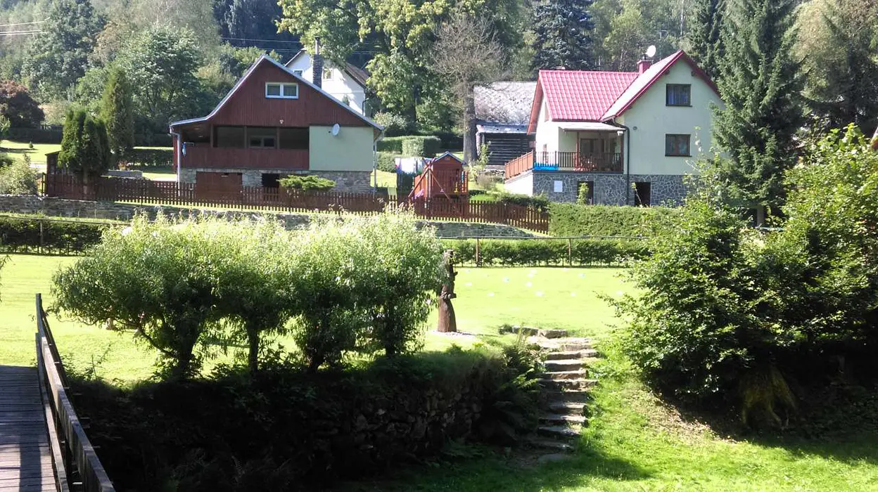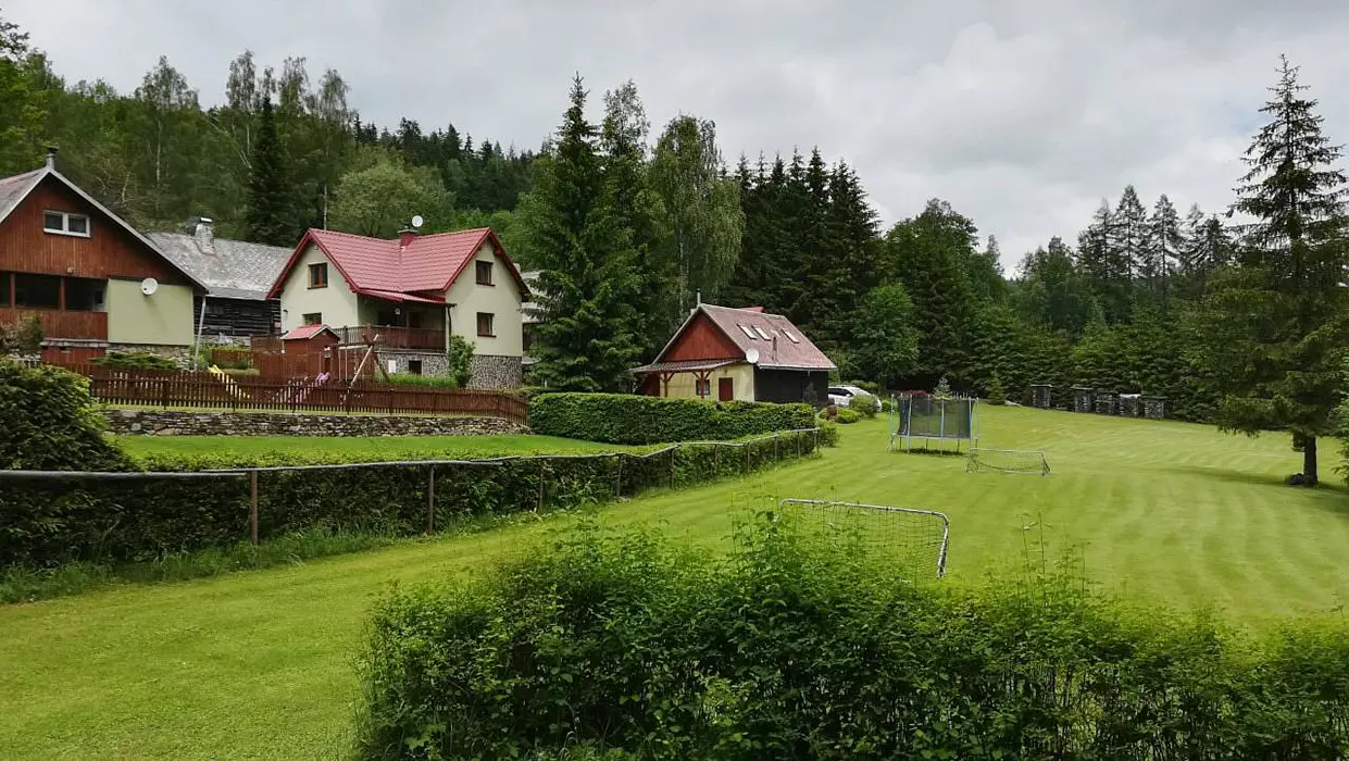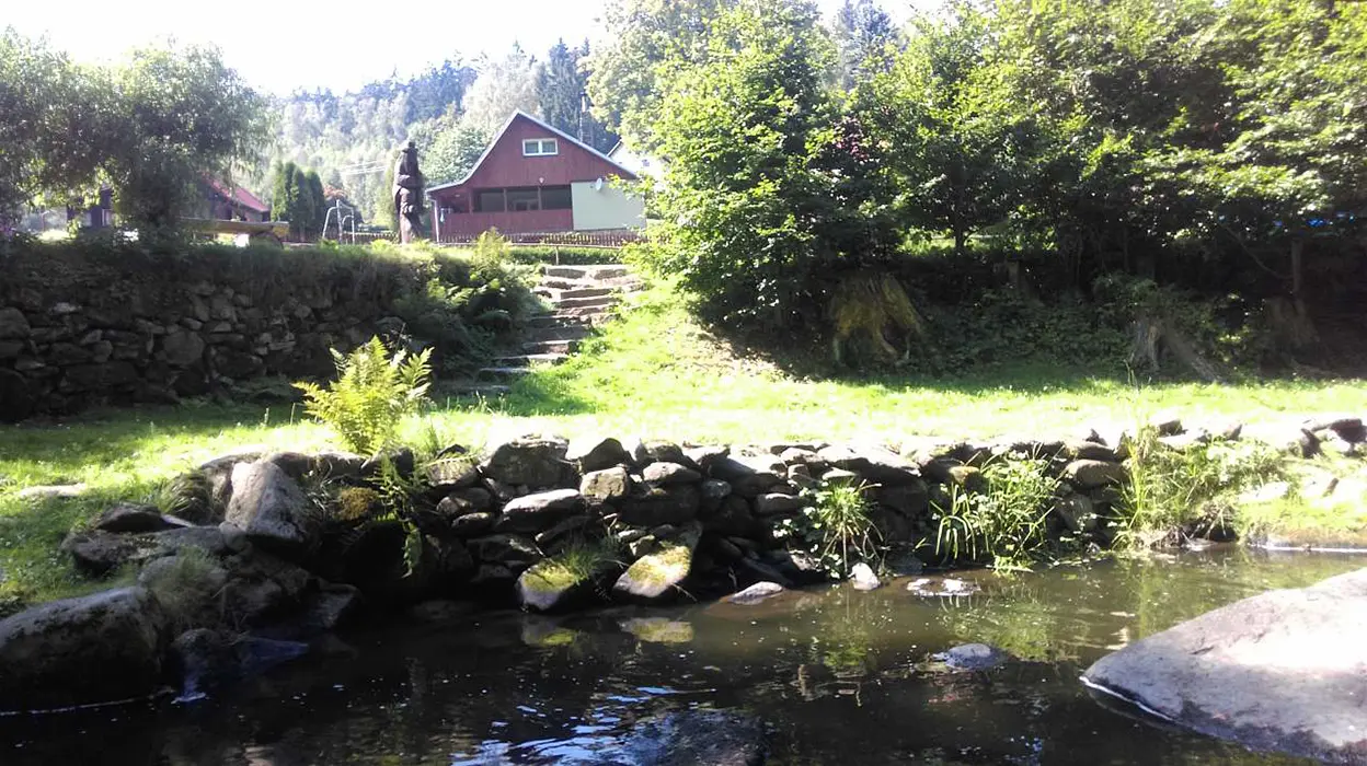 Na udržované a travnaté zahradě 4000 m2 - možnost míčových her, ohniště s posezením, k dispozici přenosný gril, pro děti prolézačka, dětské hřiště, trampolína, fotbal a branky, přes pozemek protéká řeka Svratka