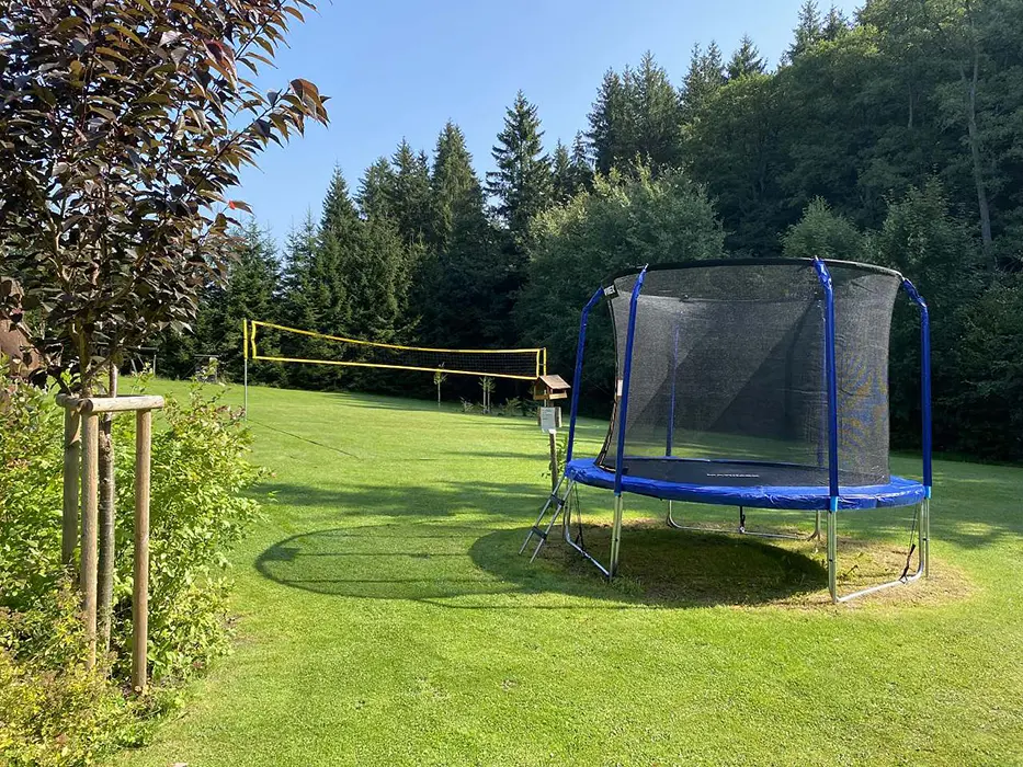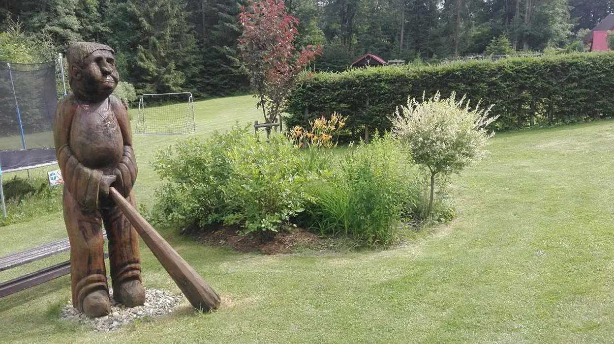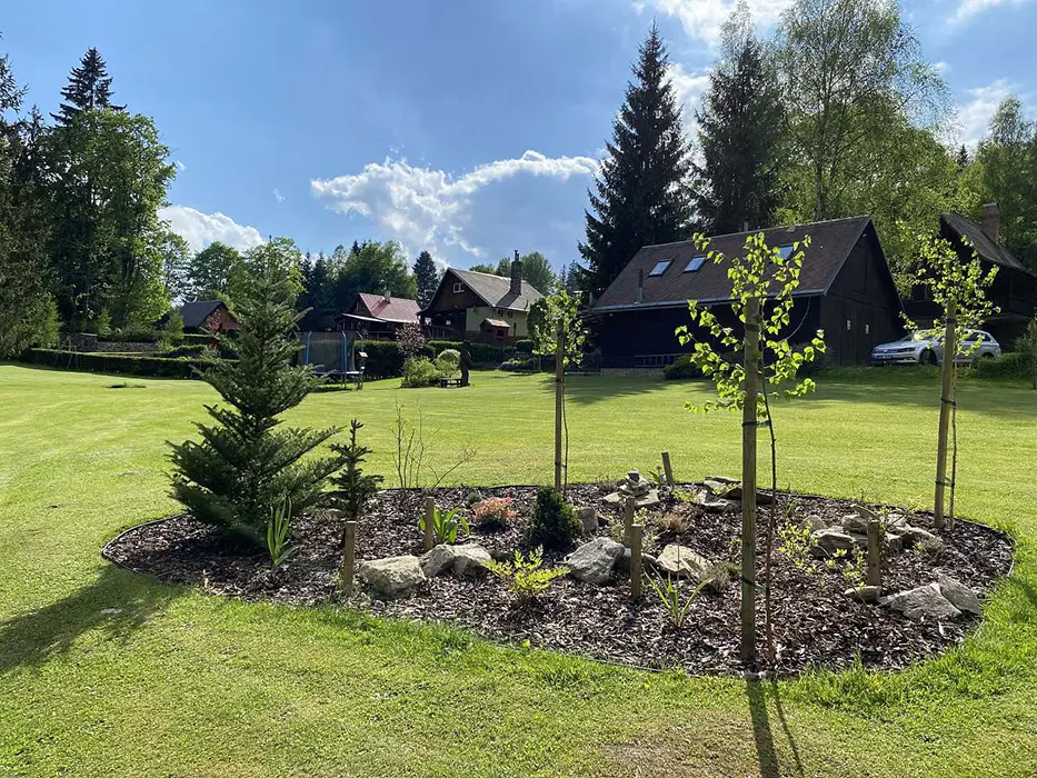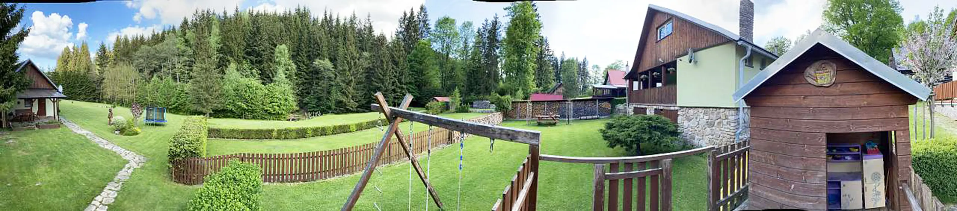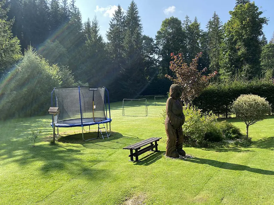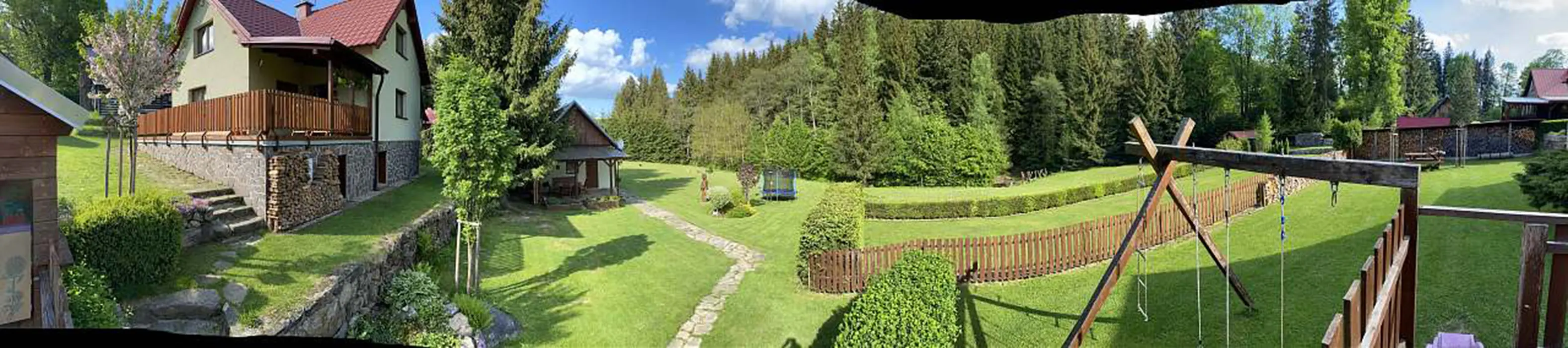 Na udržované a travnaté zahradě 4000 m2 - možnost míčových her, ohniště s posezením, k dispozici přenosný gril, pro děti prolézačka, dětské hřiště, trampolína, fotbal a branky, přes pozemek protéká řeka Svratka