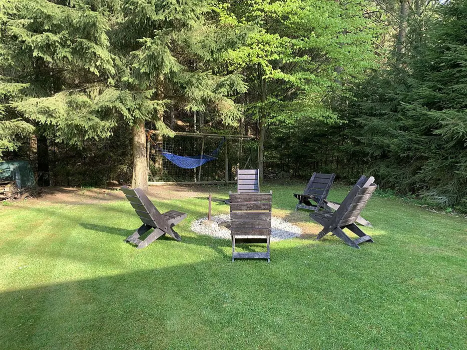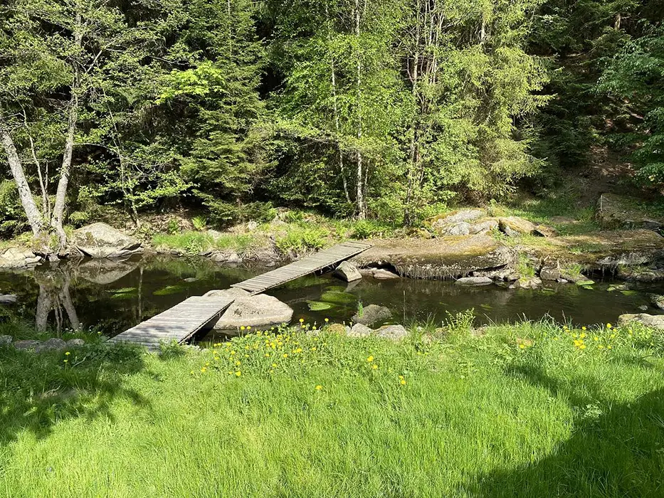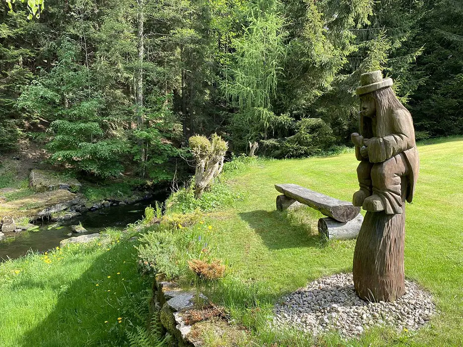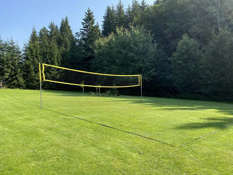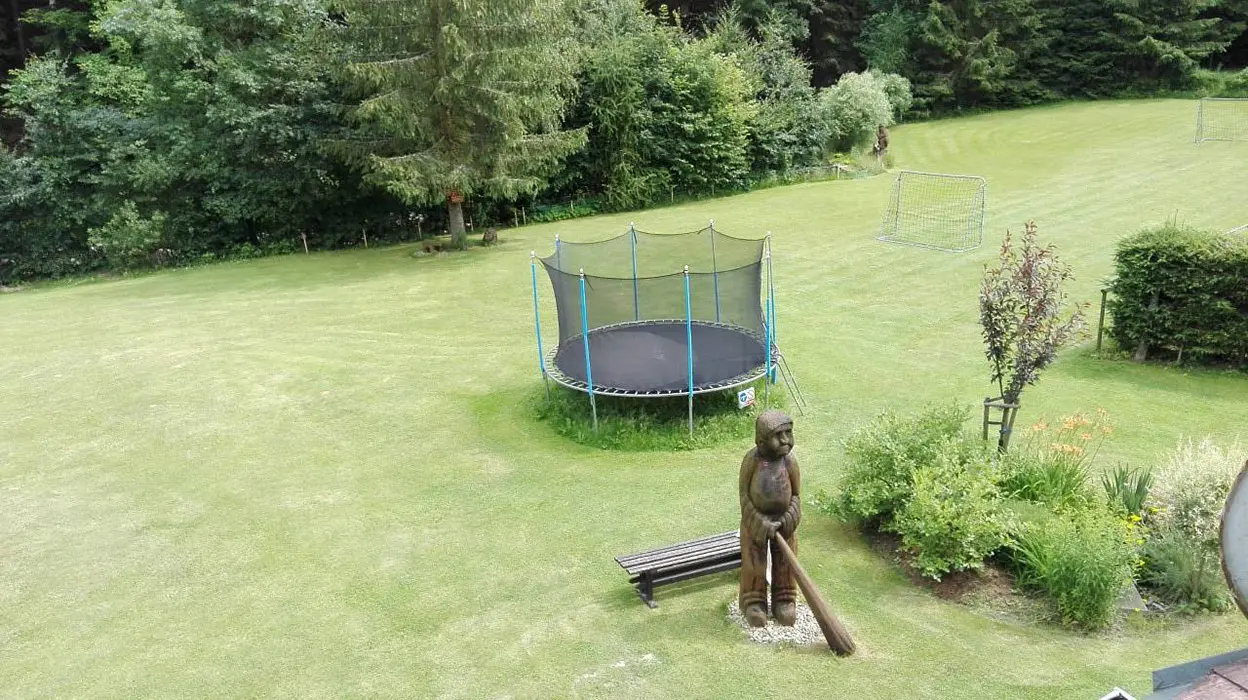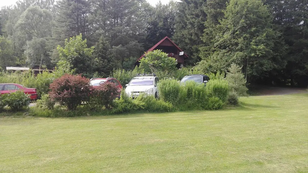 Na udržované a travnaté zahradě 4000 m2 - možnost míčových her, ohniště s posezením, k dispozici přenosný gril, pro děti prolézačka, dětské hřiště, trampolína, fotbal a branky, přes pozemek protéká řeka Svratka