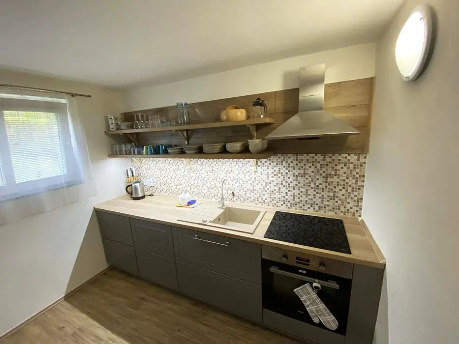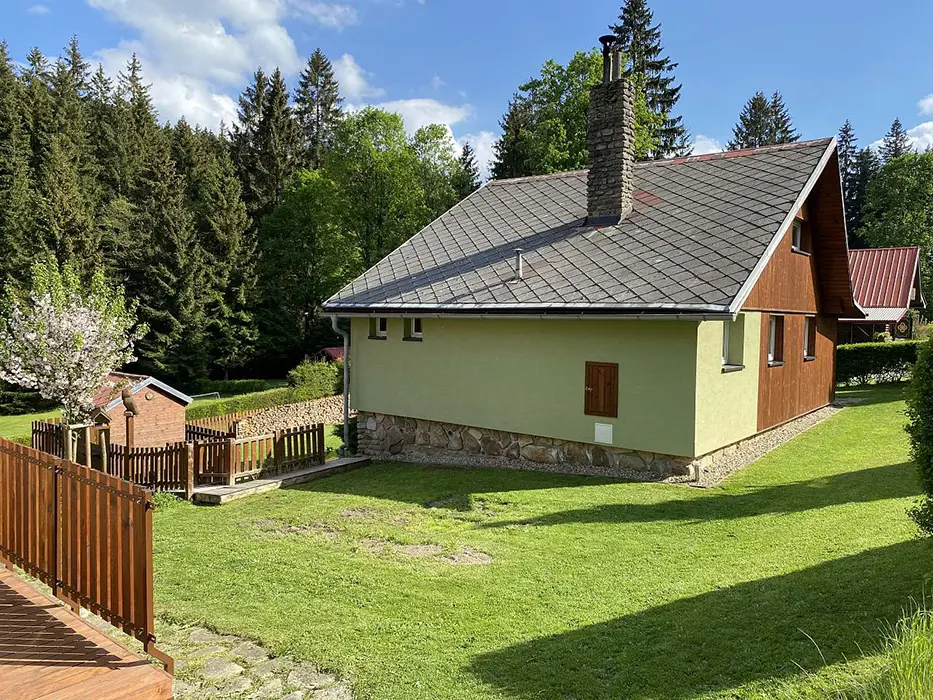 V přízemí - terasa s posezením, obytná místnost s jídelním koutem, krbová kamna, TV, sedací souprava. Samostatná kuchyně – lednice, varná deska, el. trouba, varná konvice a veškeré příslušenství. V podkroví - 2 ložnice 2x4 lůžka, k dispozici dětská postýlka. Soc. zařízení - koupelna se sprchou, WC. Topení - el. přímotopy nebo tuhá paliva - krbová kamna