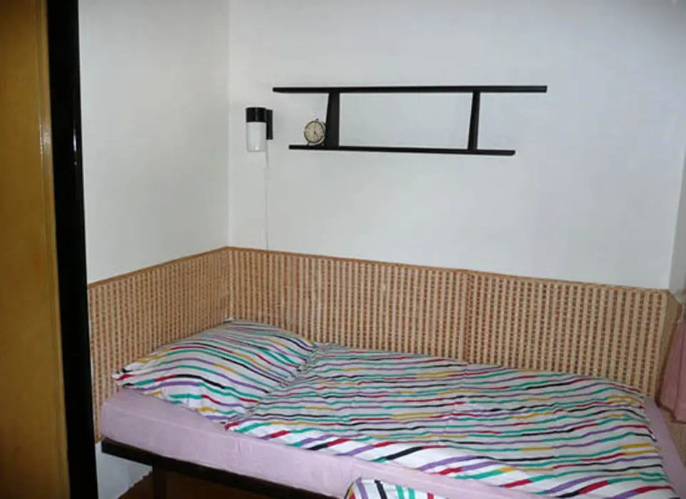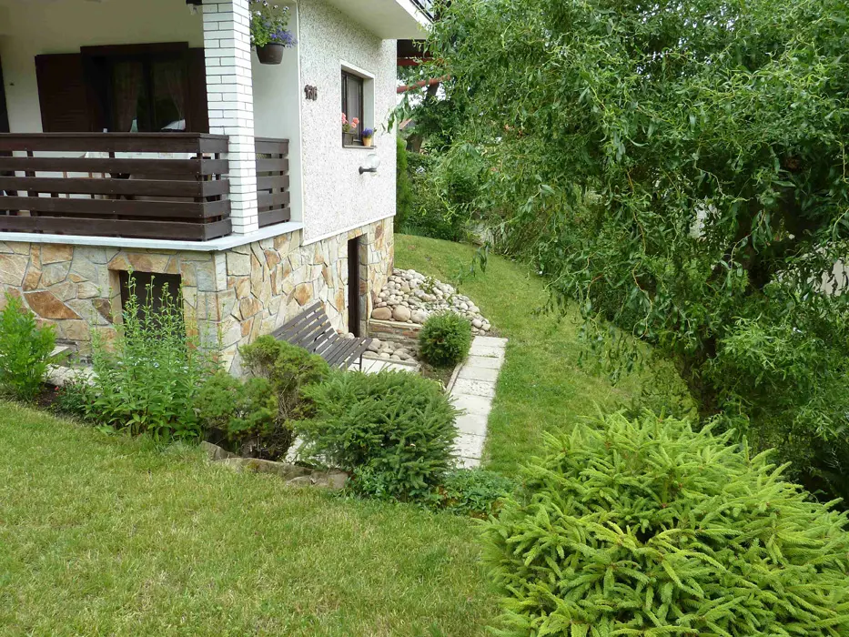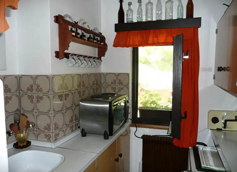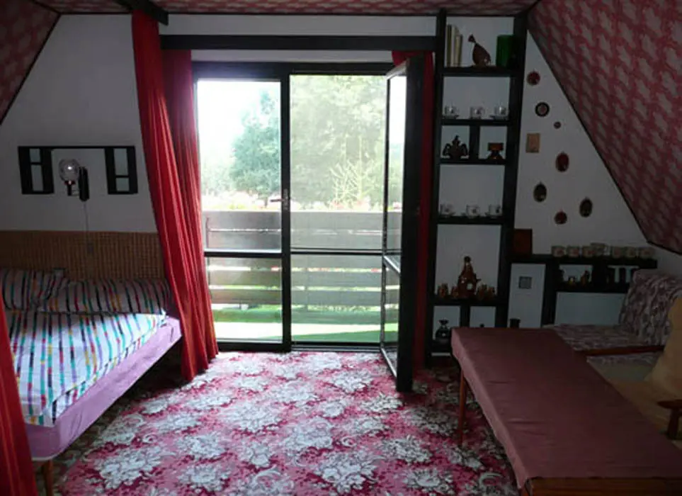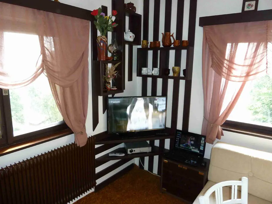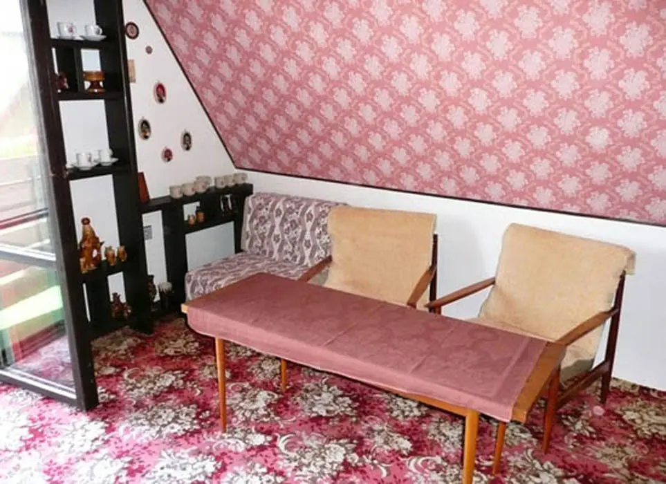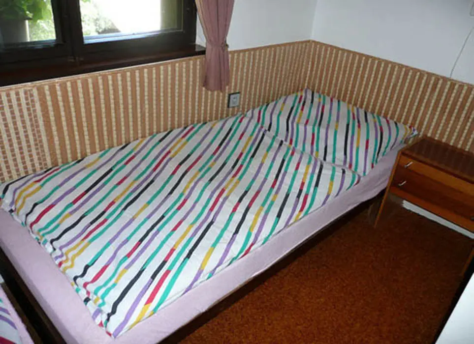Obývací pokoj - sedací souprava, stůl a židle, TV+SAT, navazuje malá kuchyňka - varná deska, trouba, remoska, lednice, mikrovlnka, varná konvice, základní nádobí. V patře 2 ložnice 2x2 lůžka + 1 přistýlka, jedna ložnice má balkon. Koupelna se sprchou + WC, umyvadlo, teplá voda. Topení - centrální