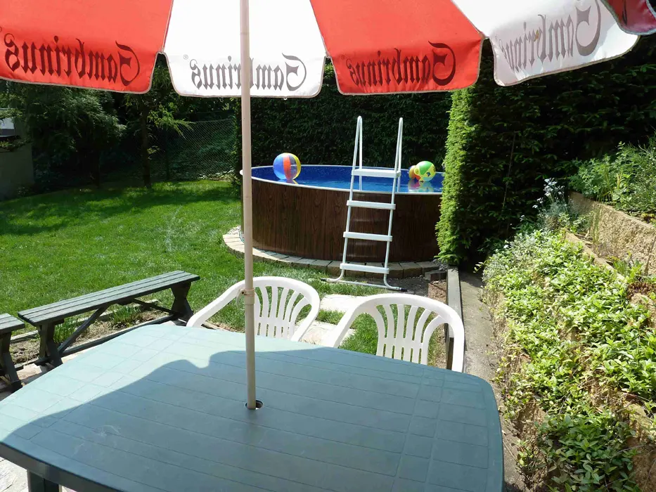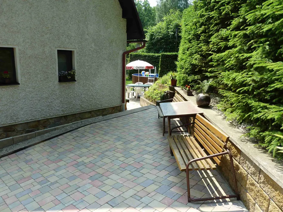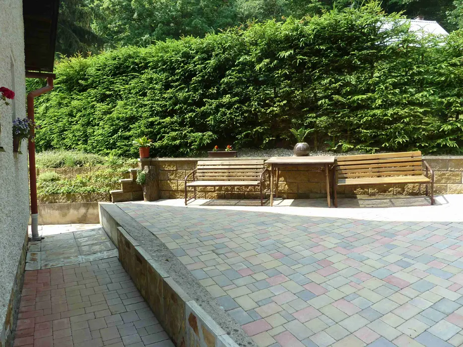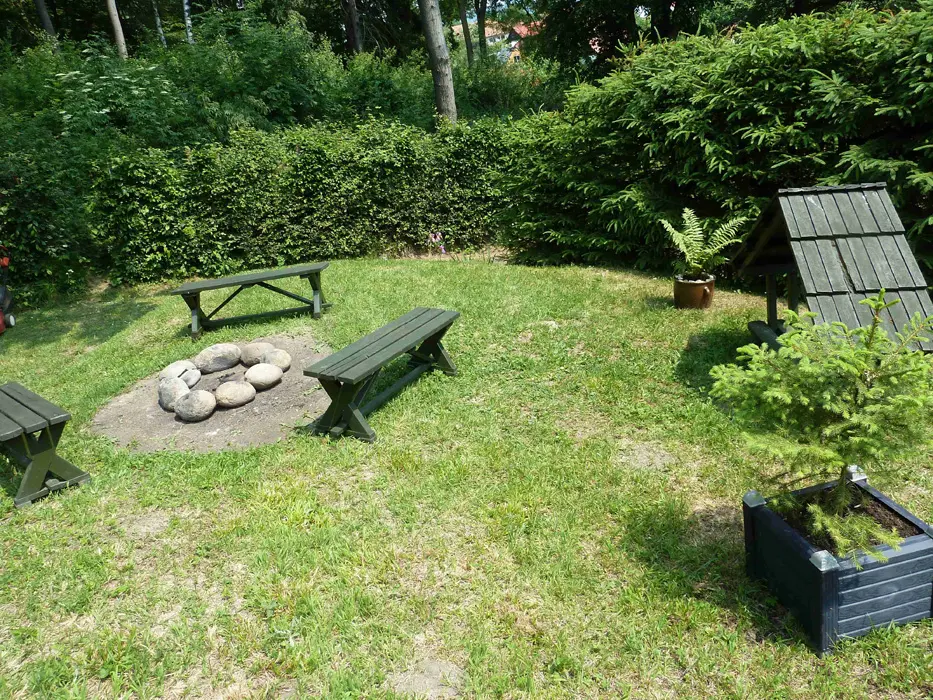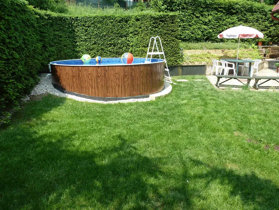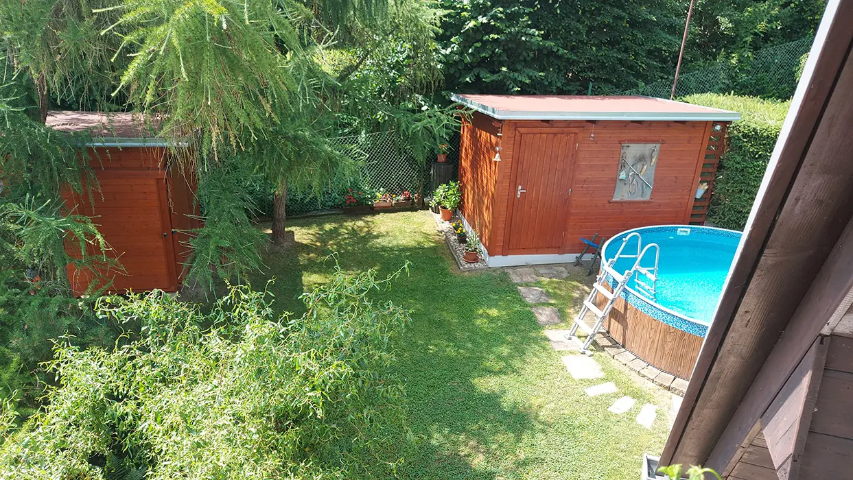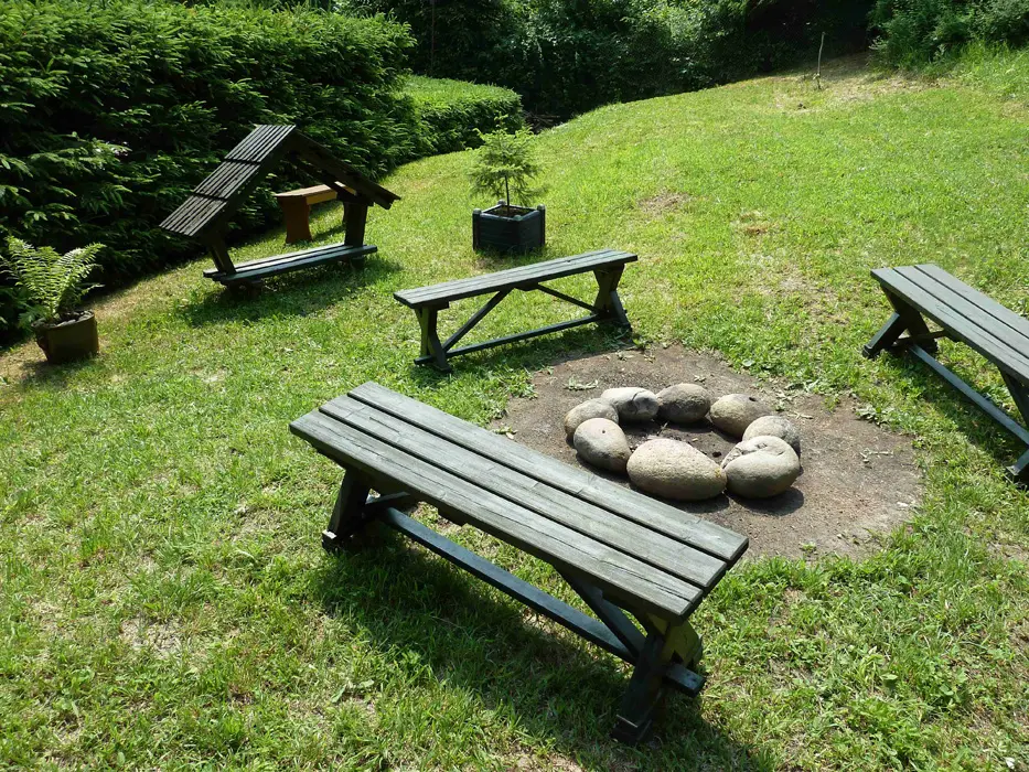 Ohniště s posezením, krb, gril, kryté posezení u chaty + zahradní nábytek, bazén