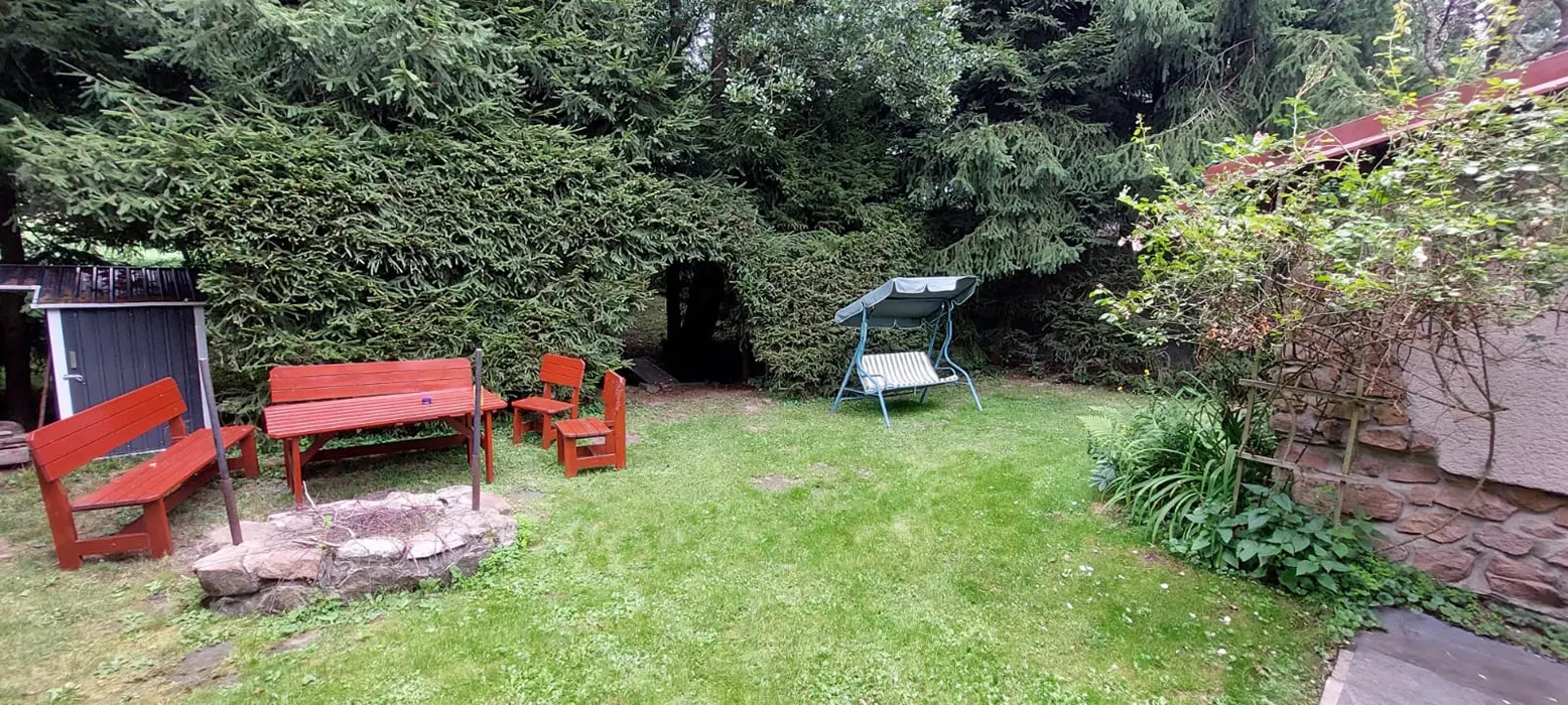 Ohniště s posezením, venkovní gril, zahradní houpačka, nadzemní kruhový bazén o průměru 3,5 m, možnost uschování kol v chatě, kolem pozemku živý plot