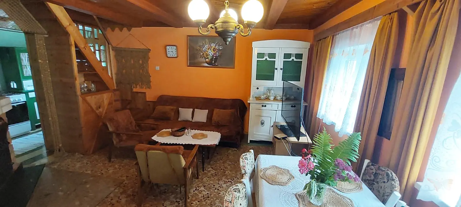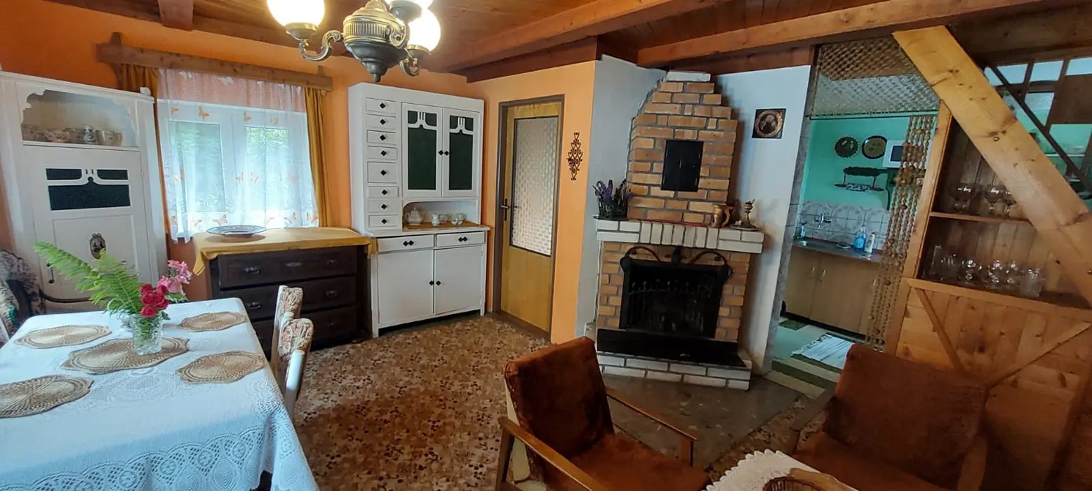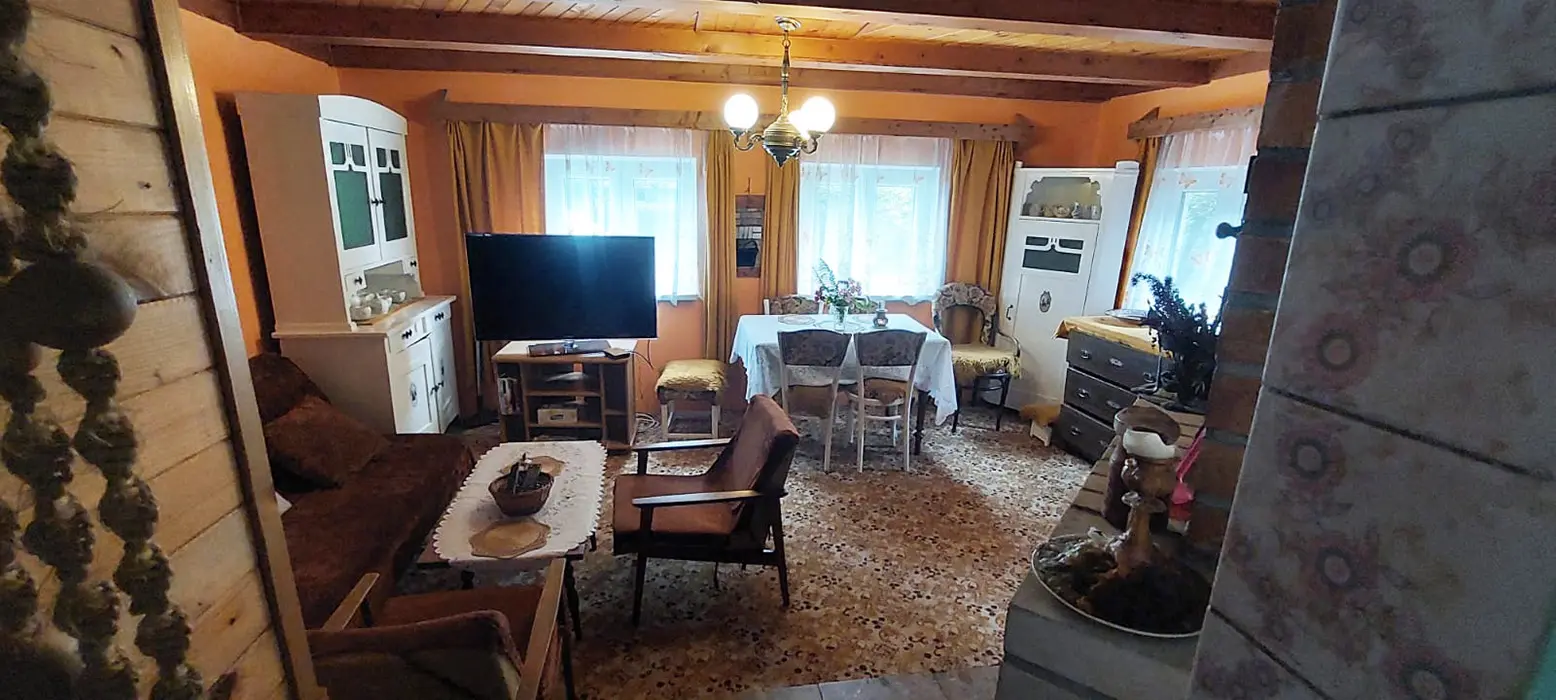 Obývací pokoj s posezením u krbu, TV, malá kuchyňka - mikrovlnka, varná konvice, kombinovaný sporák, lednice, veškeré nádobí, tlak.hrnec, remoska. V patře 2 ložnice 1x2, 1x4 lůžka + 1 přistýlka. Balkon s posezením. Soc. zařízení - koupelna s vanou, WC v koupelně. Teplá voda v celém objektu. Topení - krbová kamna