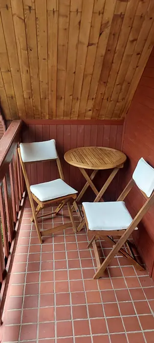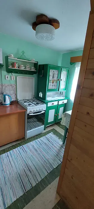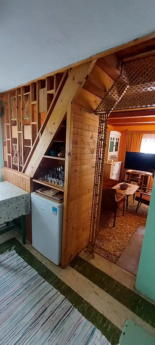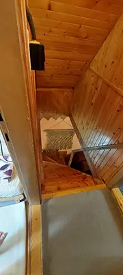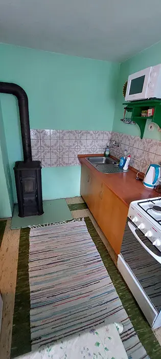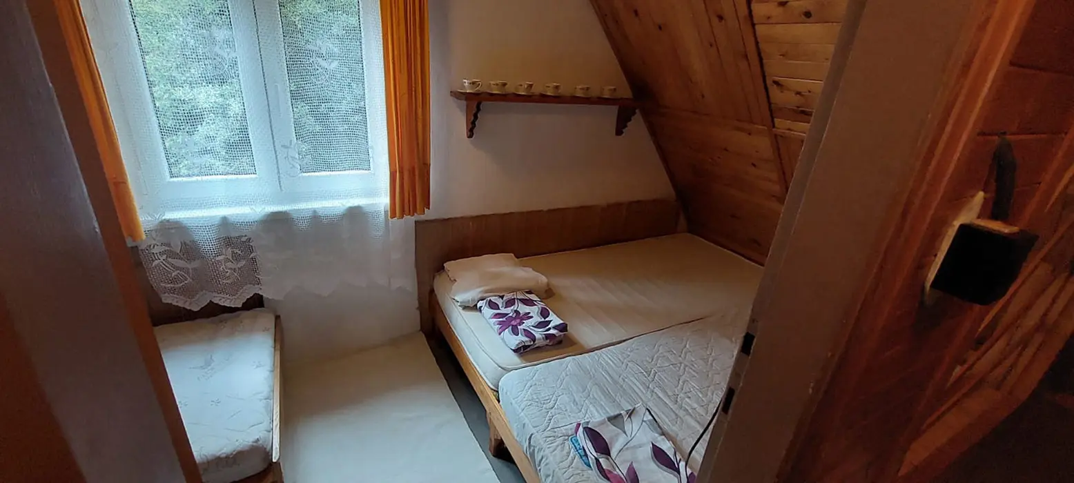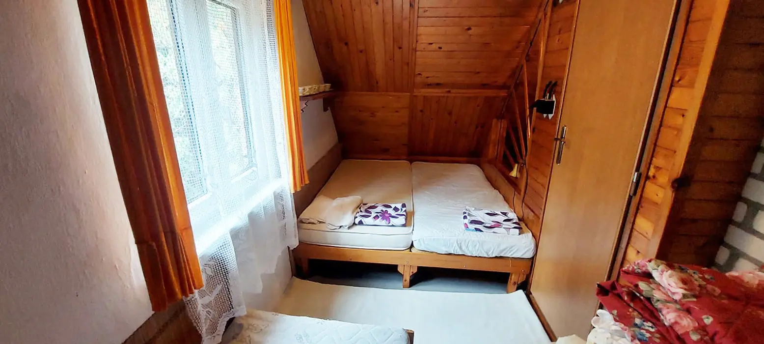 Obývací pokoj s posezením u krbu, TV, malá kuchyňka - mikrovlnka, varná konvice, kombinovaný sporák, lednice, veškeré nádobí, tlak.hrnec, remoska. V patře 2 ložnice 1x2, 1x4 lůžka + 1 přistýlka. Balkon s posezením. Soc. zařízení - koupelna s vanou, WC v koupelně. Teplá voda v celém objektu. Topení - krbová kamna