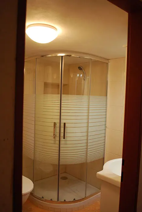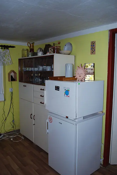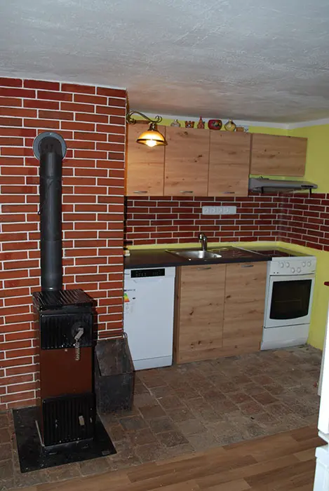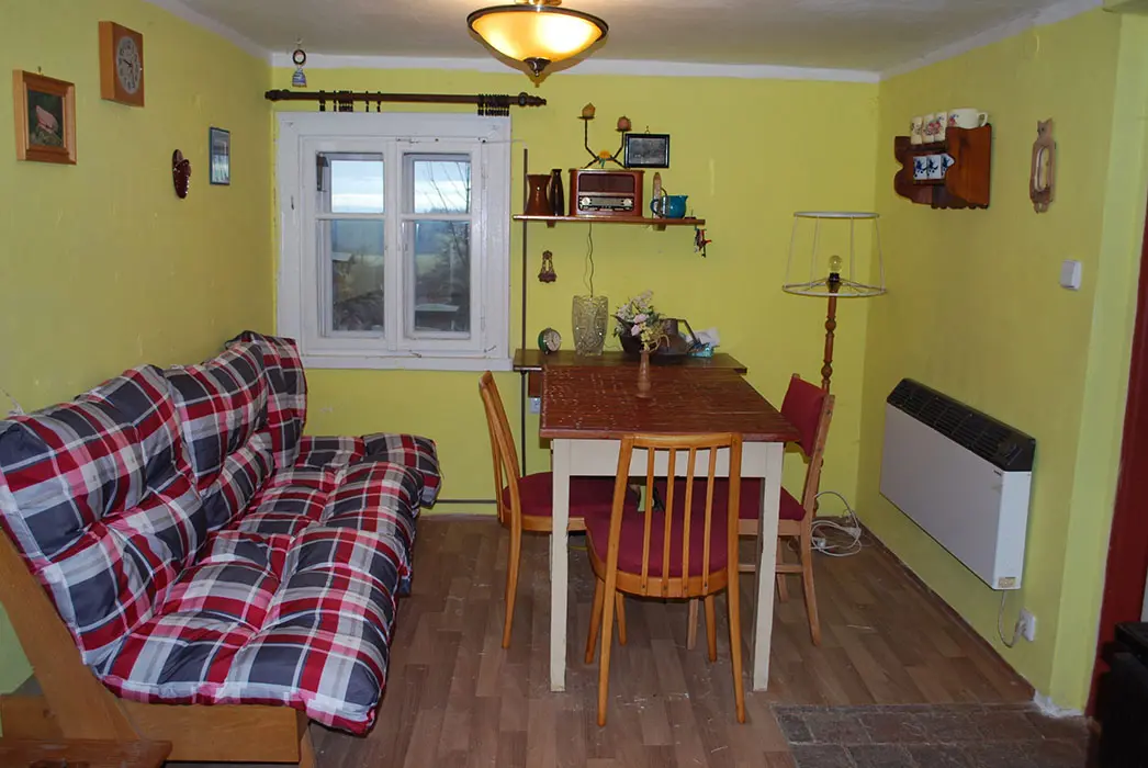 Obytná místnost spojená s kuchyní - sedačka - 1 přistýlka, jídelní stůl a židle, TV, el. sporák, myčka, varná konvice, kávovar, lednice s mrazákem, nádobí. 2 ložnice - 1x2, 1x4 lůžka. Soc. zařízení - sprchový kout, umyvadlo, teplá voda, WC v koupelně. Topení - el. přímotopy, v koupelně podlahové topení
