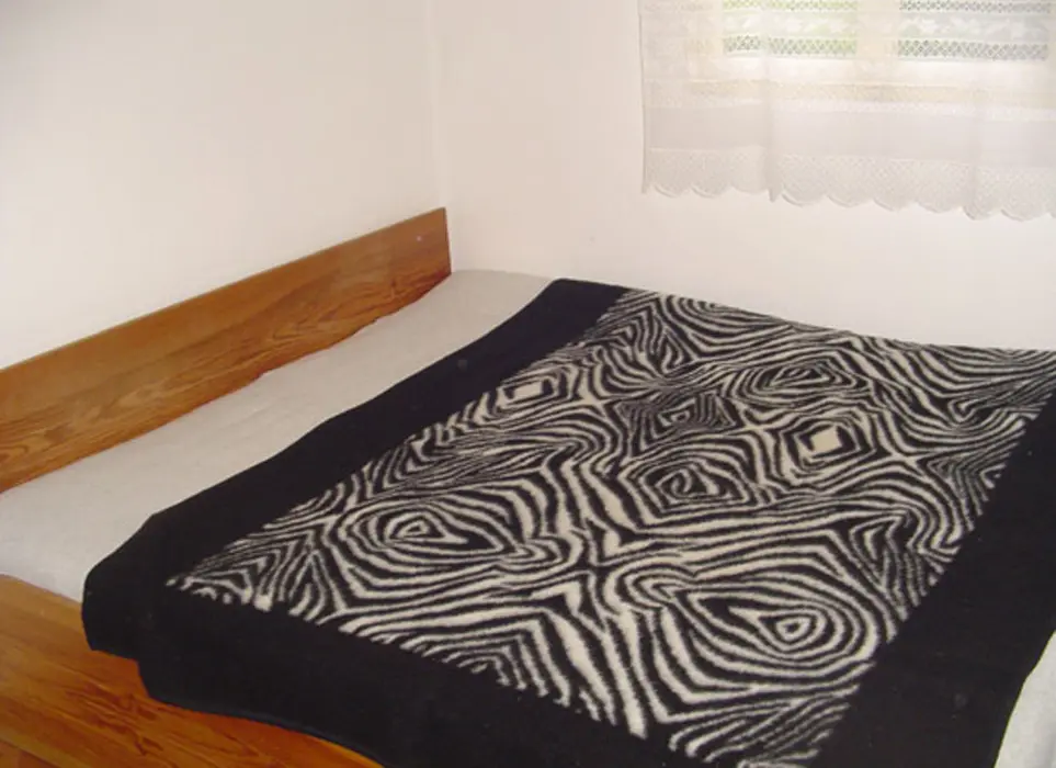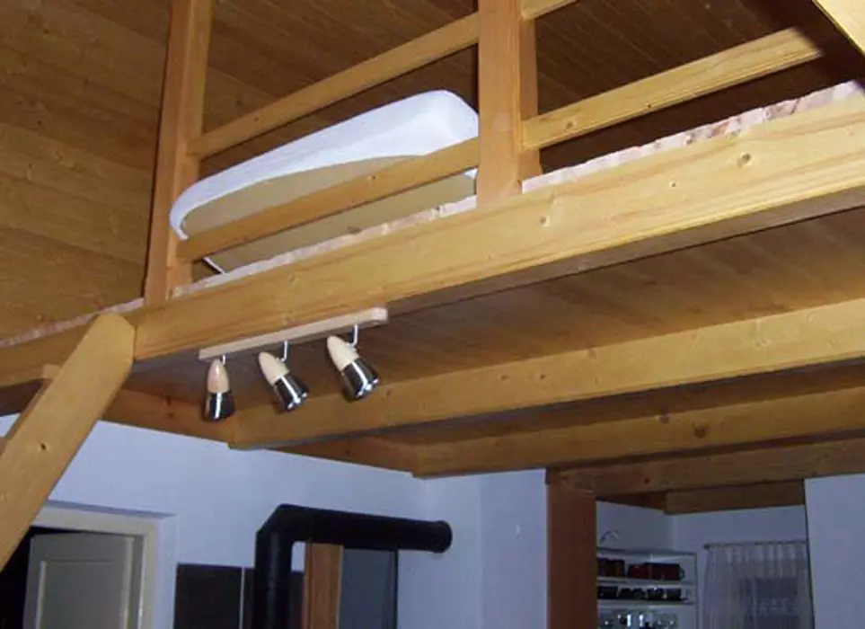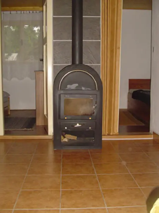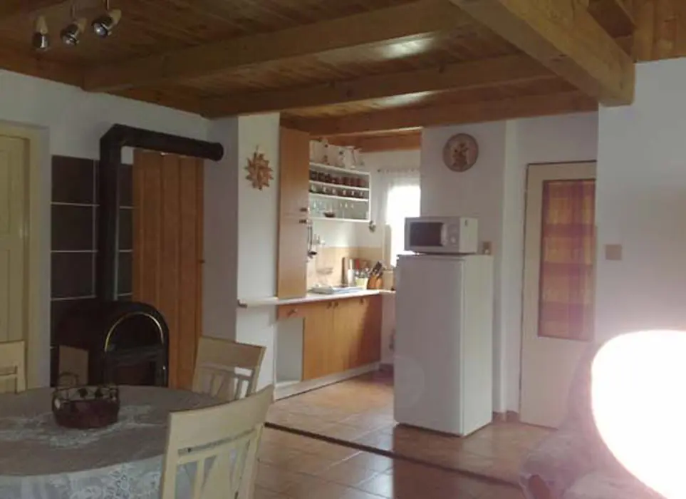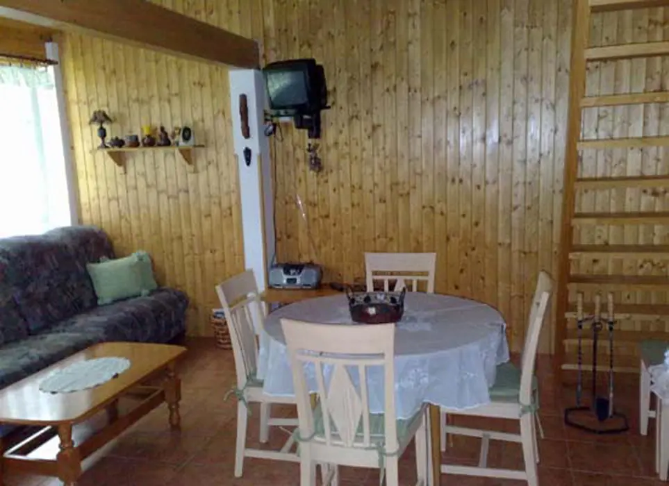 Obývací pokoj s posezením, krbová kamna, TV, nad obývákem je prostor na spaní – prudké schody - 2 lůžka, samostatná kuchyně – indukční vařič, rychlovarná konvice, mikrovlnka, nádobí, lednice. 2 ložnice 2x2 lůžka. Samostatné WC, koupelna se sprchou. Topení na tuhá paliva