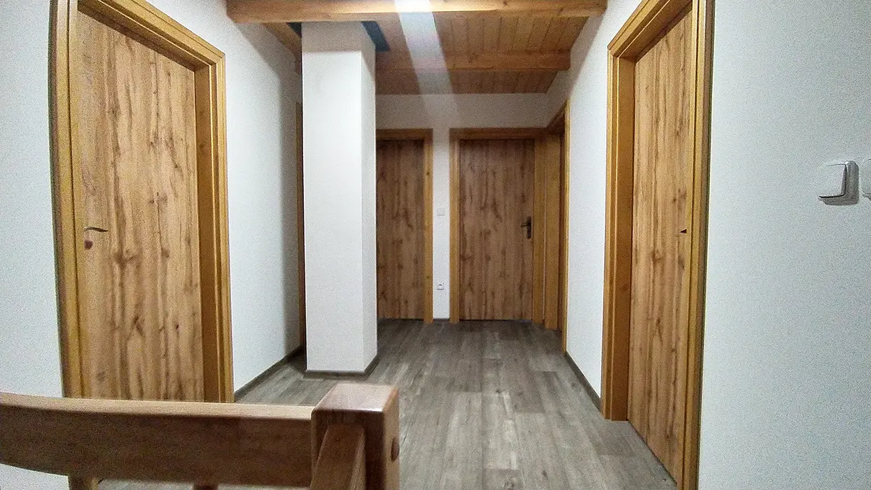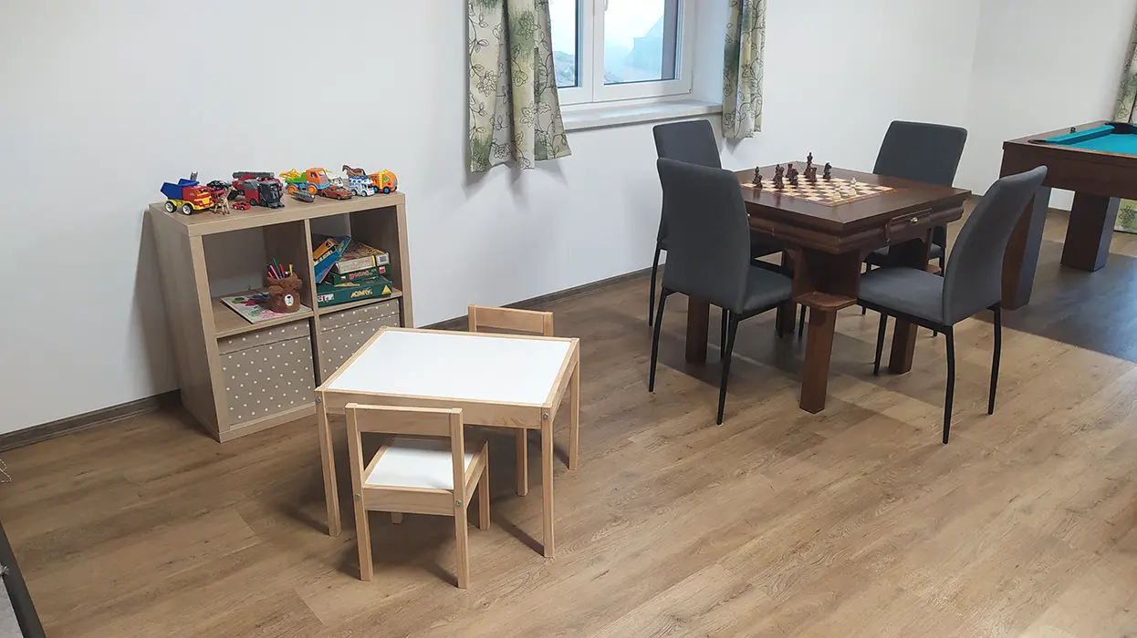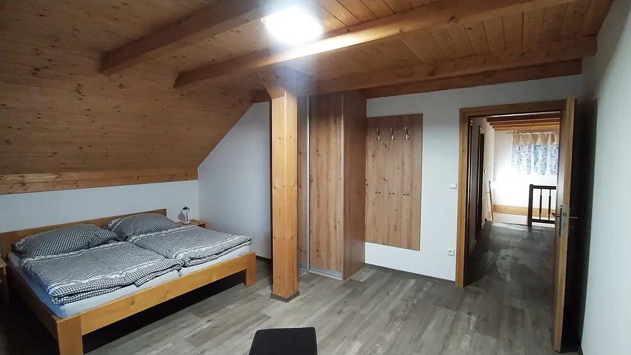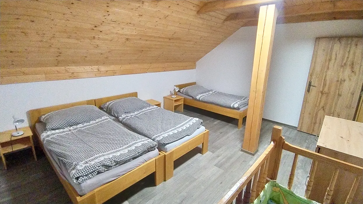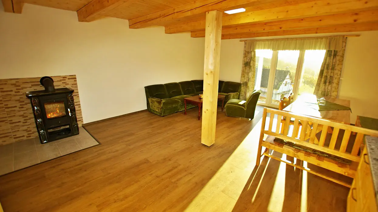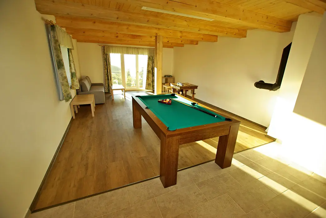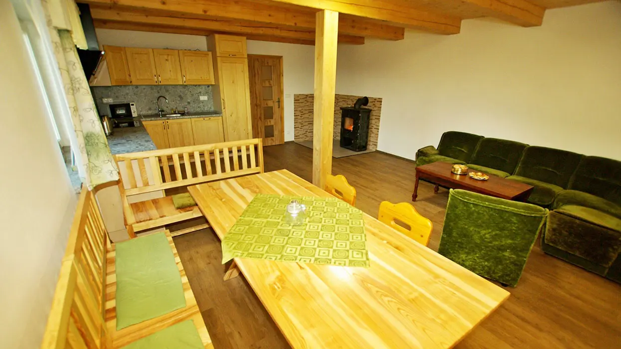 V přízemí - prostorná společenská místnost s posezením, LCDTV, krbová kamna + jídelní stůl a židle - spojená s kuchyní - el. sporák, varná deska, mikrovlnka, myčka, lednice, varná konvice, nádobí. Dále v přízemí - wellness centrum, herní místnost - stylový šachový a karetní stůl, kulečník a koutek pro děti - viz foto č. 15+16+17+18. V patře 4 ložnice - 2x3, 2x4 lůžka, k dispozici dětská postýlka. Soc. zařízení - 2x sprcha, 2x WC. Topení - tepelné čerpadlo, krbová kamna