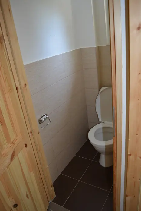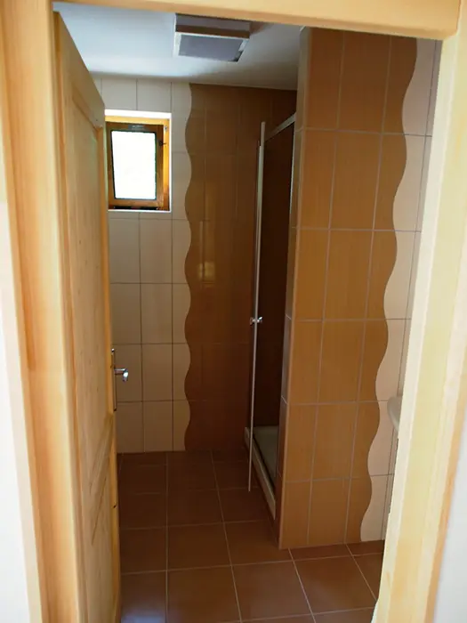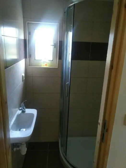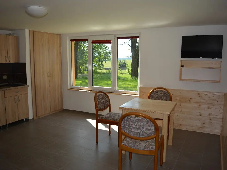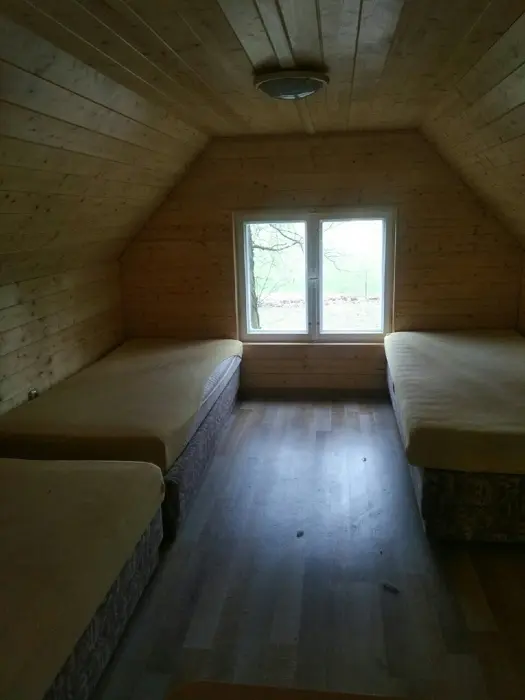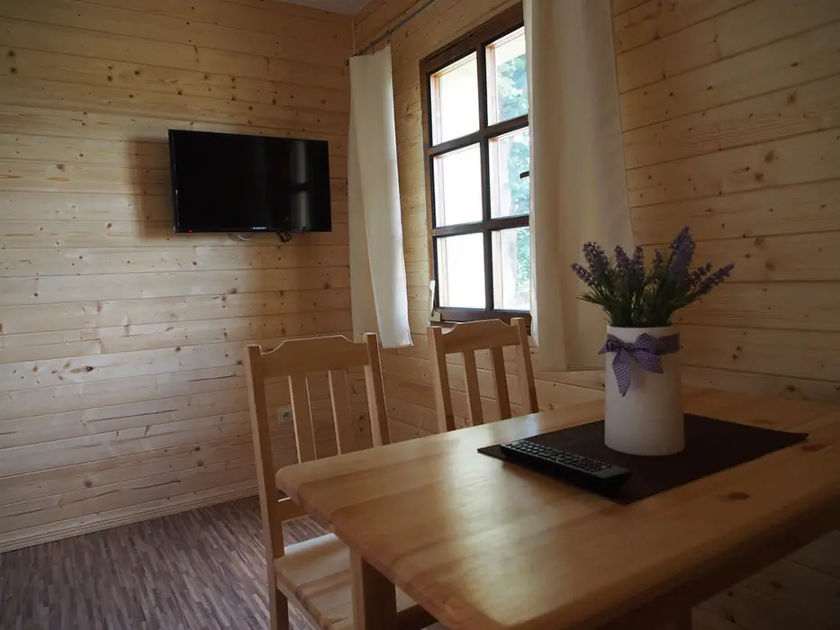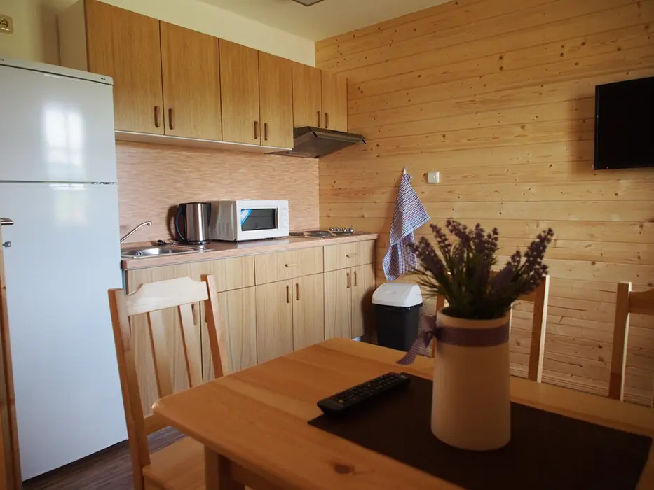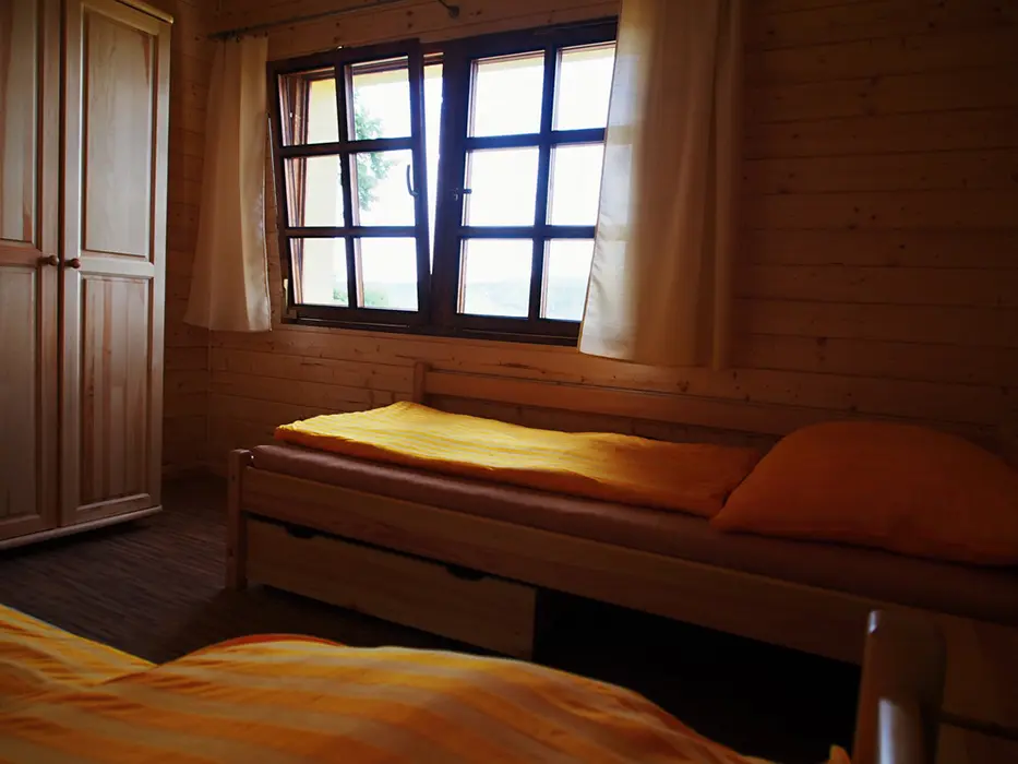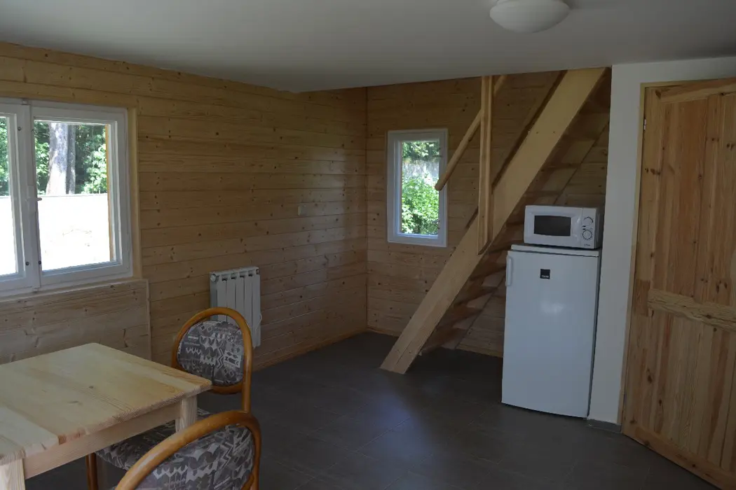 3 chatky ( 3 lůžka + 1 přistýlka ) - v přízemí obývací pokoj s posezením, rozkládací sedačka - 1 přistýlka, kuchyňský kout - elektrický 4-plotýnkový vařič, trouba, mikrovlnná trouba, lednice s mrazákem, jídelní stůl, židle. V podkroví - mlynářské schody - 1 ložnice 1x3 lůžka. Sociální zařízení - sprchový kout, teplá voda z vlastního bojleru, samostatné WC. Topení - přímotopné radiátory. VIZ FOTO 15-24