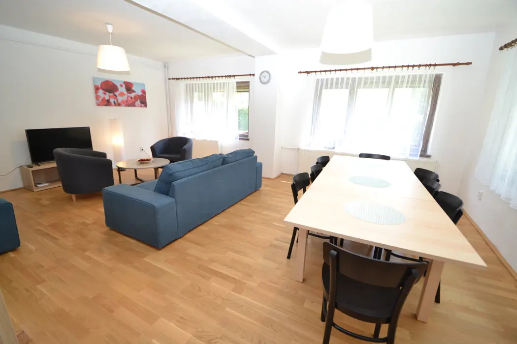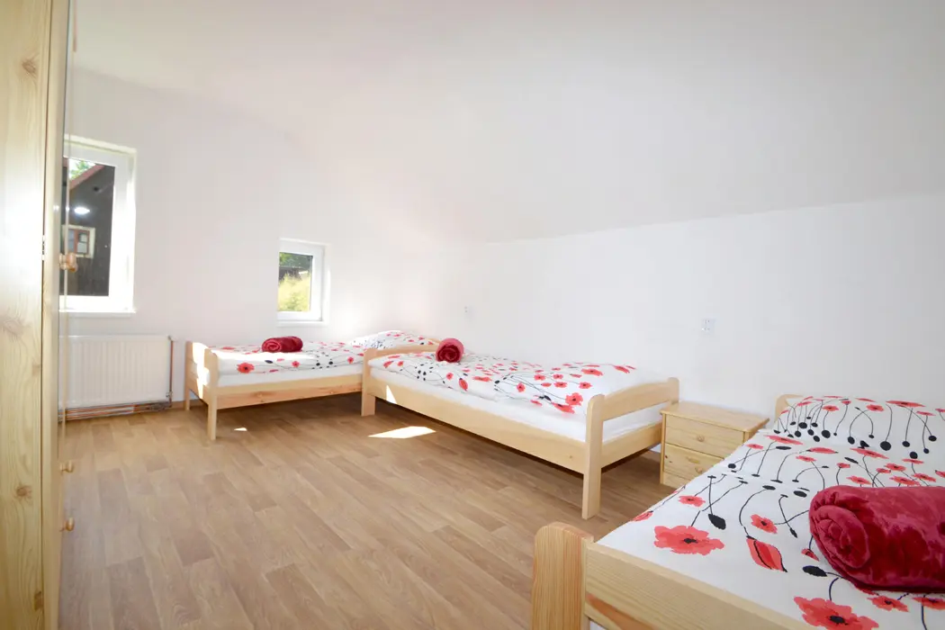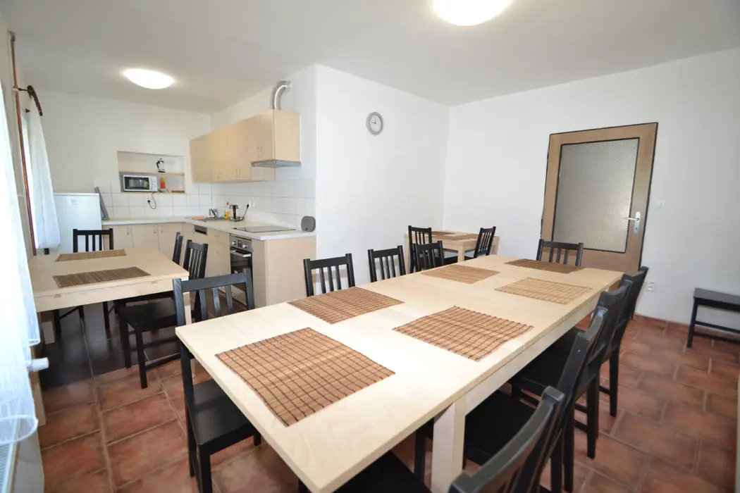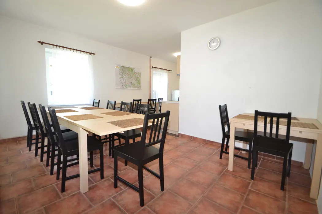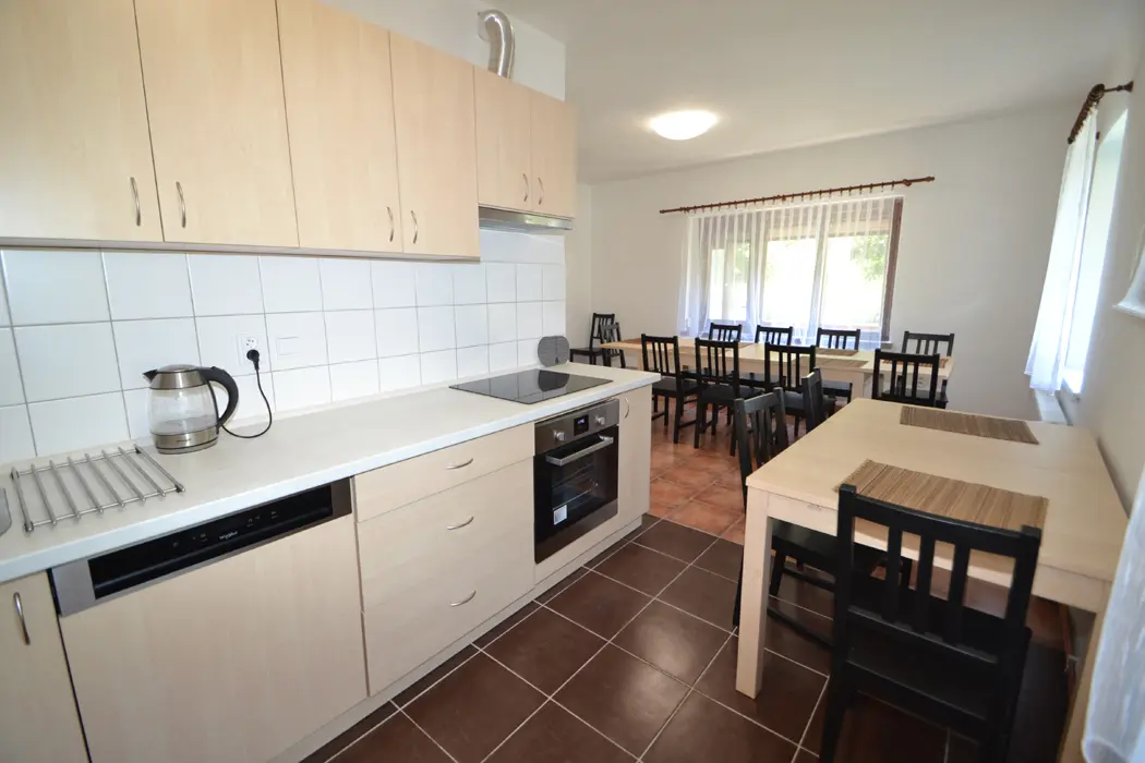 V přízemí velká společenská místnost, stoly, židle, sedací soupravy, spojeno s kuchyní - el. varná deska + sporák, lednice, varná konvice, mikrovlnka, myčka, nádobí na počet osob. V podkroví 4 samostatné ložnice - v každé 3-4 lůžka. Sociální zařízení - 3x sprcha, 3x samostatné WC. Topení - ústřední napojené na elektrokotel