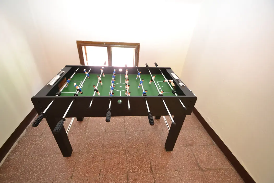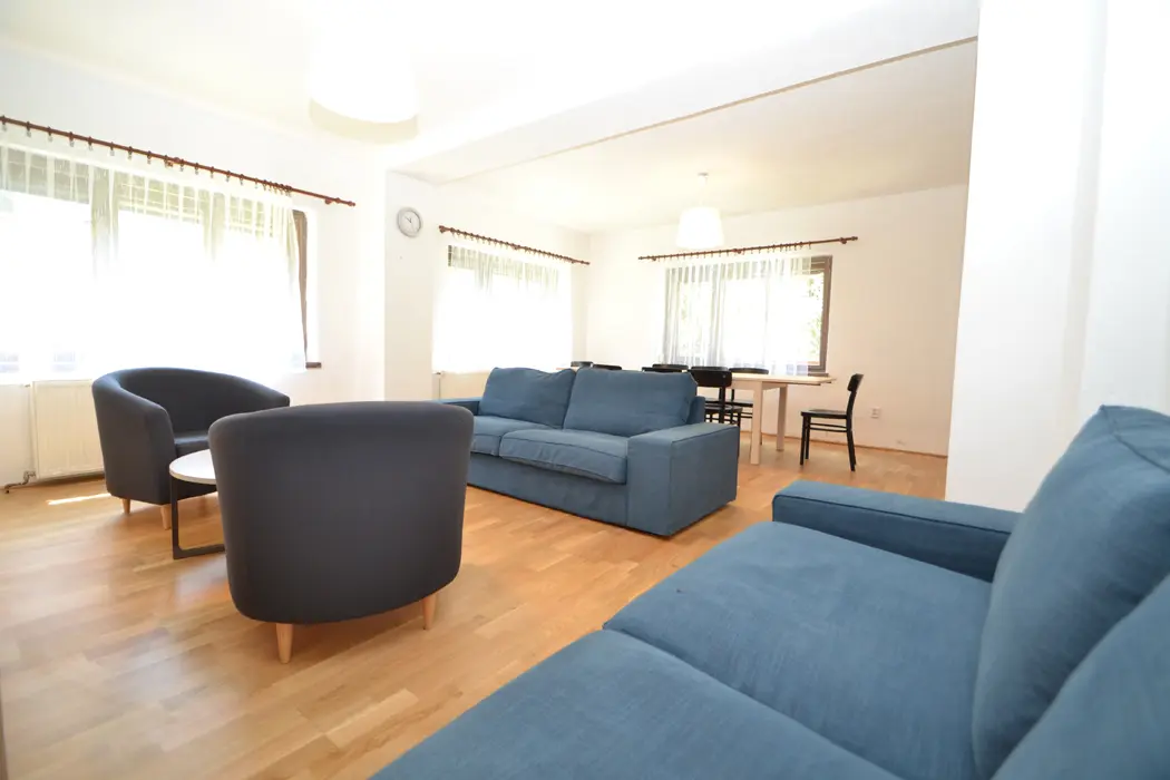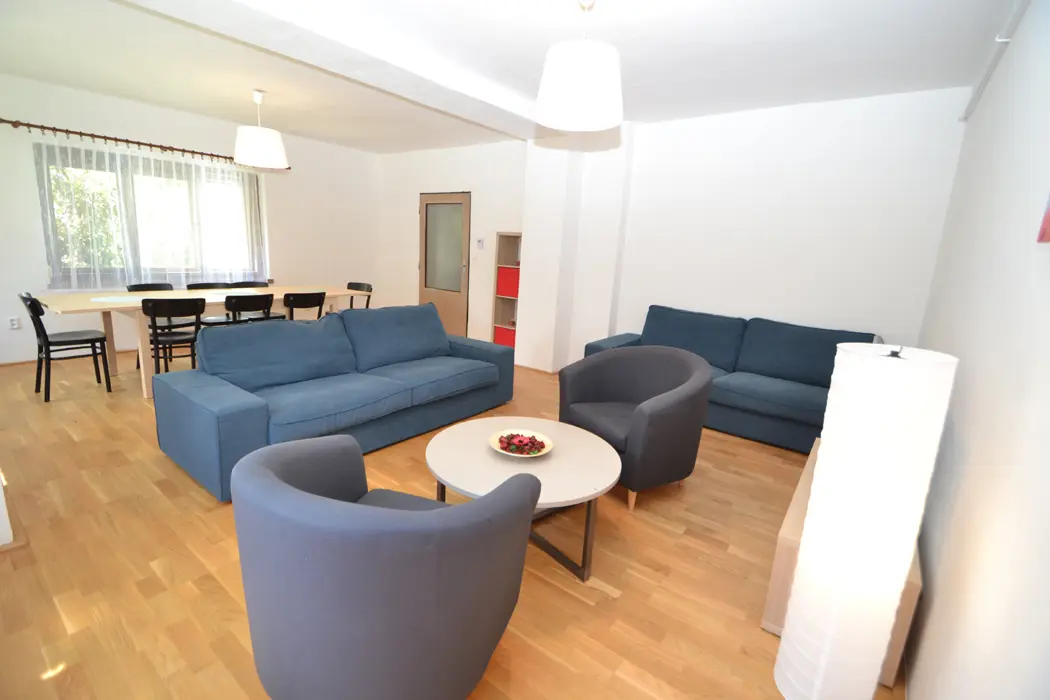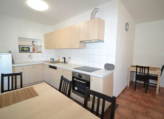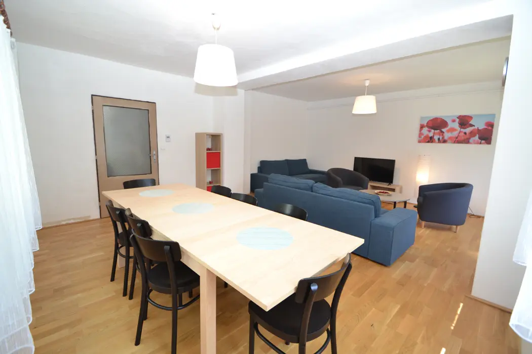 V přízemí velká společenská místnost, stoly, židle, sedací soupravy, spojeno s kuchyní - el. varná deska + sporák, lednice, varná konvice, mikrovlnka, myčka, nádobí na počet osob. V podkroví 4 samostatné ložnice - v každé 3-4 lůžka. Sociální zařízení - 3x sprcha, 3x samostatné WC. Topení - ústřední napojené na elektrokotel
