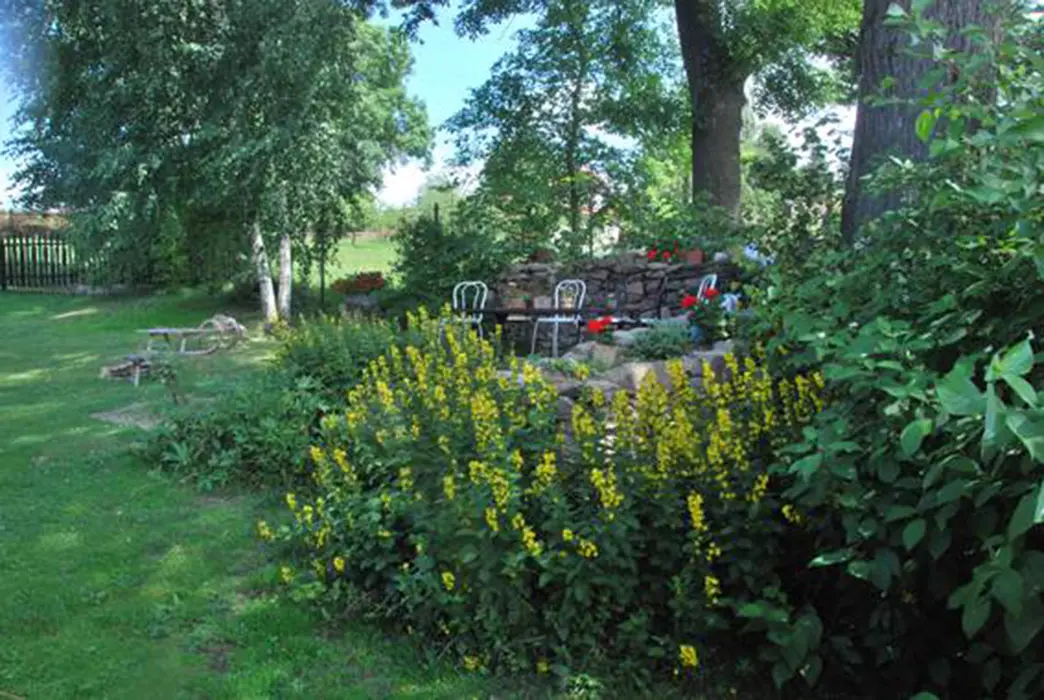 Částečně oplocený pozemek, možnost zapůjčení kol, nafukovací bazén, zahradní posezení, gril, pískoviště