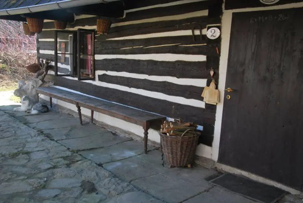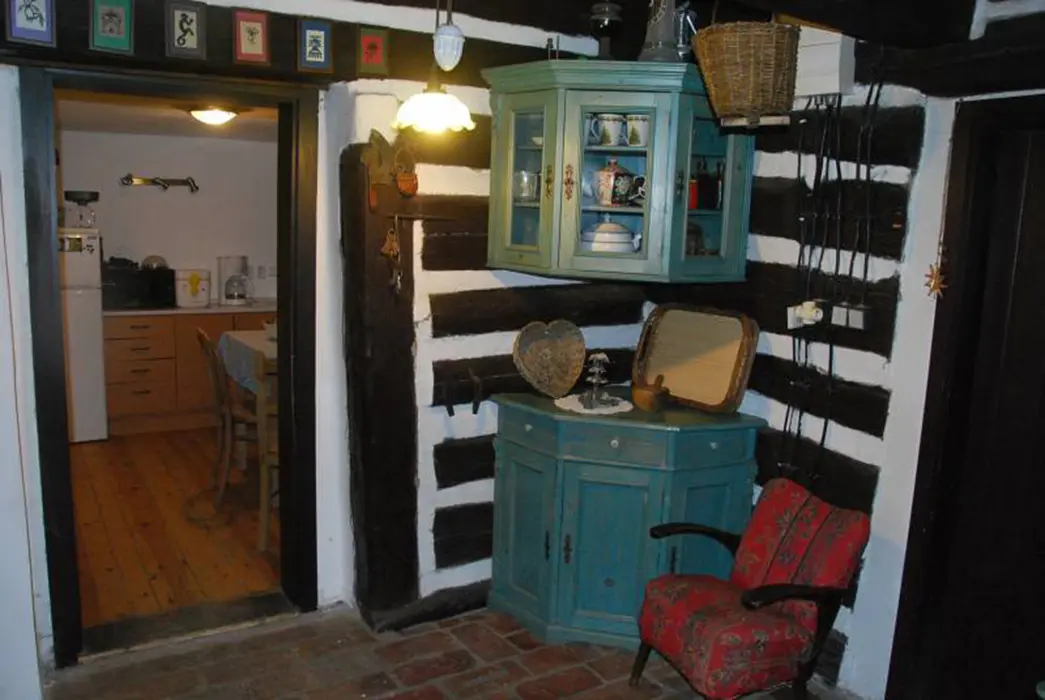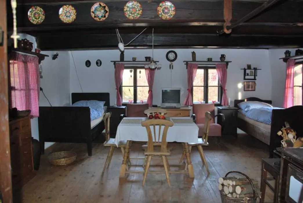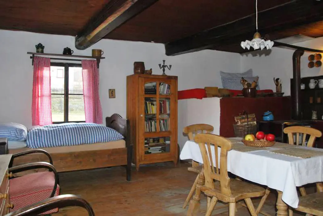 200 let stará roubenka po rekonstrukci - klasická světnice se spaním na peci - 1 lůžko, další 2 lůžka, kuchyně - jídelní stůl, lednice s mrazicím boxem, elektrický 4-plotýnkový sporák s el.troubou, plně vybavená kuchyňská linka, mikrovlnná trouba, el.robot, odšťavňovač, varná konvice, překapávač na kávu, žehlička. 1 ložnice 1x2 lůžka, k dispozici dětská postýlka a ohrádka. Sociální zařízení - koupelna s vanou a umyvadlem + WC v koupelně. Topení - kachlový sporák na dřevo, ložnice, kuchyně i koupelna jsou vytápěny radiátory elektrokotle.