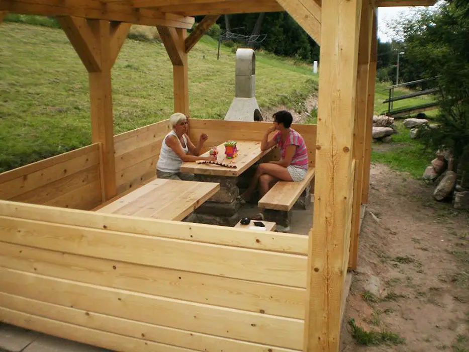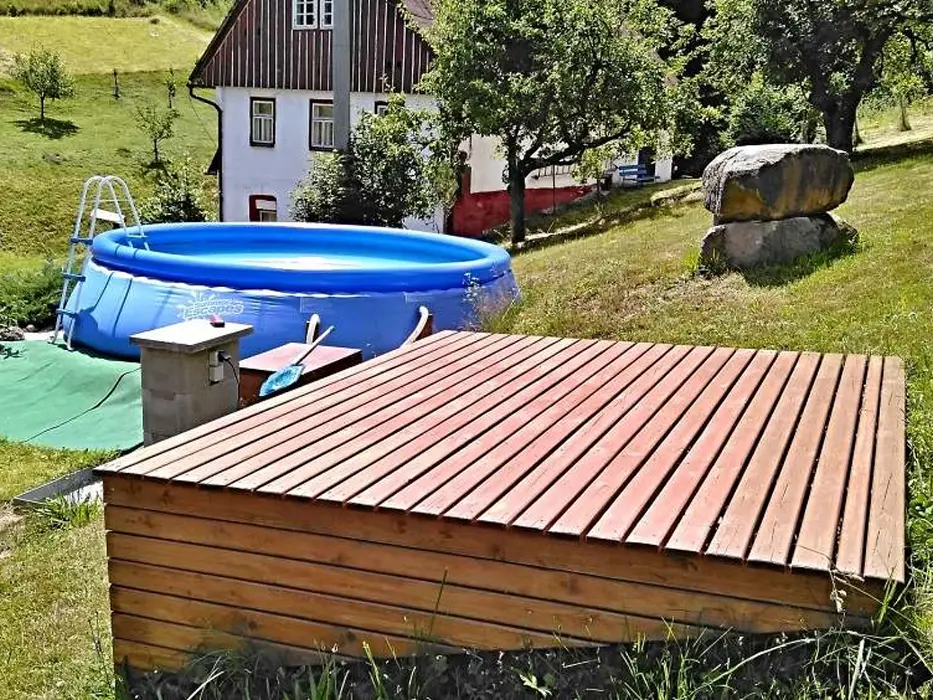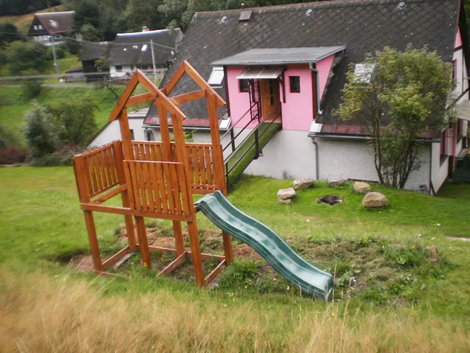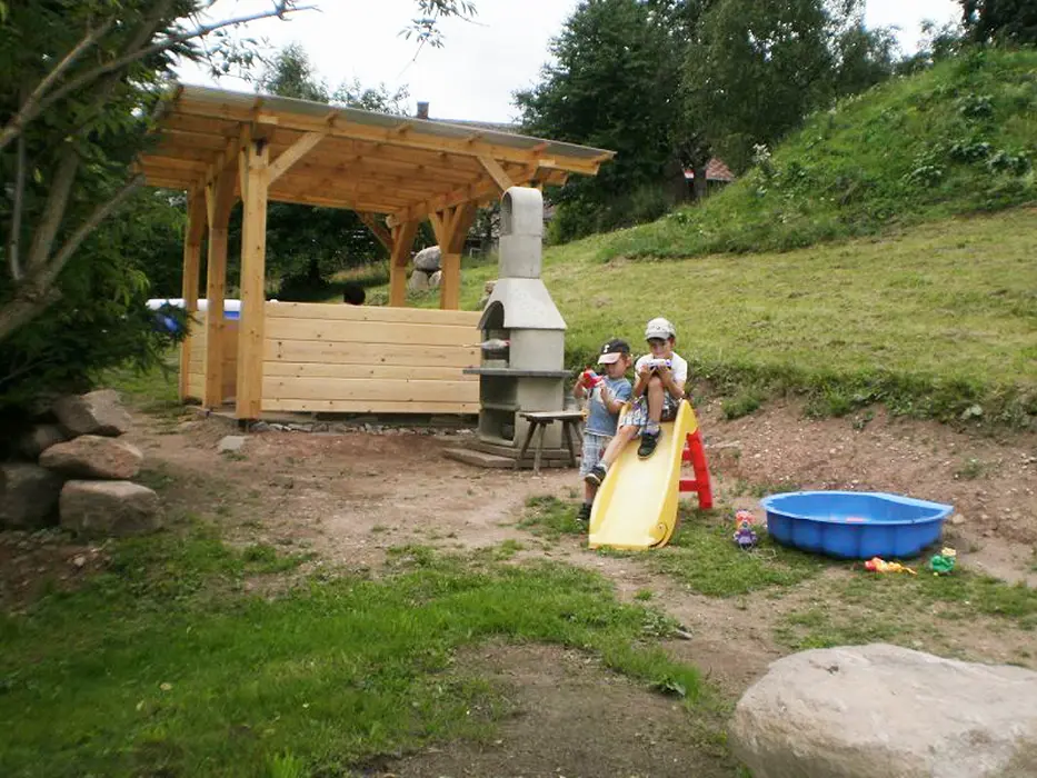 Na velkém pozemku - altán s venkovním posezením, zahradní krb, přenosný gril, ohniště, bazén o průměru 4,6 m a hloubce 0,9 m, elektronické šipky, pro děti - dětská skluzavka, houpačka, prolézačka a domeček pro děti