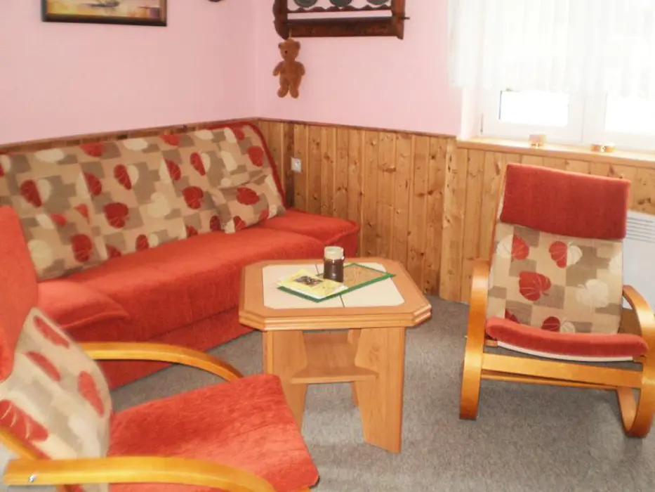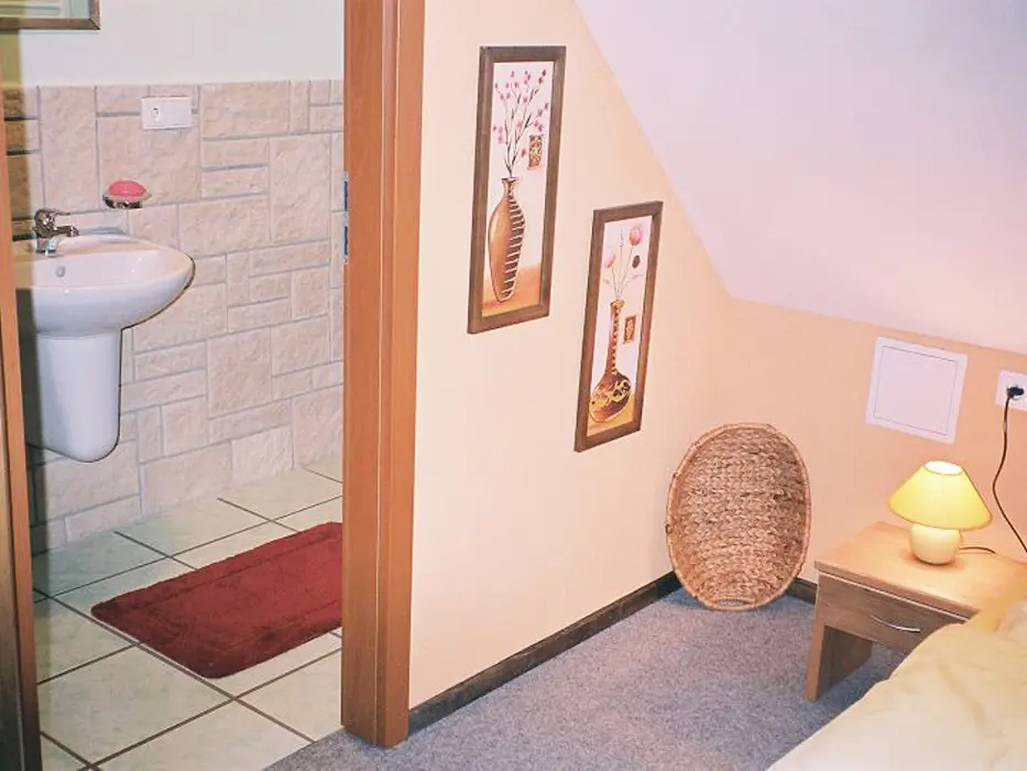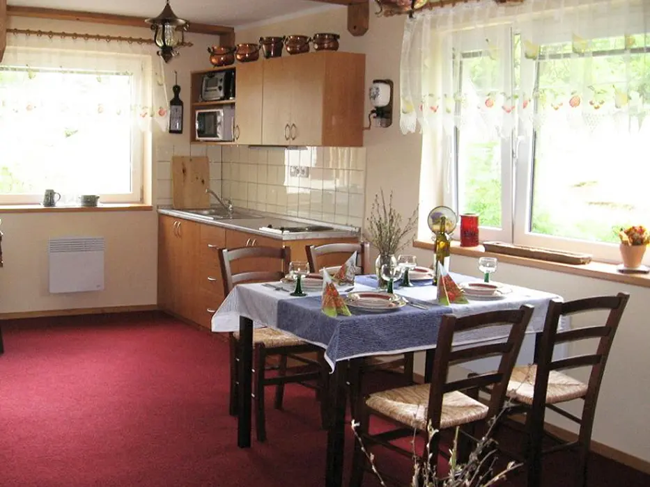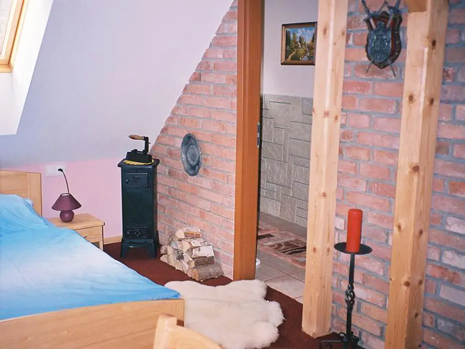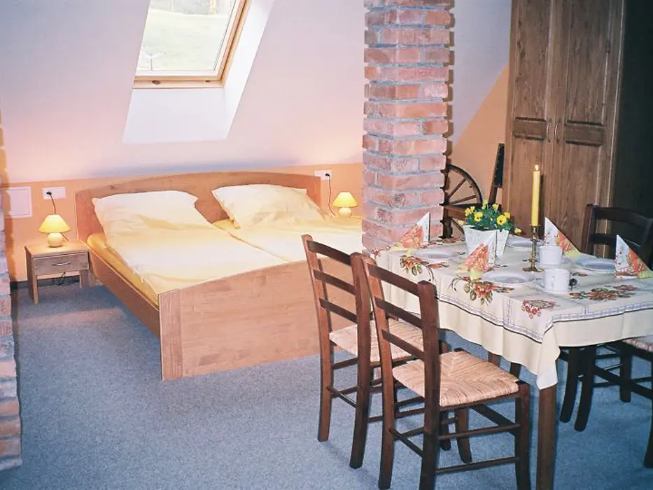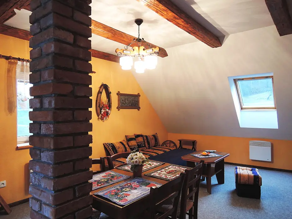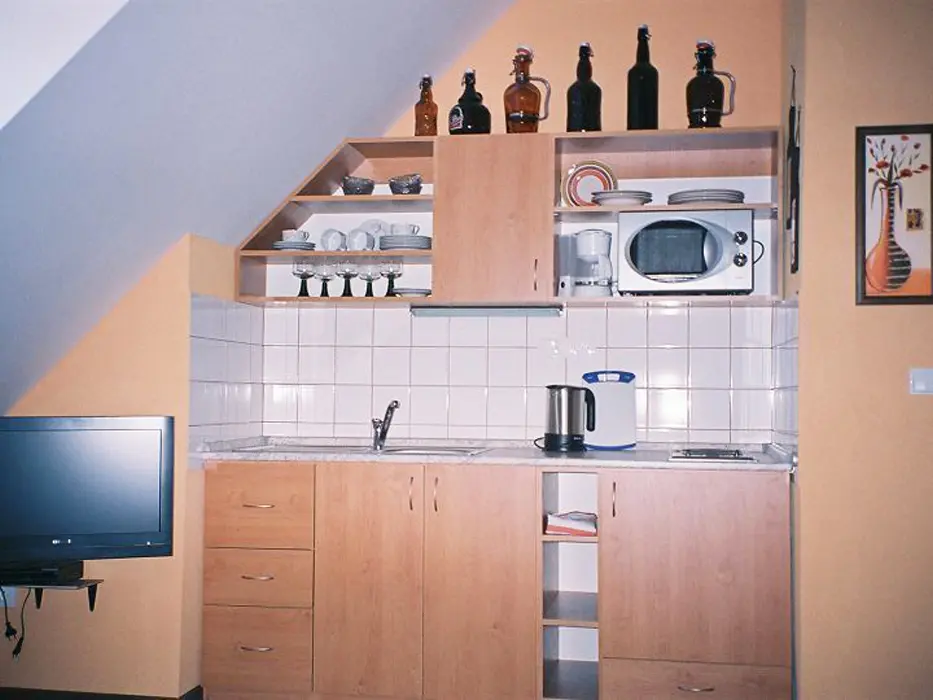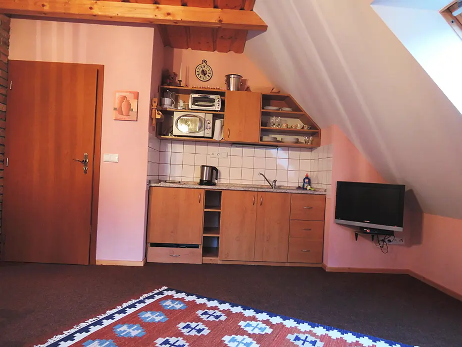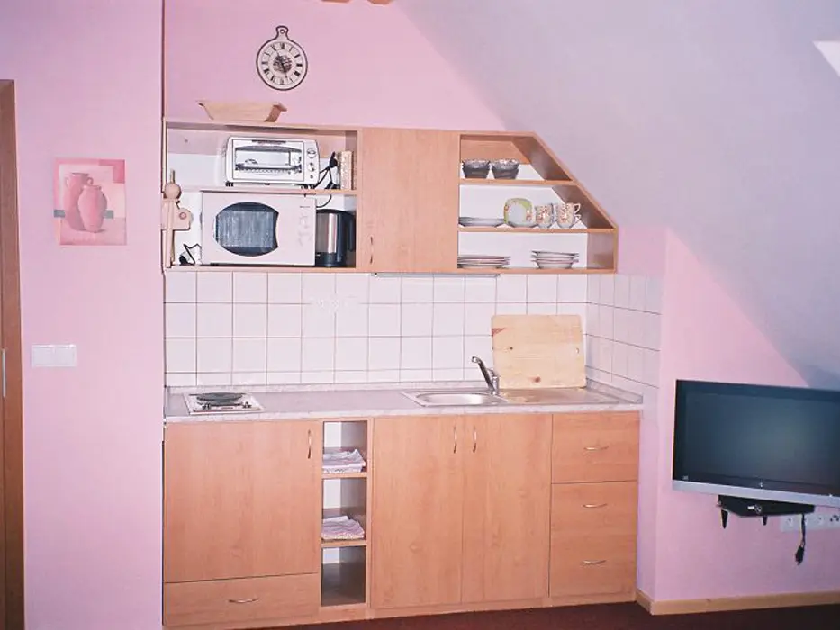2 studia v podkroví - každé: kuchyňský a jídelní kout - el. vařič, malá trouba, mikrovlnka, varná konvice, lednice, nádobí, TV, SAT. 2 lůžka + rozkládací gauč pro 1 - 2 osoby. Soc. zařízení - koupelna se sprchovým koutem, umyvadlo, WC. Topení - el. přímotopy