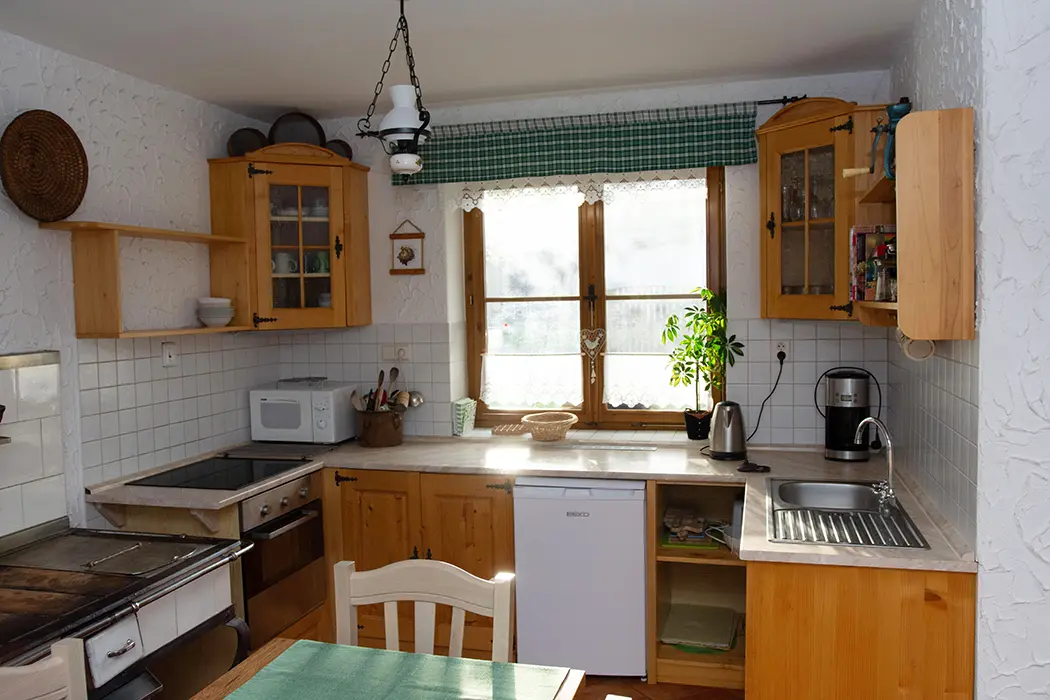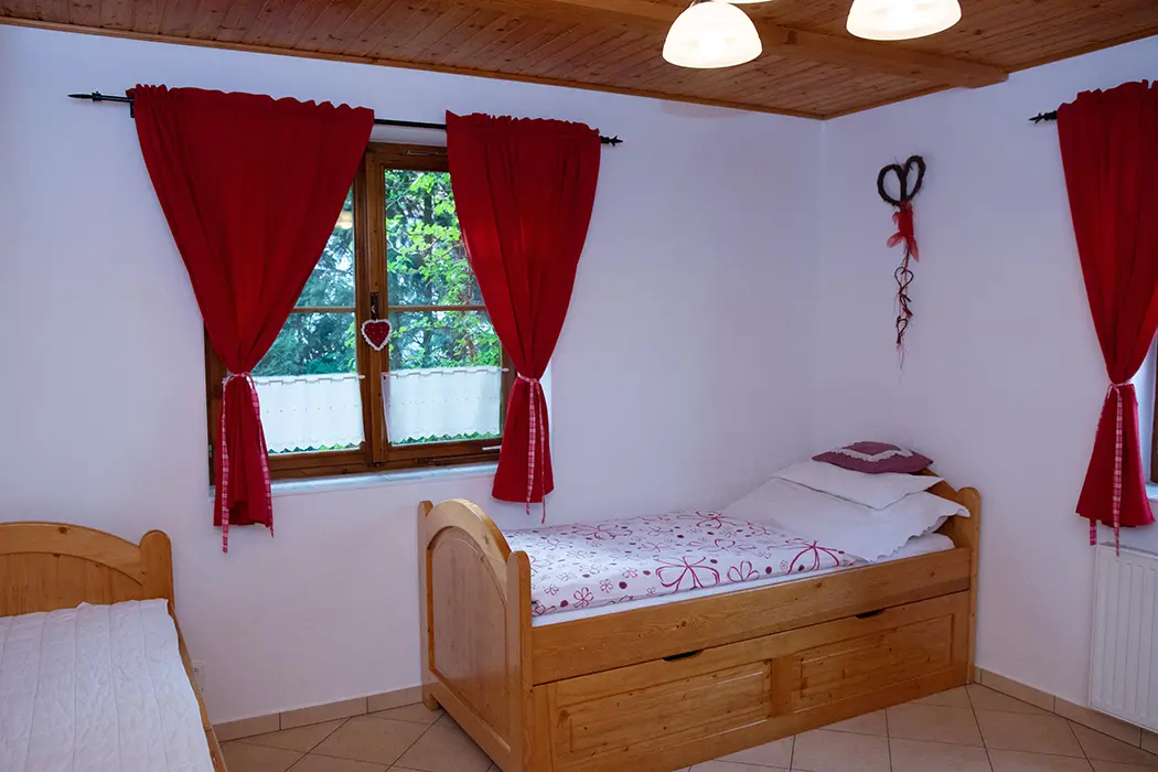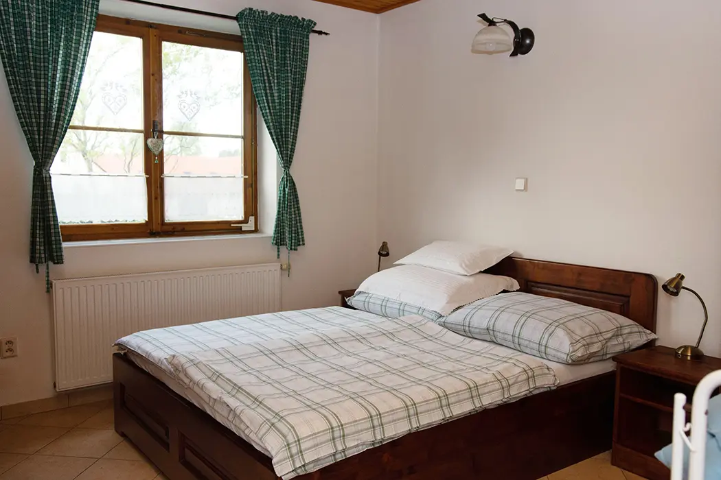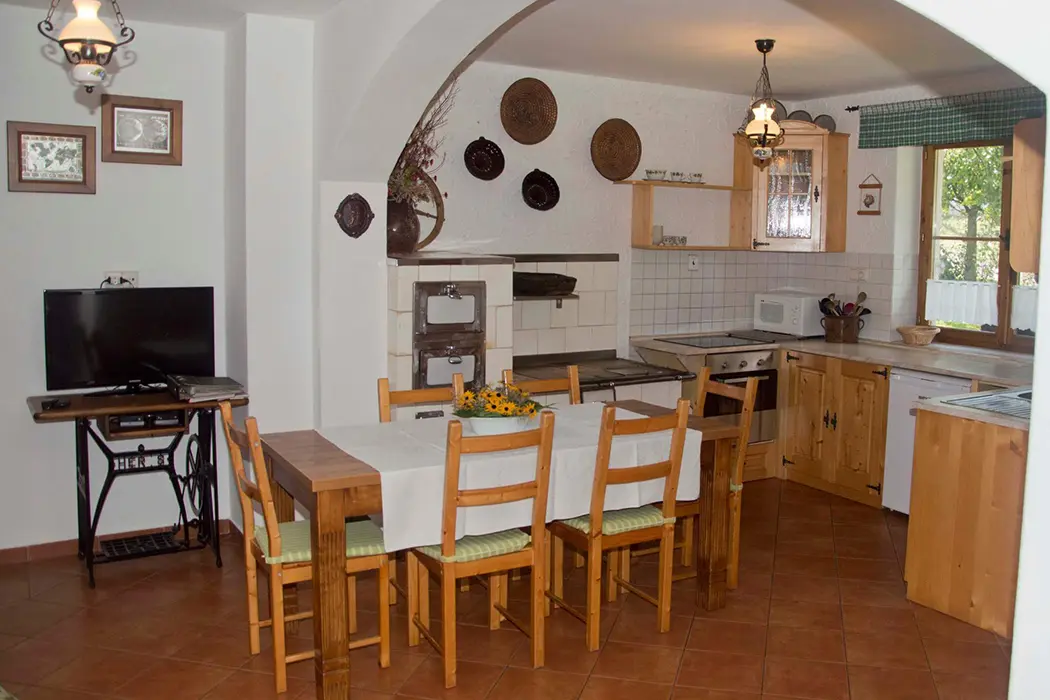 Vstupní chodbička, prostorná kuchyně - klasická kachlová kamna, el. sklokeramická varná deska, trouba, mikrovlnka, kávovar, lednice, myčka nádobí, dostatek nádobí, velký stůl a židle, BTV, rádio, sedací souprava. Dále navazuje obývací pokoj s posezením u krbových kamen, rohová lavice, stůl a židle, rádio. 3 ložnice 1x2, 1x2+1, 1x3 lůžka. Po domluvě dětská postýka a židlička. Koupelna s rohovou vanou a umyvadlem, zvlášť WC s umyvadlem. V další prostorné místnosti je zapuštený vnitřní bazén s protiproudem 6x3x1,5 m, sprcha, samostatné WC+bidet + umyvadlo. V další uzavřené části sauna - za poplatek a po předchozí domluvě s majitelem. Topení - centrální ústřední + podlahové topení u bazénu a v koupelně.