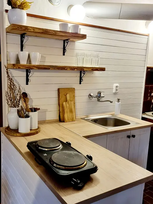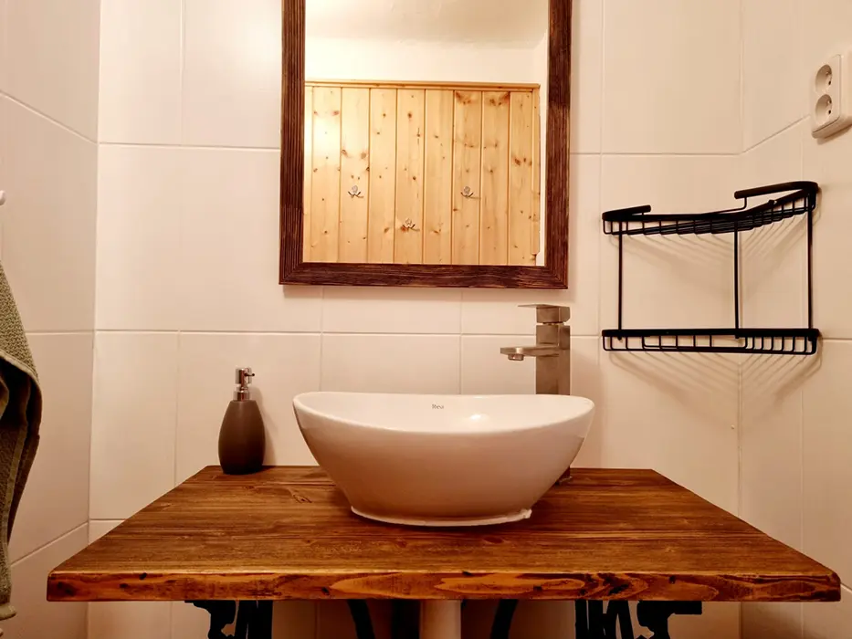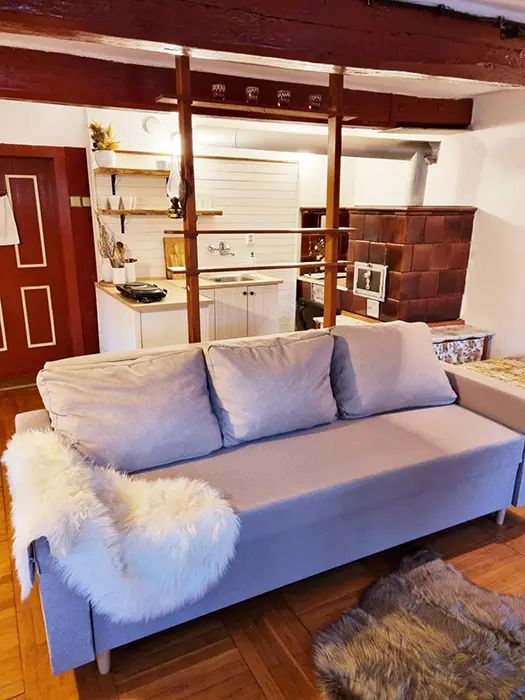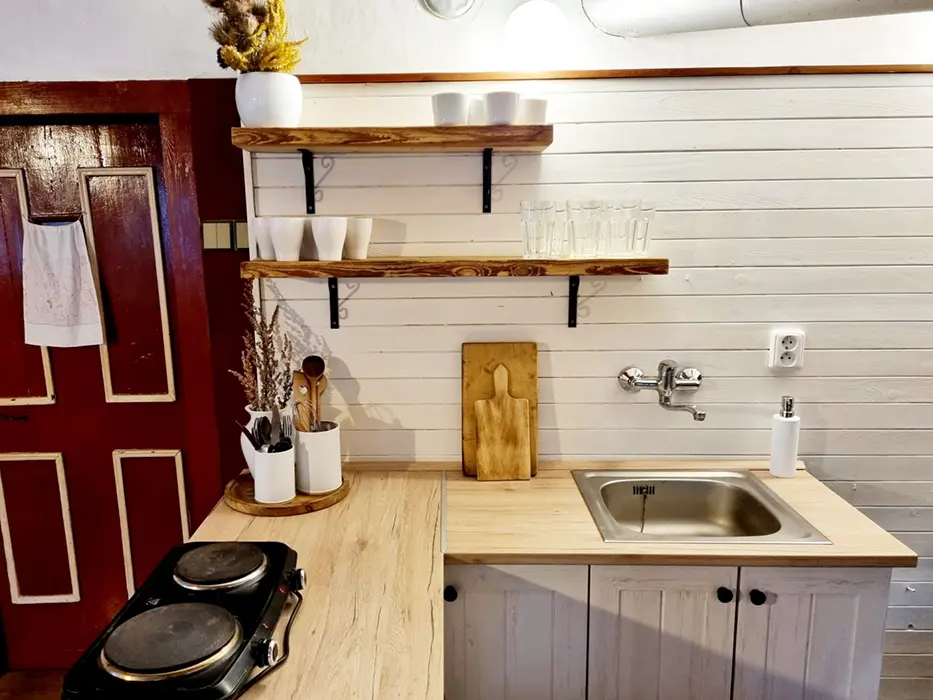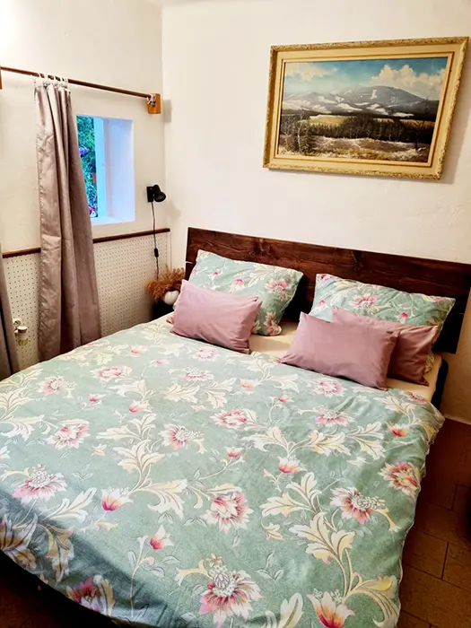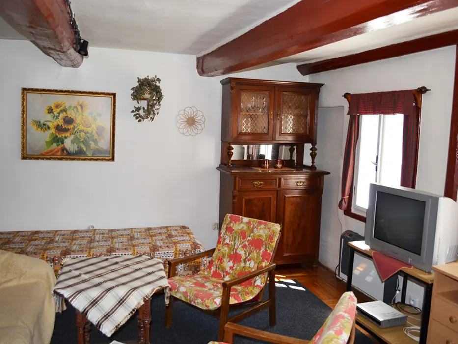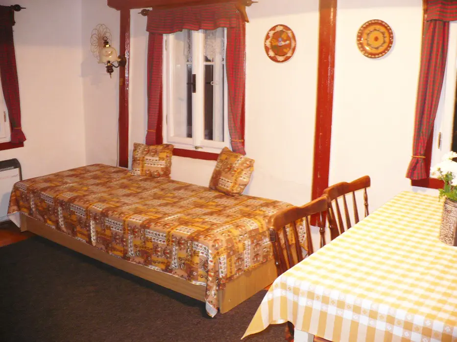 Větší obytná místnost s kuchyňkou - dvouplotýnkový el. vařič, varná konvice, mikrovlnka, lednice, základní nádobí, jídelní stůl, křesla, sedací souprava - 1 přistýlka, 2 válendy, TV, SAT, psací stůl. 1 ložnice 1x2 lůžka. Soc. zařízení - vana + sprchový kout, umyvadlo, samostatné WC. Topení el. přímotopy
