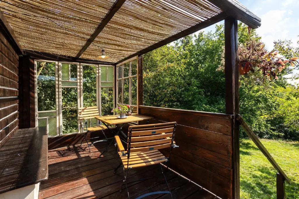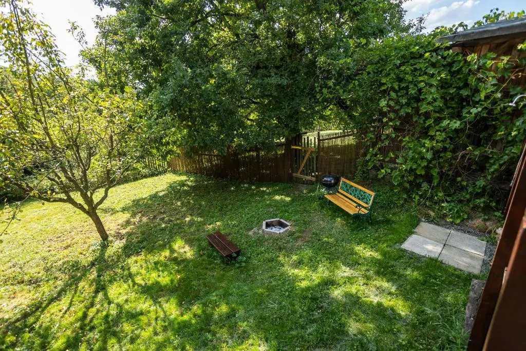 Na oploceném pozemnku je venkovní ohniště, lavička, kryté posezení - zahradní nábytek