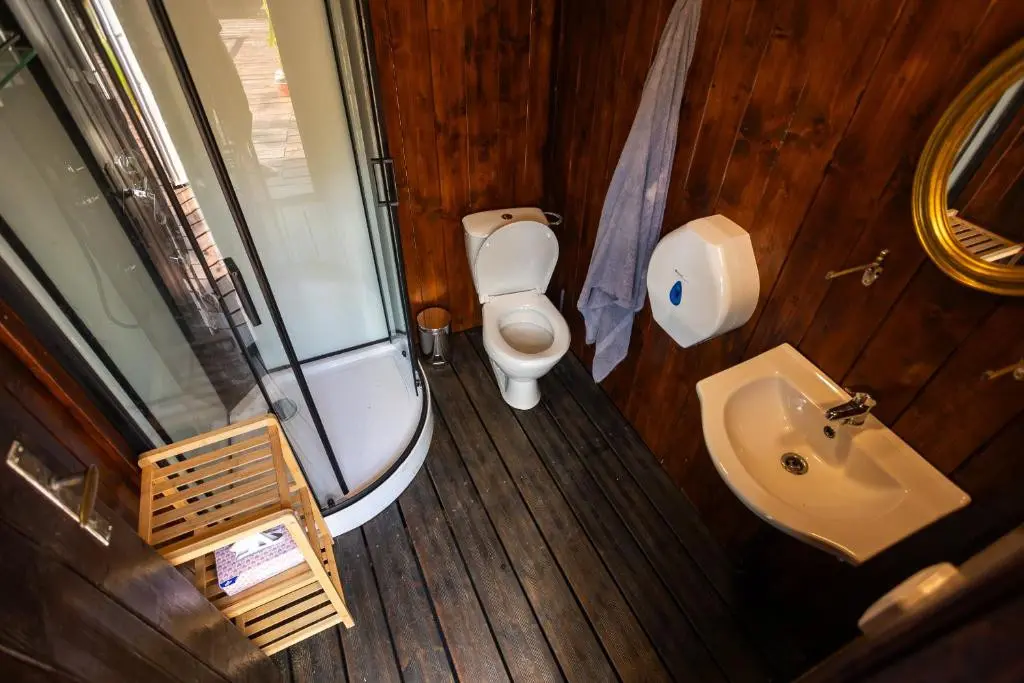" Maringotka " nabízí ubytování v jednom prostoru - obytná část spojená s kuchyní - rozkládací sedačka - 3 lůžka, jídelní stůl a židle, el. varná deska, lednice, varná konvice, nádobí. 1 ložnice - 1x2 lůžka - uzavřená závěsem. Soc. zařízení - přístup z venku - sprchový kout, umyvadlo a WC. Topení - zajištěno klimatizací