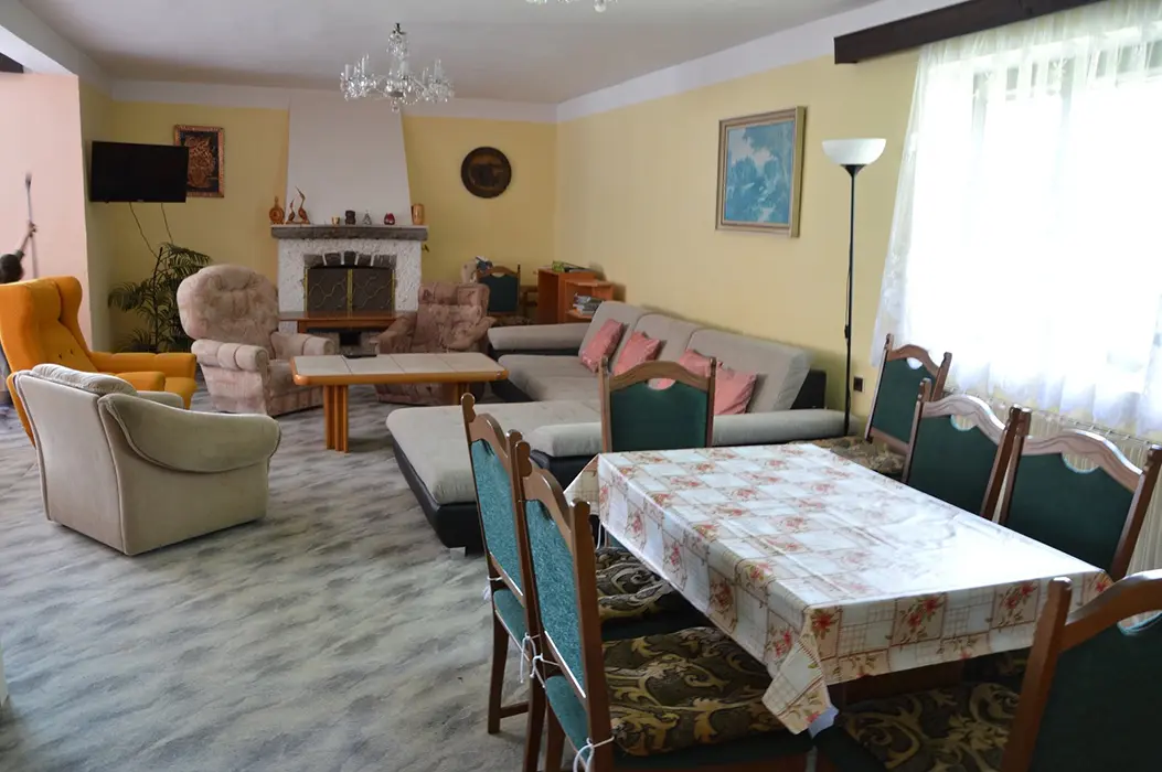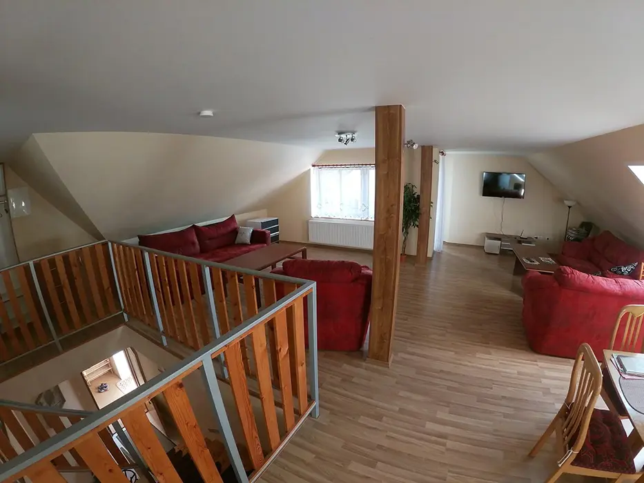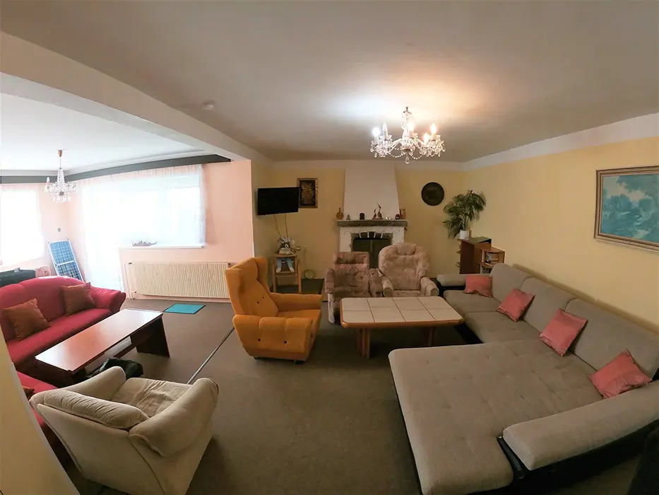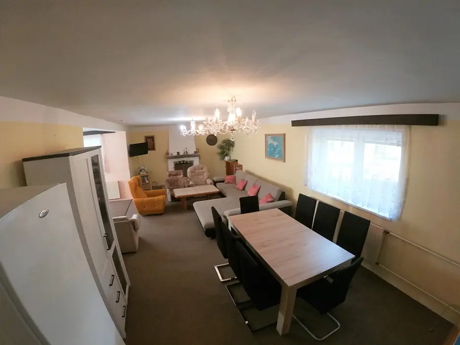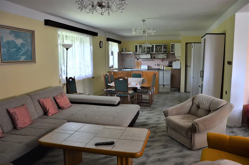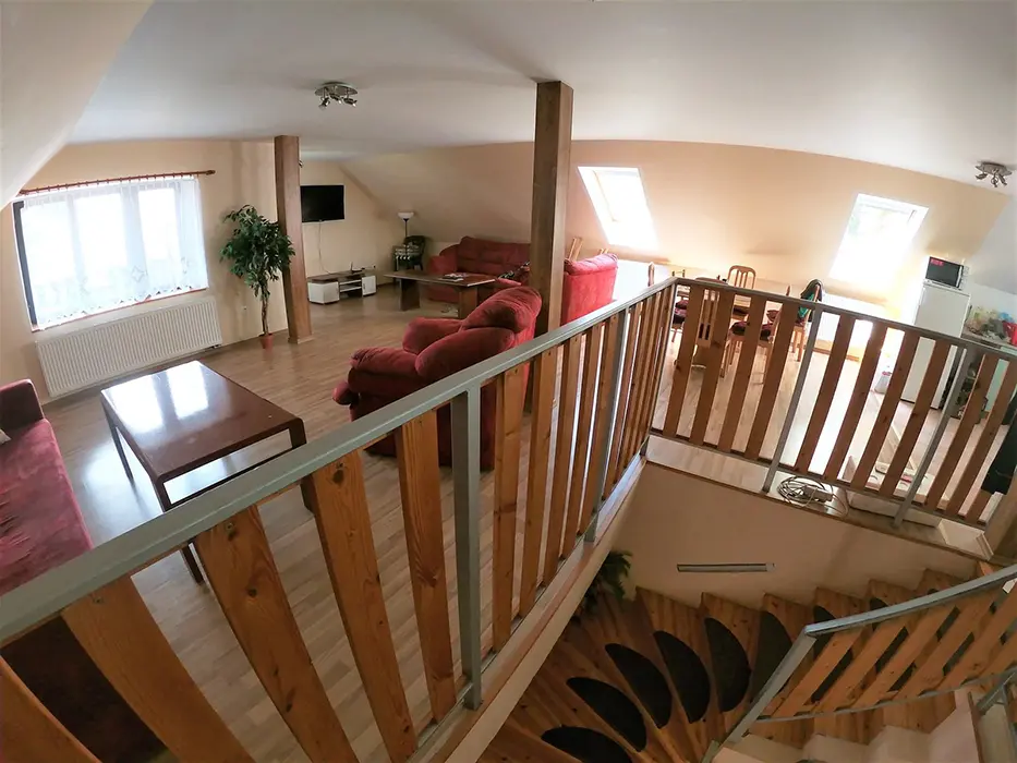 V přízemí: obývací pokoj s posezením - možnost 1 přistýlky, TV, SAT, HIFI věž, spojený s kuchyní - mikrovlnka, myčka, varná konvice, gril, kávovar, topinkovač, el. sporák, lednice, mrazák, nádobí, jídelní stůl a židle. 2 ložnice - 1x2, 1x5 lůžek. Soc. zařízení - vana, k dispozici pračka, samostatné WC. V patře: kuchyně - mikrovlnka, varná konvice, gril, kávovar, topinkovač, varný panel PB, lednice, mrazák, nádobí. 3 ložnice - 1x4, 2x2 lůžka. Soc. zařízení - koupelna se sprchou, umyvadlo, samostatné WC. Topení ústřední