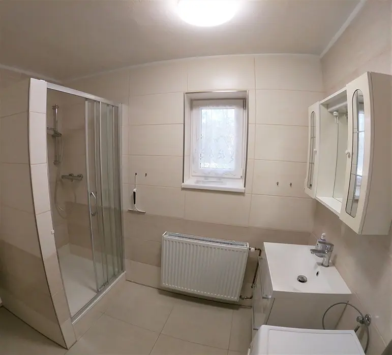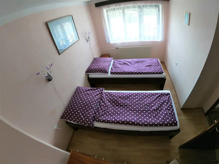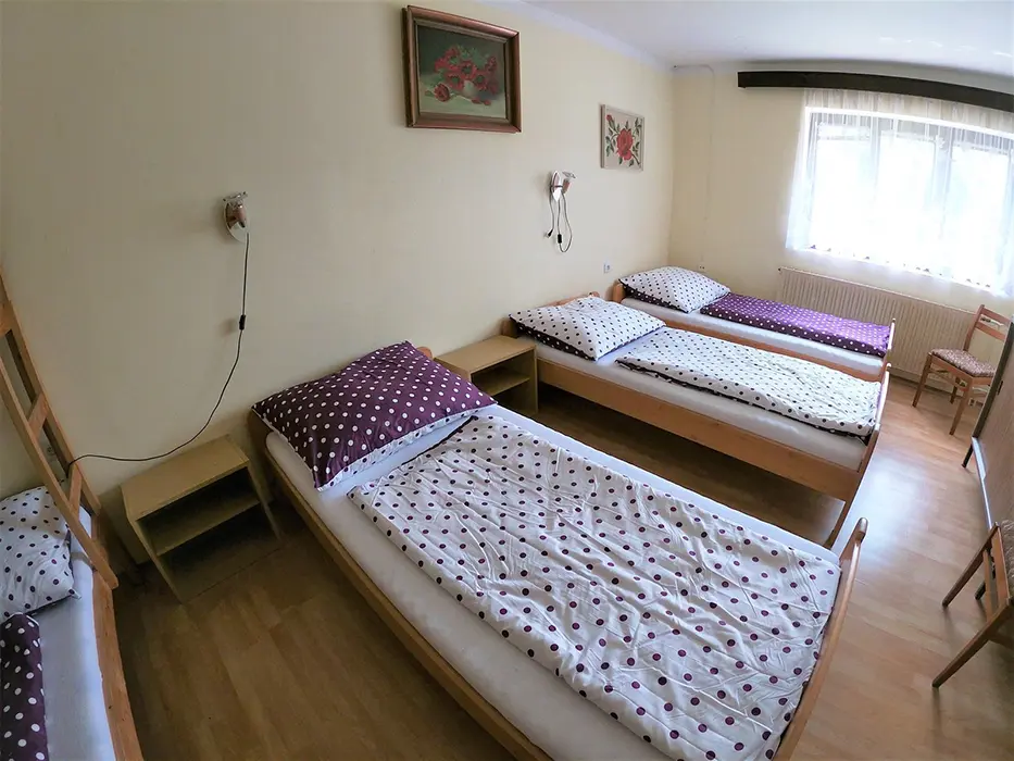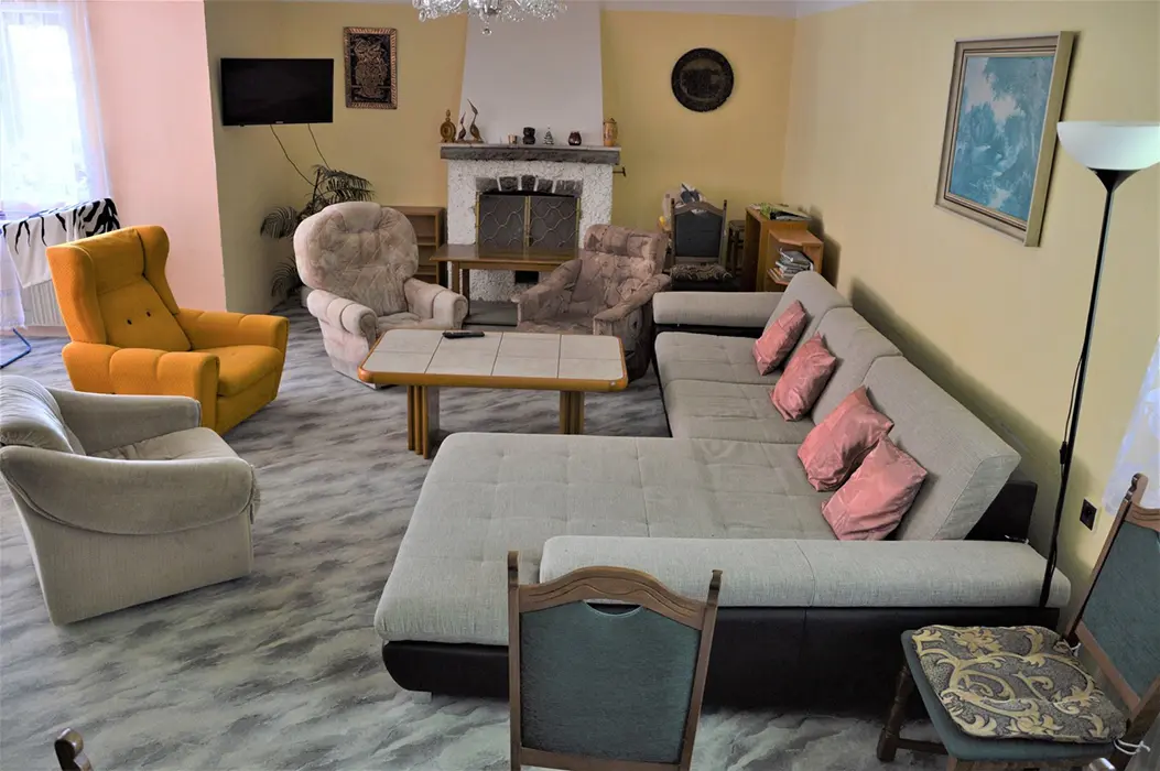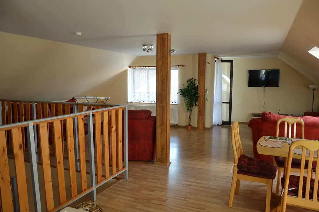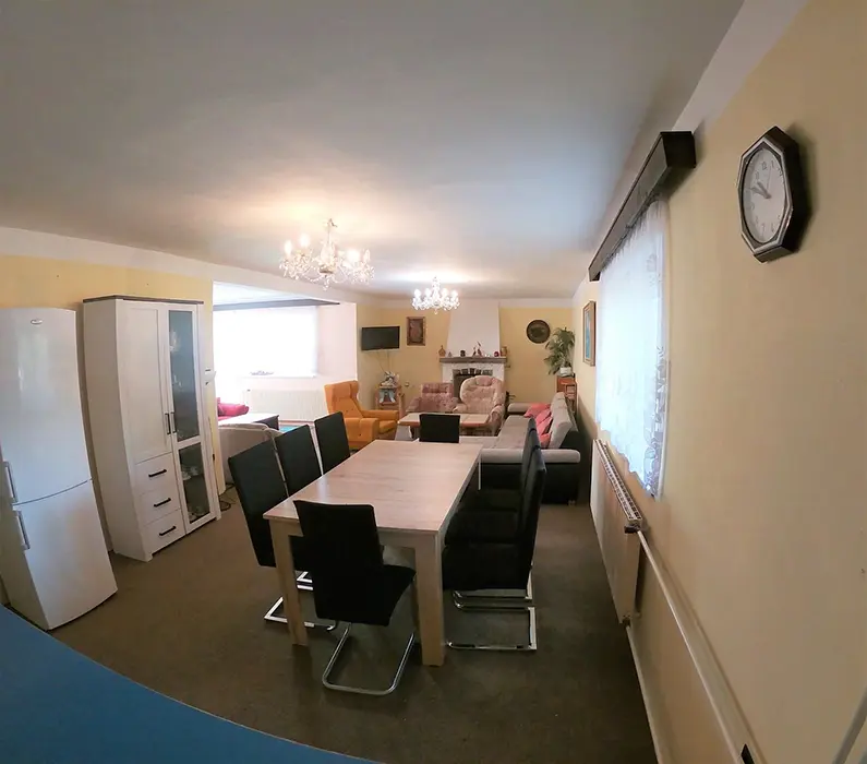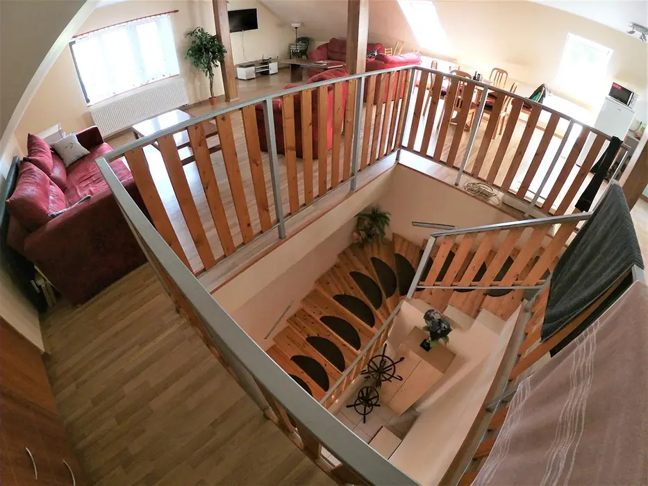 V přízemí: obývací pokoj s posezením - možnost 1 přistýlky, TV, SAT, HIFI věž, spojený s kuchyní - mikrovlnka, myčka, varná konvice, gril, kávovar, topinkovač, el. sporák, lednice, mrazák, nádobí, jídelní stůl a židle. 2 ložnice - 1x2, 1x5 lůžek. Soc. zařízení - vana, k dispozici pračka, samostatné WC. V patře: kuchyně - mikrovlnka, varná konvice, gril, kávovar, topinkovač, varný panel PB, lednice, mrazák, nádobí. 3 ložnice - 1x4, 2x2 lůžka. Soc. zařízení - koupelna se sprchou, umyvadlo, samostatné WC. Topení ústřední